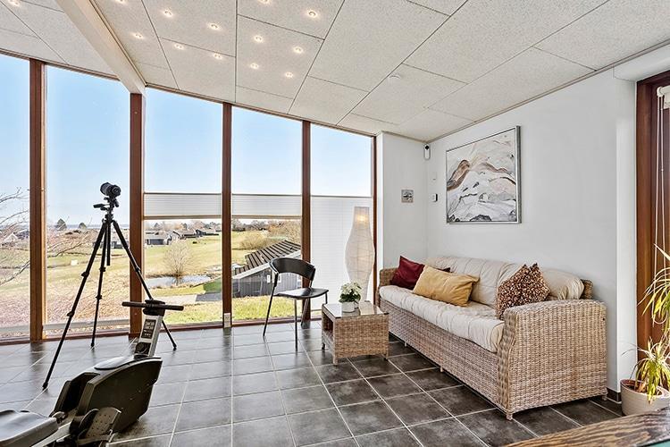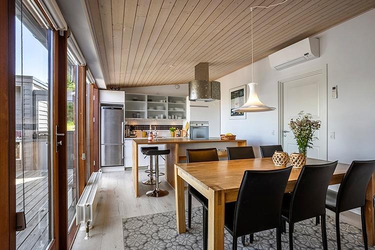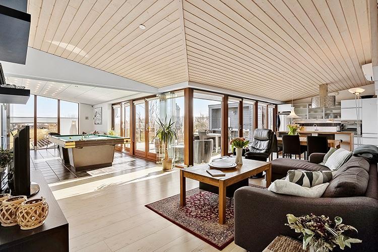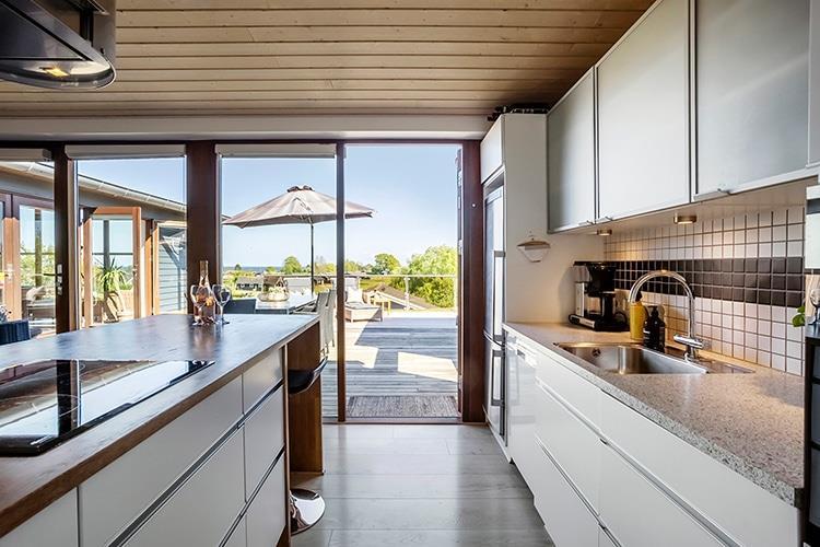 Huset er indrettet med en skøn, stor vinkelstue i forbindelse med det lækre, åbne køkken, der selvfølgelig har både opvaskemaskine og mikrobølgeovn. Der er udgang til terrassen fra køkkenet.