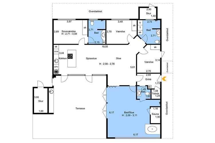 Her er to badeværelser med brusebad og toilet. Huset har også både vaskemaskine og tørretumbler.