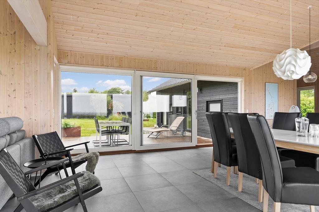 Ved siden af spiseområdet og stuen er der en havedør, som fører ud til en østvendt terrasse. Det er oplagt at tage måltiderne med udenfor og nyde udsigten til havet og den omkringliggende natur.