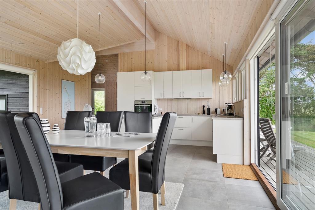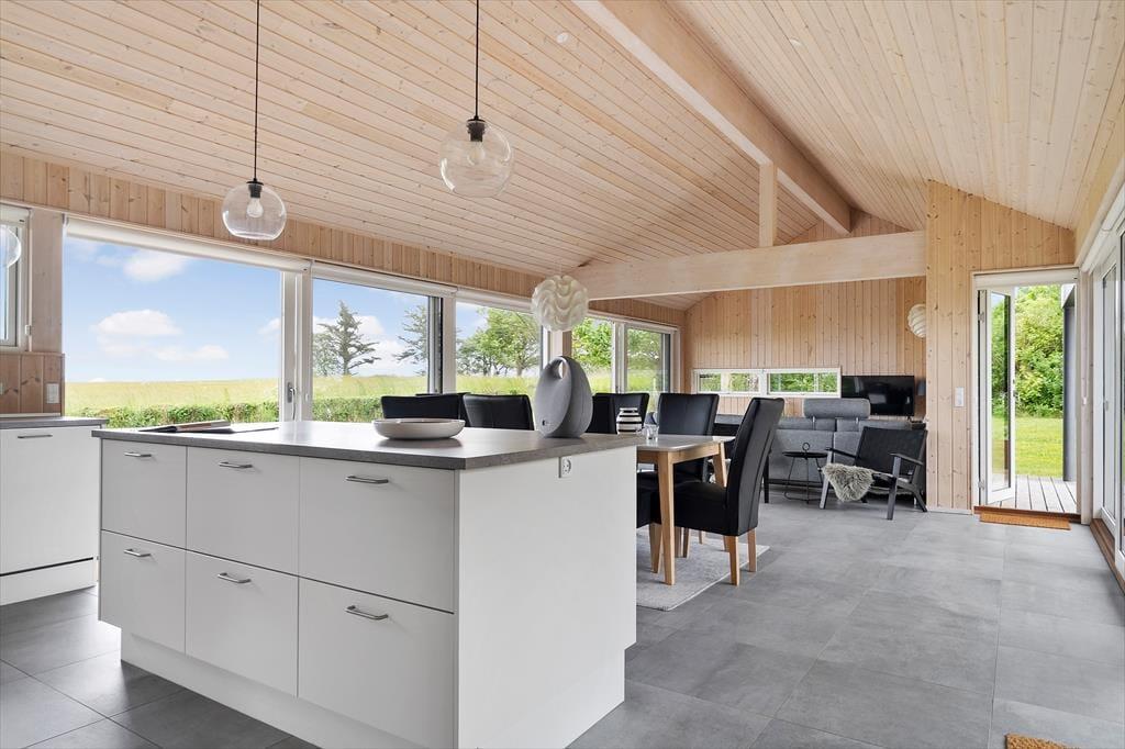 Stuen og køkkenet udgør husets samlingspunkt. Det åbne køkken gør det muligt at tilberede aftensmaden, mens du stadig kan snakke med dem, der hygger sig i stuen. Køkkenet er funktionelt og veludstyret med alle nødvendige faciliteter – og selvfølgelig udsigt til havet. Spisebordet er i forlængelse af køkkenet, og her er der plads til at spise sammen eller nyde et hyggeligt spil.