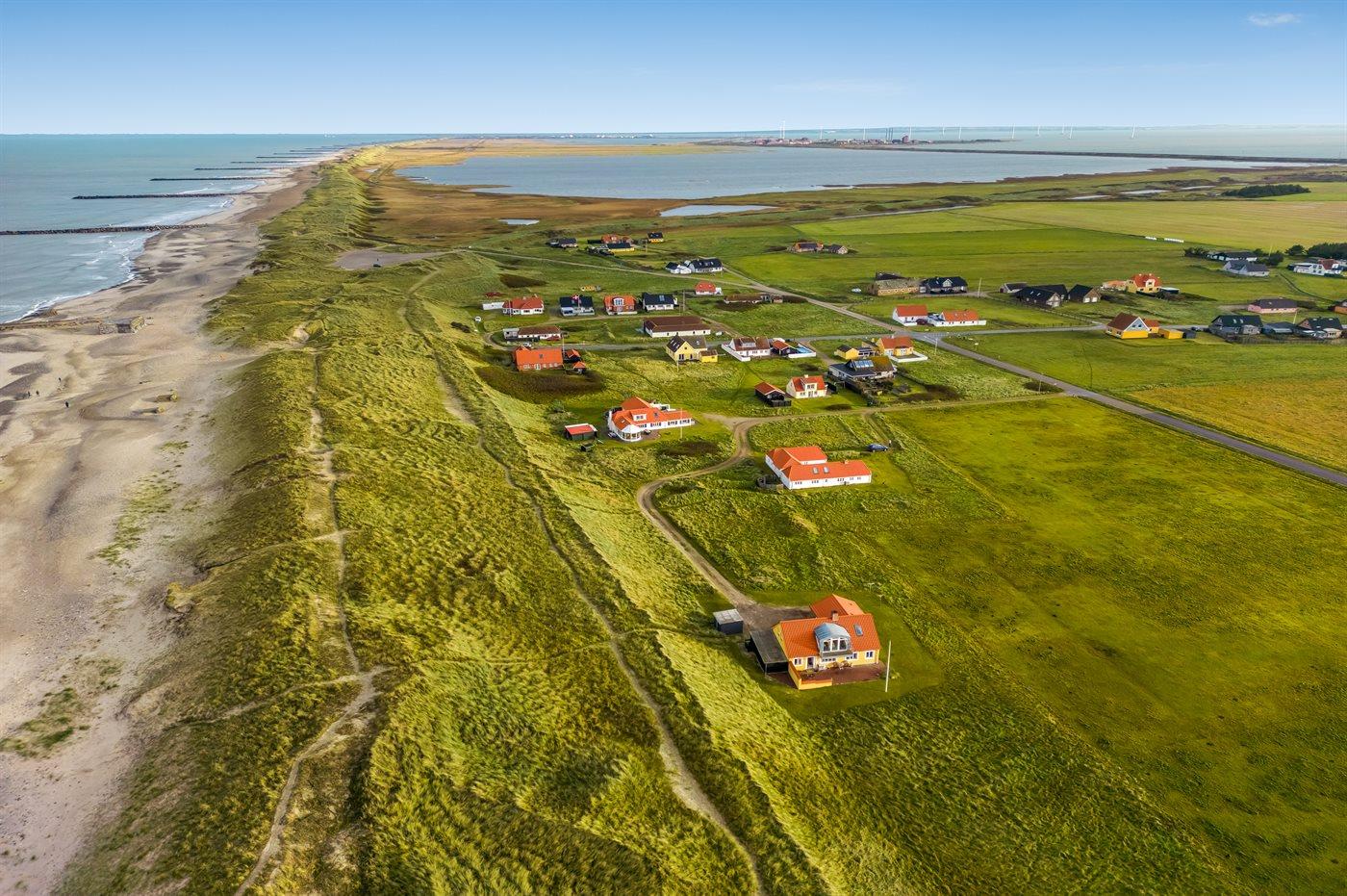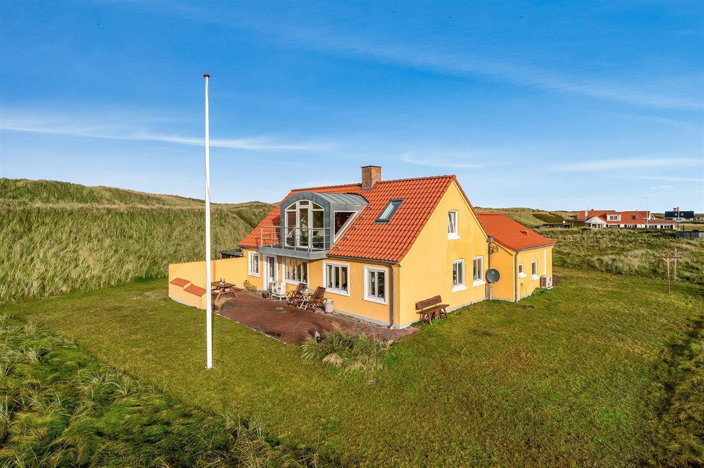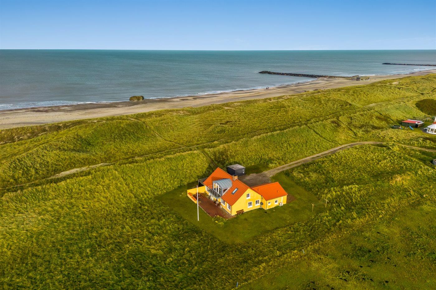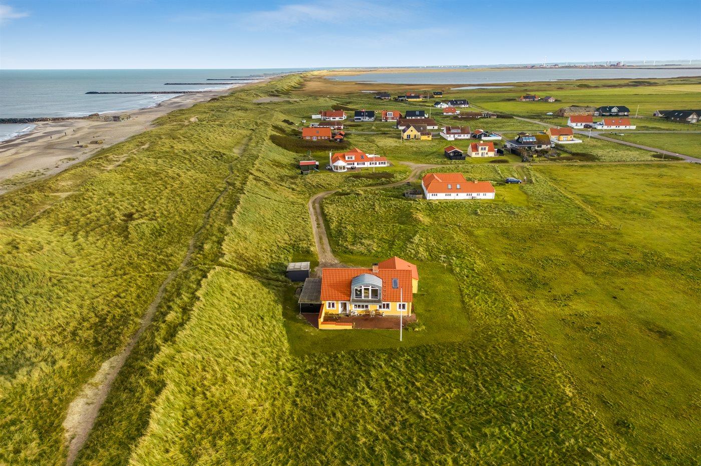 Dieses schöne und geräumige Ferienhaus liegt in der ersten Reihe zum Wasser, direkt hinter den hohen Dünen zum Strand und zur Nordsee. Das Haus liegt am Ende der Sackgasse in der ruhigen und landschaftlich reizvollen Gegend von Langerhuse, unmittelbar in der Nähe des Limfjordes. Das Haus ist liebevoll renoviert und gepflegt, mit einem hellen und gemütlichen Dekor und vom Wohnzimmer im ersten Stock gibt es einen schönen Blick auf die Umgebung, sowie Zugang zum Südbalkon. Zum Haus gehören mehrere schöne Terrassen, wo Sie sowohl Sonne als auch Schutz finden können.Die Treppe auf dem Grundstück führt durch die Dünen und direkt hinunter zum Strand und zum Meer.