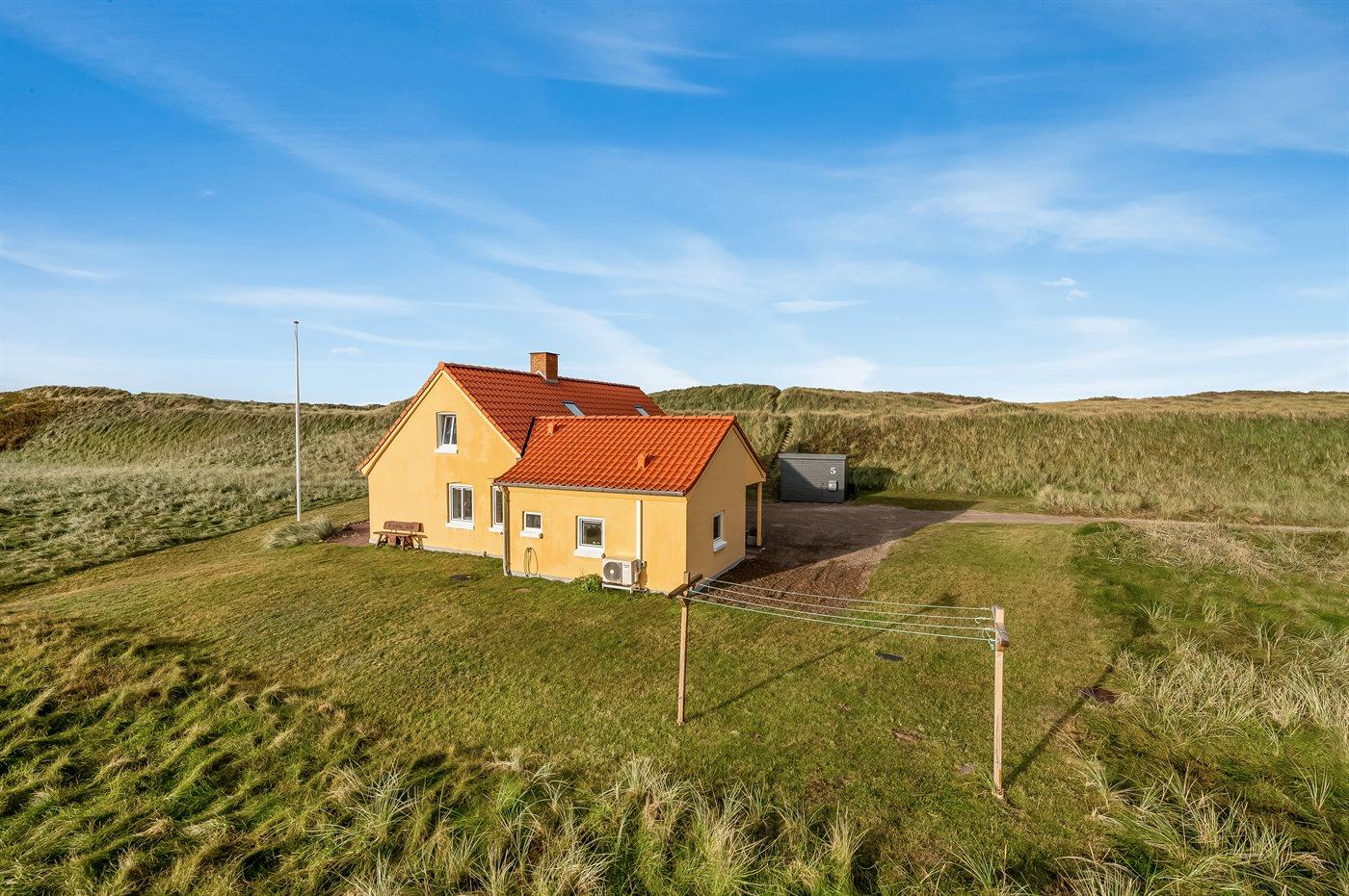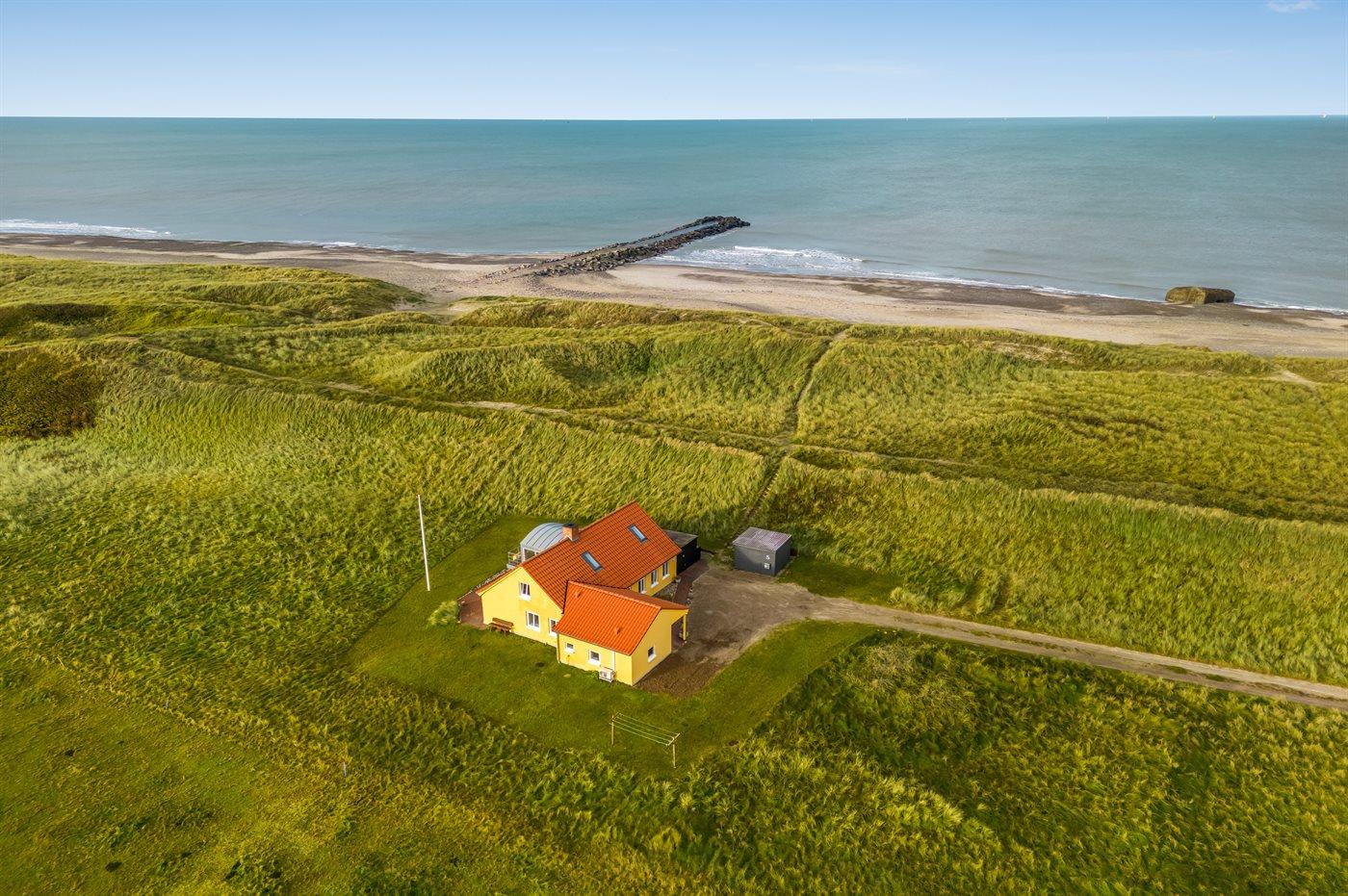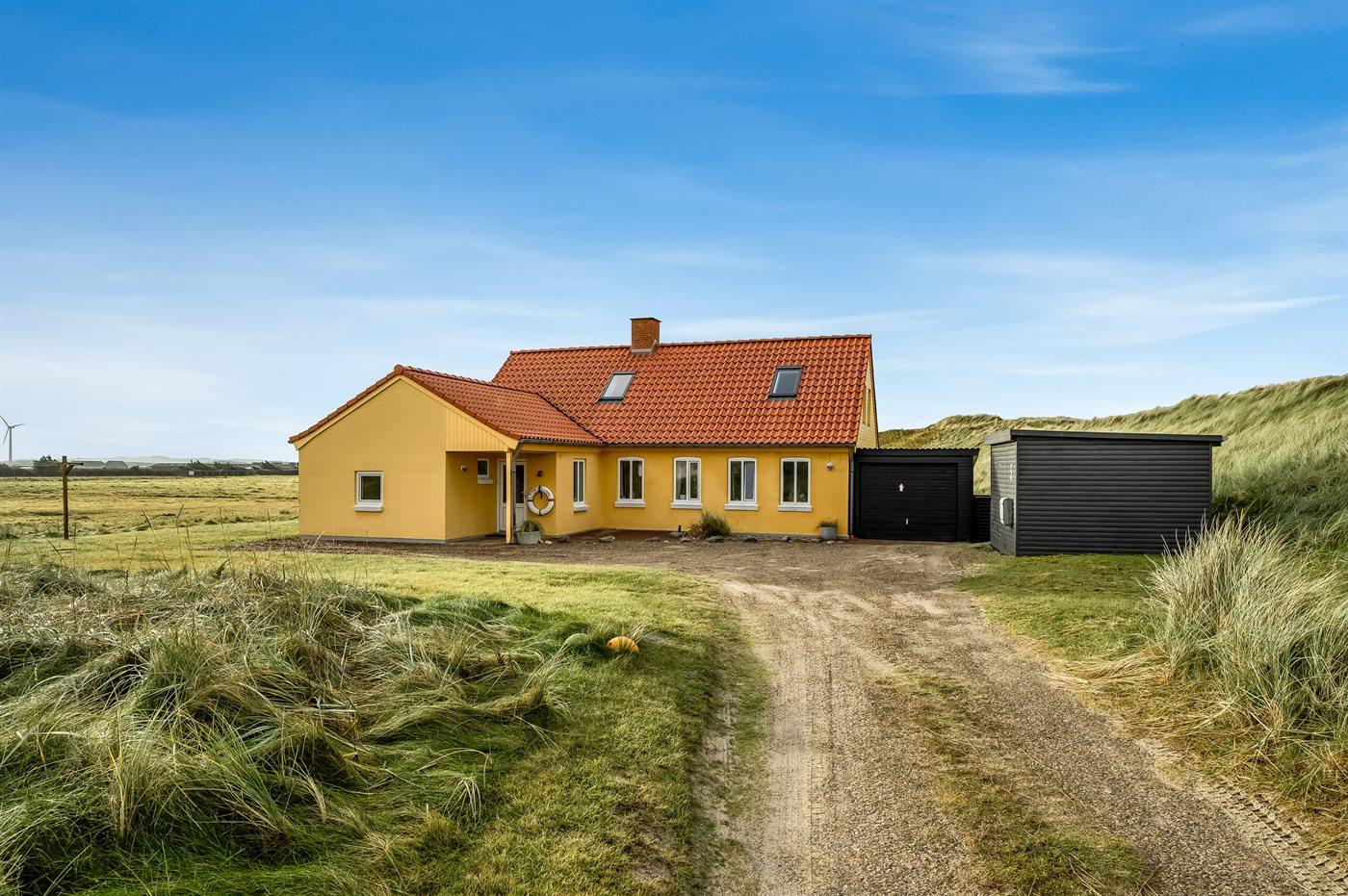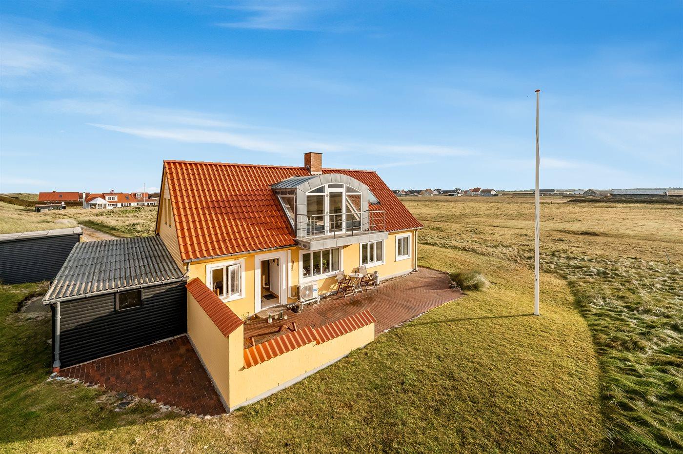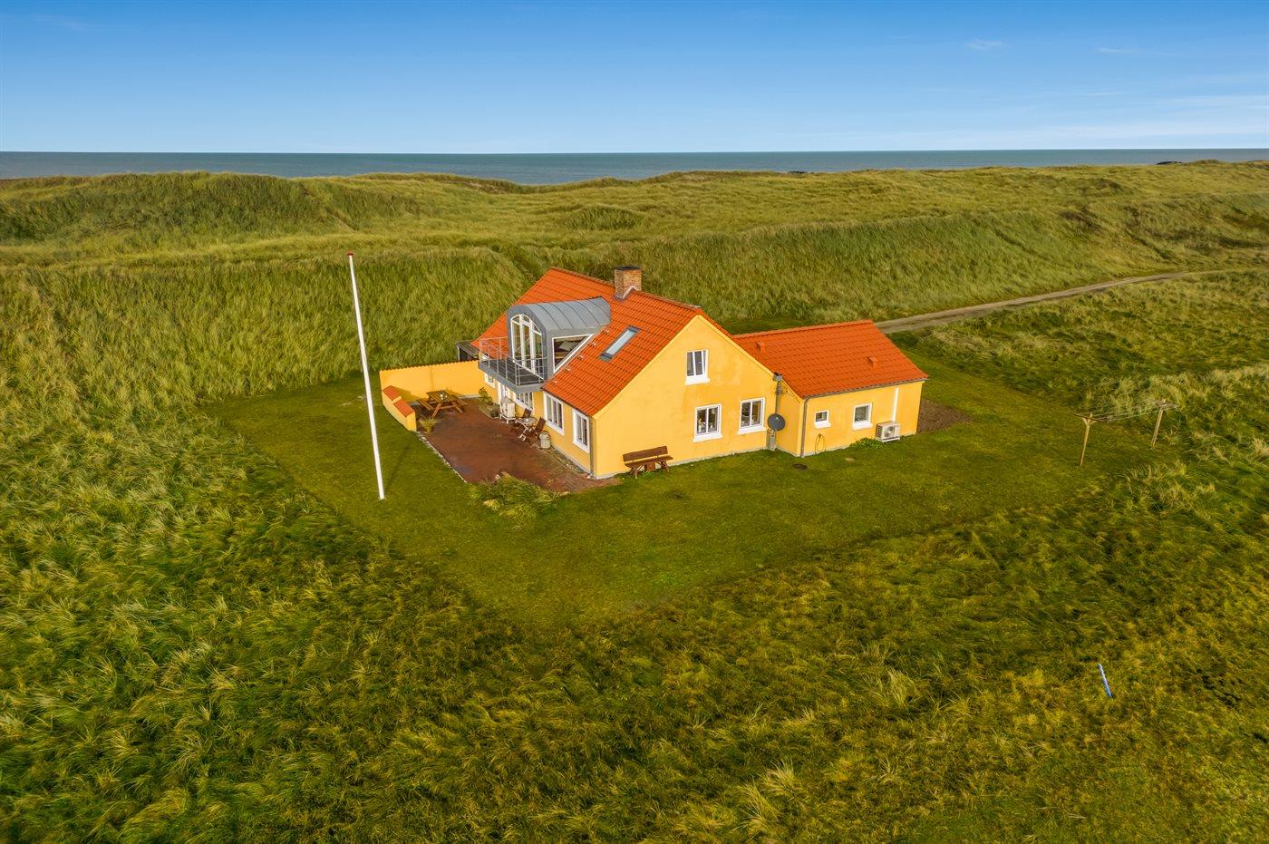 Dieses schöne und geräumige Ferienhaus liegt in der ersten Reihe zum Wasser, direkt hinter den hohen Dünen zum Strand und zur Nordsee. Das Haus liegt am Ende der Sackgasse in der ruhigen und landschaftlich reizvollen Gegend von Langerhuse, unmittelbar in der Nähe des Limfjordes. Das Haus ist liebevoll renoviert und gepflegt, mit einem hellen und gemütlichen Dekor und vom Wohnzimmer im ersten Stock gibt es einen schönen Blick auf die Umgebung, sowie Zugang zum Südbalkon. Zum Haus gehören mehrere schöne Terrassen, wo Sie sowohl Sonne als auch Schutz finden können.Die Treppe auf dem Grundstück führt durch die Dünen und direkt hinunter zum Strand und zum Meer.