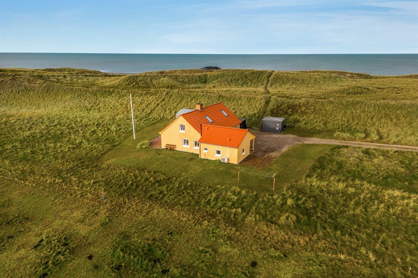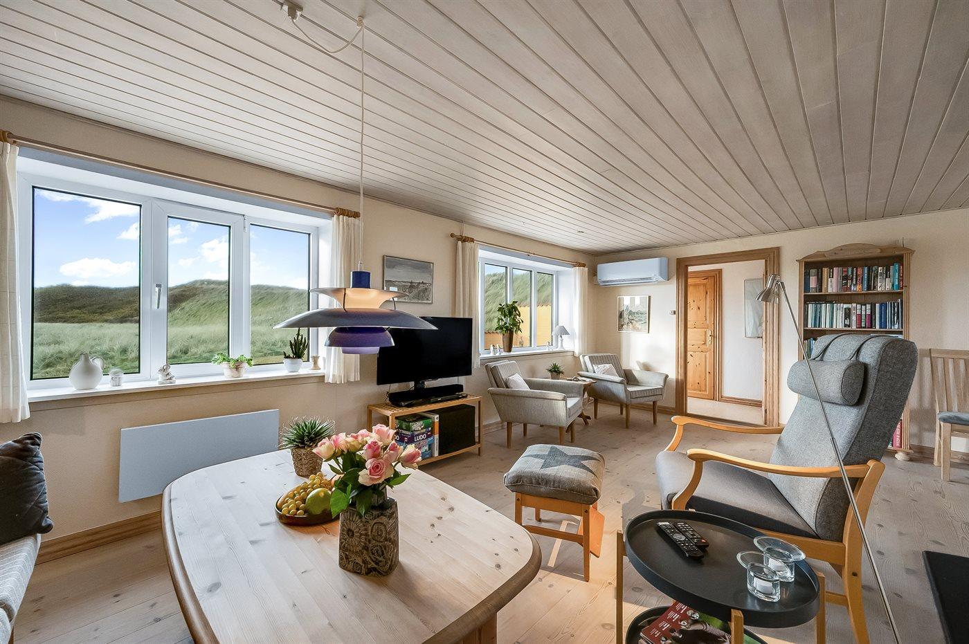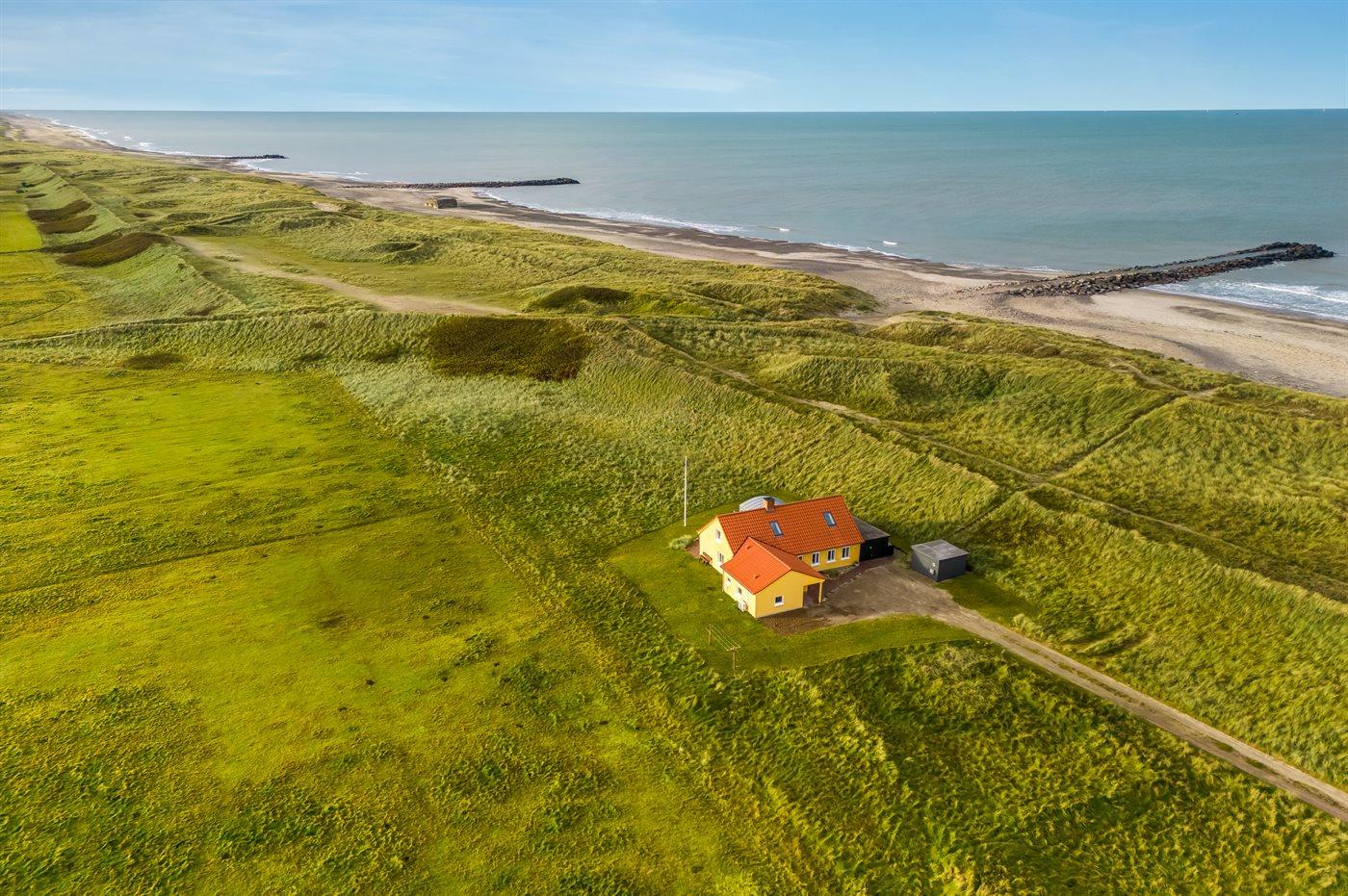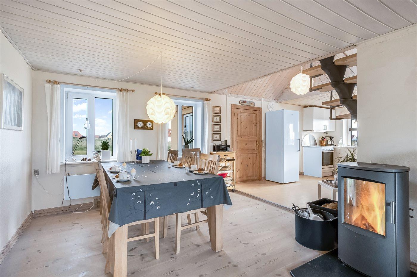 Dieses schöne und geräumige Ferienhaus liegt in der ersten Reihe zum Wasser, direkt hinter den hohen Dünen zum Strand und zur Nordsee. Das Haus liegt am Ende der Sackgasse in der ruhigen und landschaftlich reizvollen Gegend von Langerhuse, unmittelbar in der Nähe des Limfjordes. Das Haus ist liebevoll renoviert und gepflegt, mit einem hellen und gemütlichen Dekor und vom Wohnzimmer im ersten Stock gibt es einen schönen Blick auf die Umgebung, sowie Zugang zum Südbalkon. Zum Haus gehören mehrere schöne Terrassen, wo Sie sowohl Sonne als auch Schutz finden können.Die Treppe auf dem Grundstück führt durch die Dünen und direkt hinunter zum Strand und zum Meer.