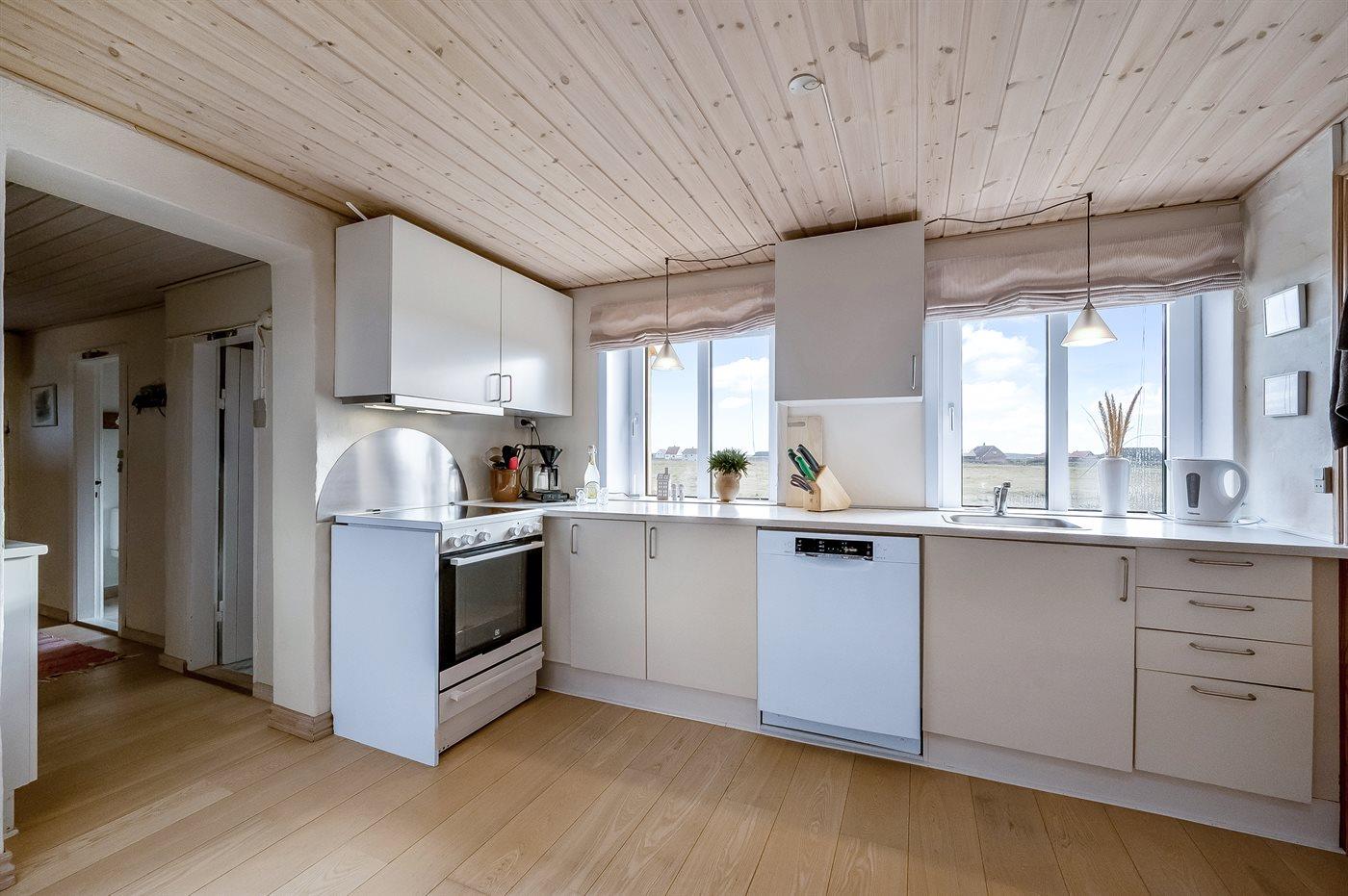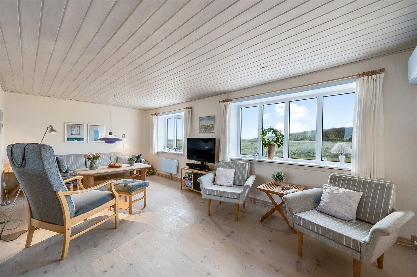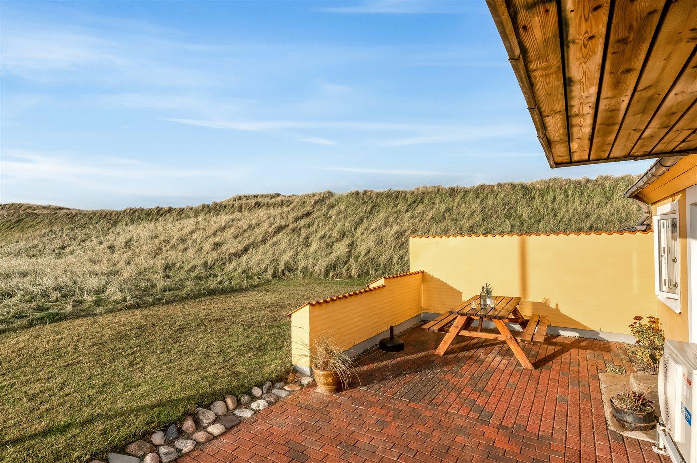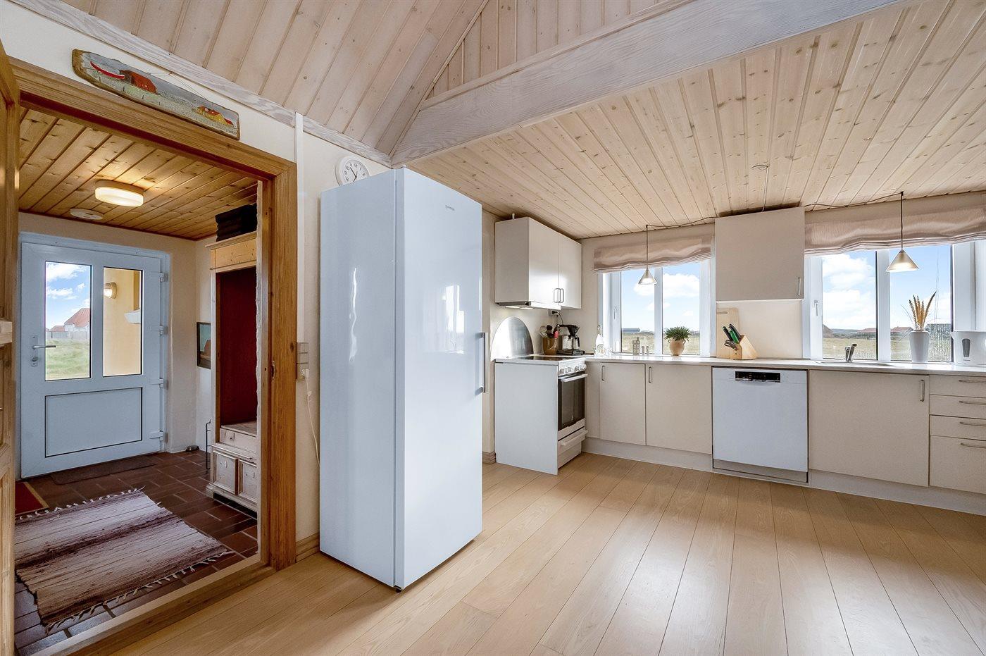 Dieses schöne und geräumige Ferienhaus liegt in der ersten Reihe zum Wasser, direkt hinter den hohen Dünen zum Strand und zur Nordsee. Das Haus liegt am Ende der Sackgasse in der ruhigen und landschaftlich reizvollen Gegend von Langerhuse, unmittelbar in der Nähe des Limfjordes. Das Haus ist liebevoll renoviert und gepflegt, mit einem hellen und gemütlichen Dekor und vom Wohnzimmer im ersten Stock gibt es einen schönen Blick auf die Umgebung, sowie Zugang zum Südbalkon. Zum Haus gehören mehrere schöne Terrassen, wo Sie sowohl Sonne als auch Schutz finden können.Die Treppe auf dem Grundstück führt durch die Dünen und direkt hinunter zum Strand und zum Meer.