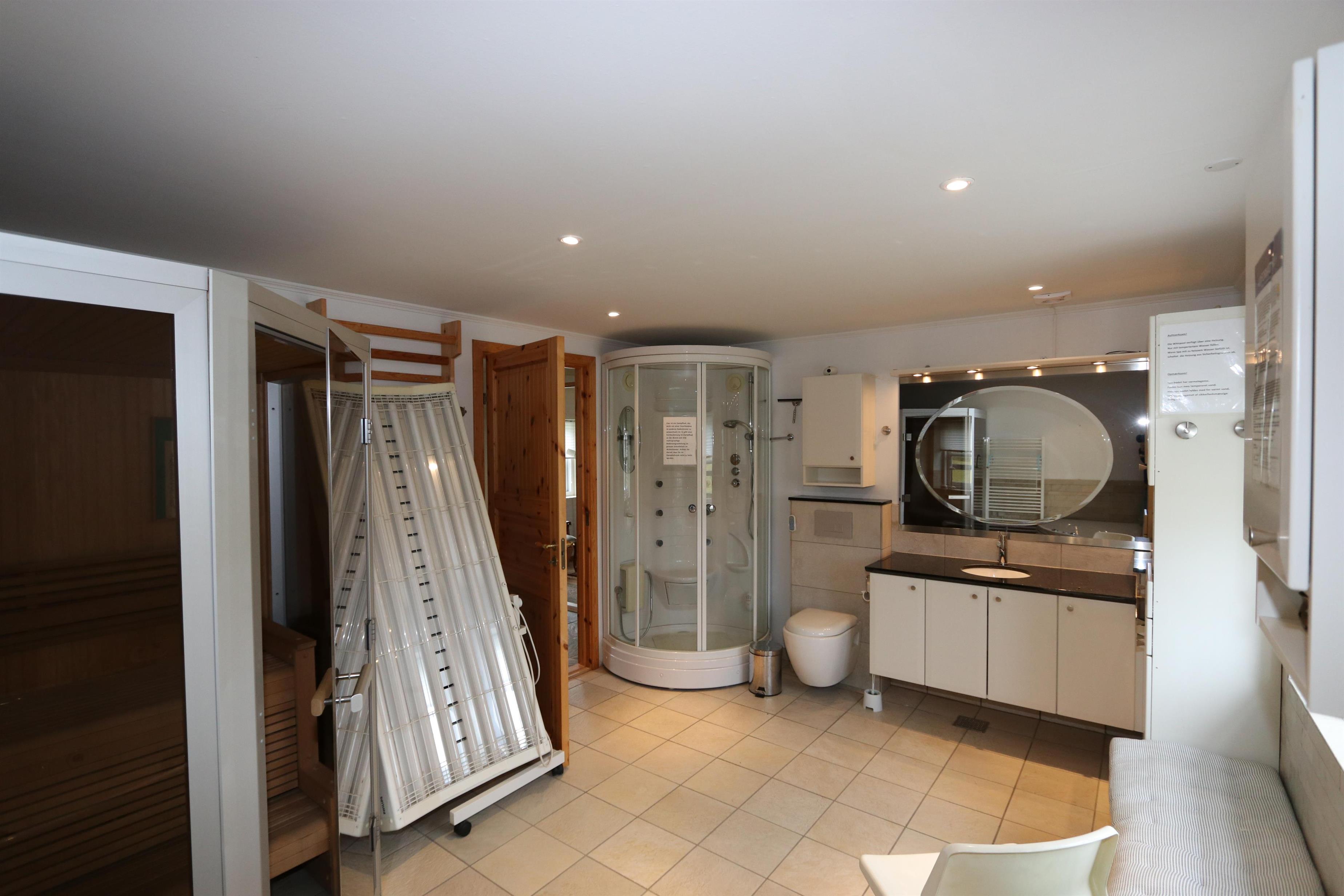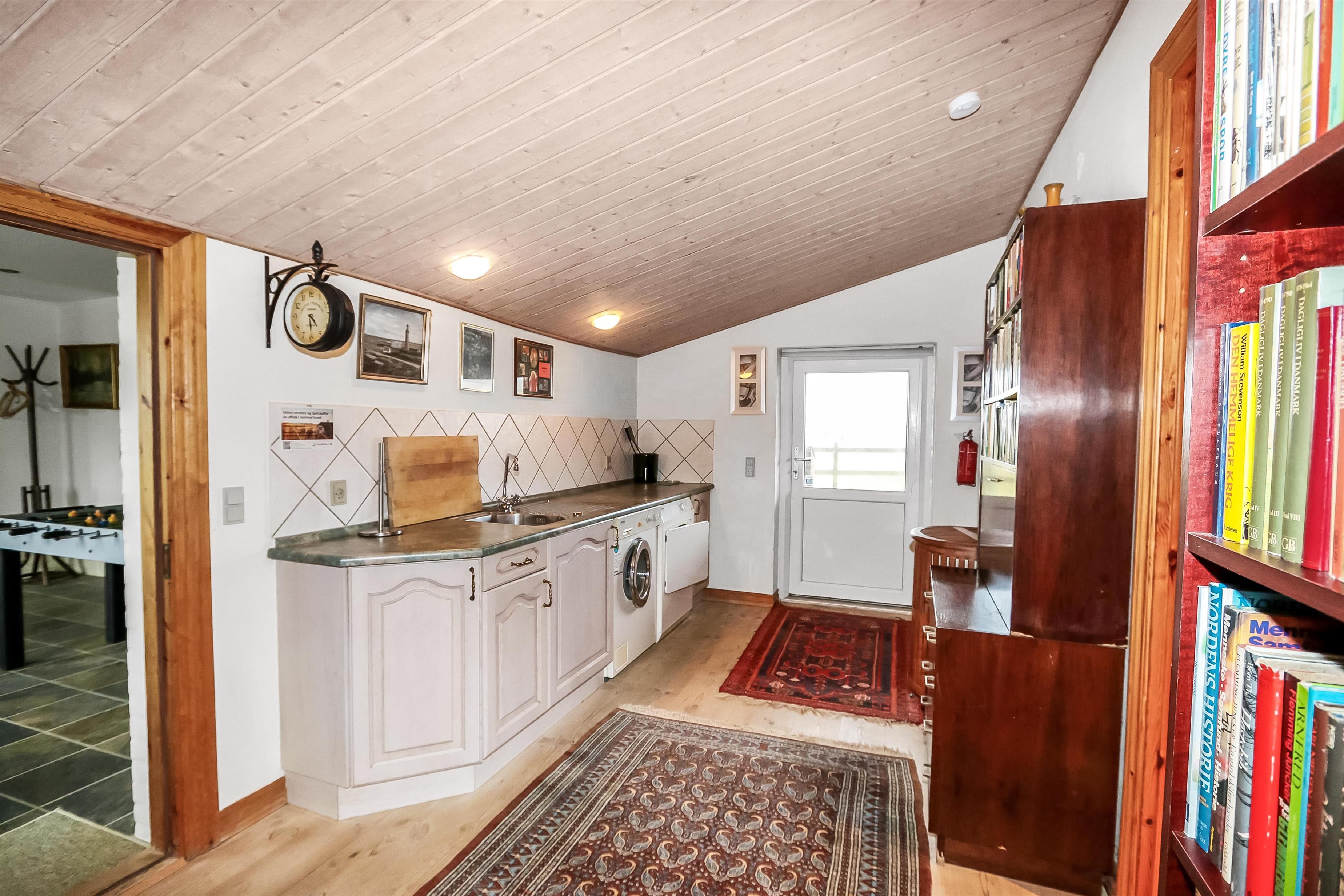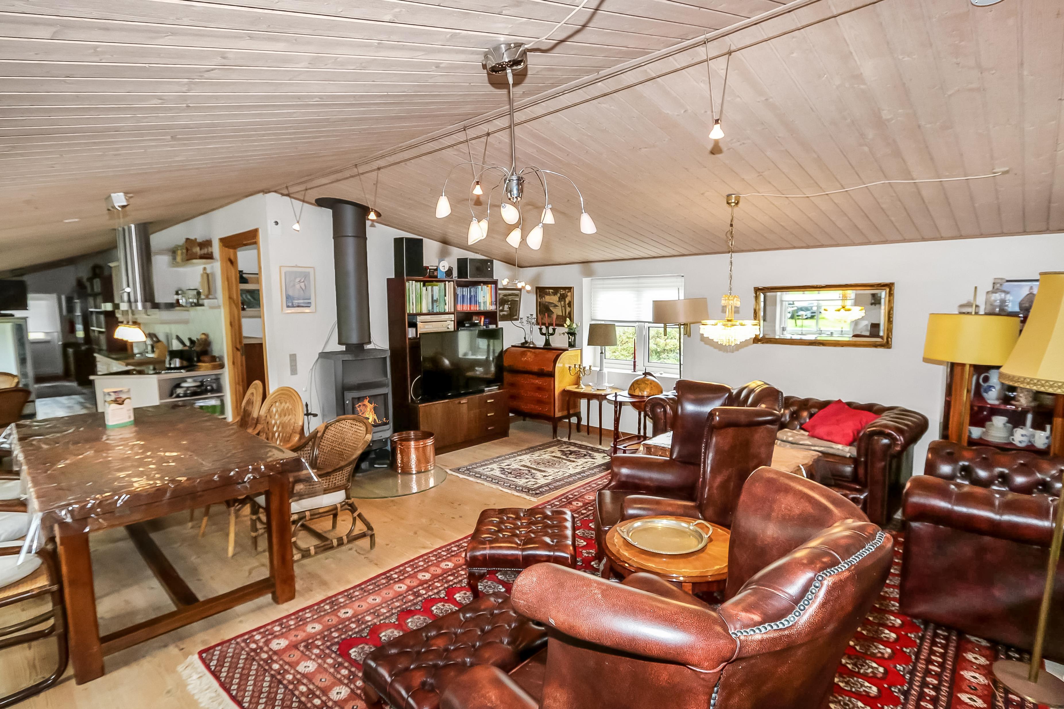 Das Haus wurde im Jahr 1877 erbaut, in 2016 renoviert und durch Anbauten vergrößert. Ein Flur heißt Sie willkommen. Hier gibt es viel Platz zum Aufhängen von Garderobe und es gibt hier auch die Möglichkeit, Tischfußball zu spielen. Der Flur ist auch ein Verteilerflur; von hier gibt es Zugang zum großen Badezimmer, Wohnraum und Küche. In der Küche gibt es ein extra Waschbecken, Waschmaschine und Trockner. In demselben Haus gibt es auch ein Extrabadezimmer mit Toilette, Bad und Waschbecken. Dieses Badezimmer hat auch direkten Zugang zu dem Schlafraum mit 1DB (Elevationsbett) und TV. Es gibt auch noch einen Schlafraum mit 1DB und extra TV. Offene Küche mit Ceranfeld Kochplatten, eingebautem Ofen mit Pyrolyse-Programm, Mikrowelle, Geschirrspüler, Abzugshaube, Kühlschrank, Gefrierschrank mit 170 l und kleinem Tisch mit 2 Sitzplätzen. Großer Wohnraum mit großem Esstisch, großem TV mit dänischen und deutschen Programmen und Chesterfield Möbeln. Vom Flur gibt es auch Zugang zu einem großen Badezimmer mit Toilette, Wachbecken, Dampfkabine, direkten Zugang zur Glassauna, Whirlpool für 2 Personen und einen Fliesenboden mit Fußbodenheizung. Von dem großen, mit Ledermöbeln und vielen anderen persönlichen Möbeln und Gegenständen und Fußbodenheizung ausgestatteten Wohnraum, gelangen Sie über eine Wendeltreppe in den 1. Stock. Das Haus ist gut isoliert und hat 2 Wärmepumpen, die für eine energiefreundliche Wärme sorgen; der Kaminofen im Wohnraum sorgt für eine gemütliche Wärme. Das Haus ist sehr persönlich eingerichtet. Es gibt z.B. viele Regale mit Büchern und mehreren Antiquitäten und andere schöne Möbel im Haus. Insgesamt gibt es 6 TV´s mit DVD im Haus und 5 Chromecast. Ein Kinderstuhl und Kinderbett sind vorhanden. Nichtraucher-Haus. 2 Haustiere sind erlaubt.