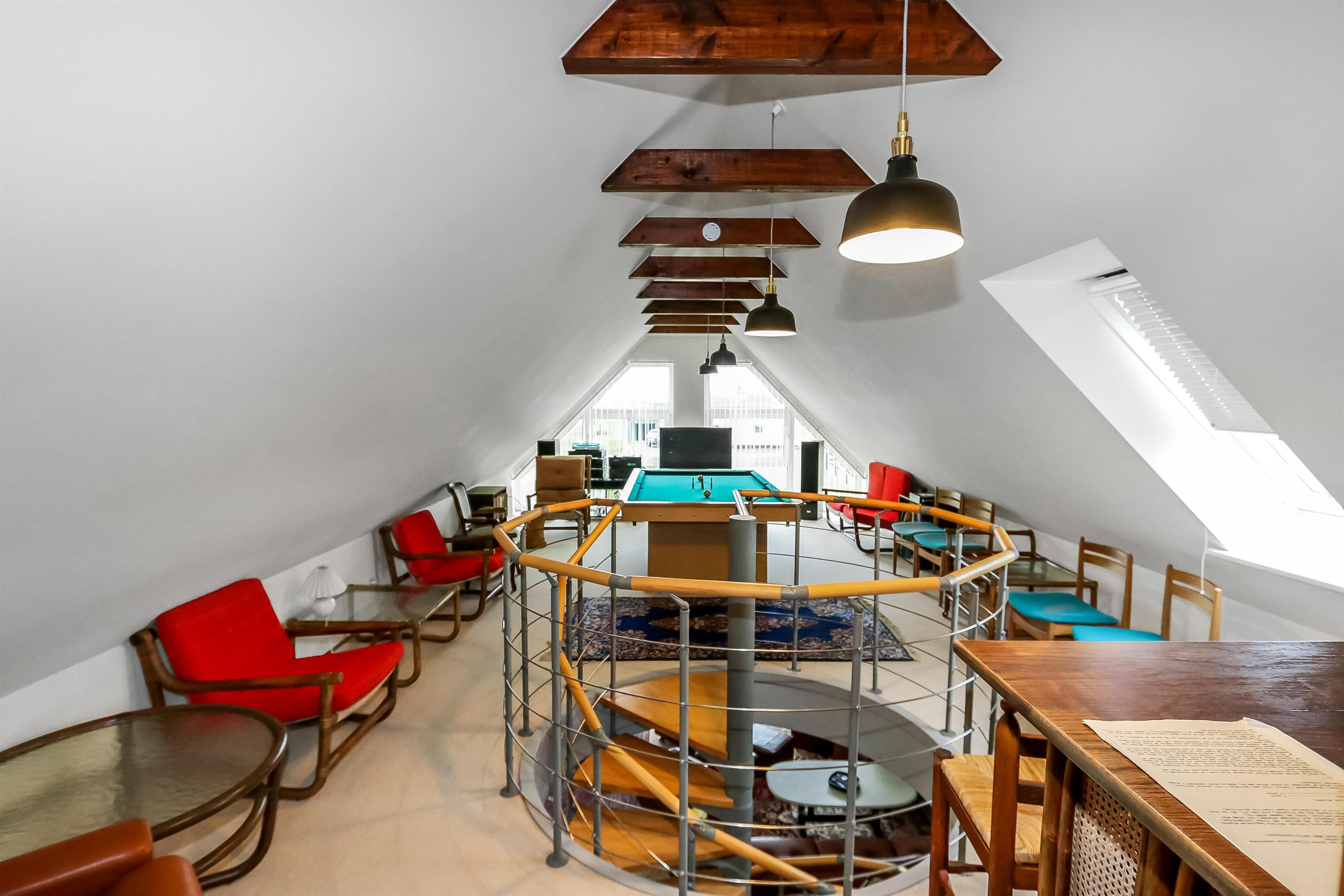 Im 1. Stock gibt es noch einen Aufenthaltsraum mit großem Billardtisch, vielen Stühle, eine ältere Stereoanlage und Blick zu den Dünen an der Nordsee. Es gibt auch Platten für den Billardtisch, damit er auch als Tischtennistisch genutzt werden kann. Zugang zu einem Schlafraum: 1DB+1B und ein älteres Kinderbett.