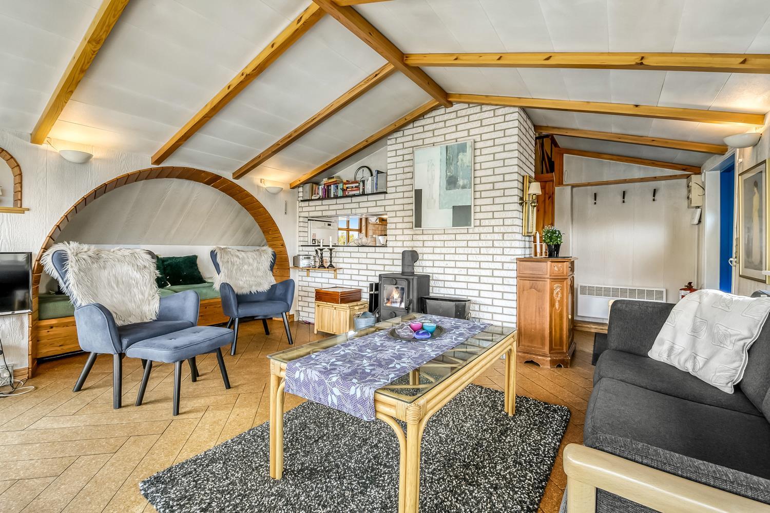 Beim Betreten des Hauses durch die Haustür steht man direkt im zentralen Wohnbereich, der aus Küche und Wohnzimmer besteht. Die Küche ist schmal, aber gut ausgestattet mit allem, was man für einen entspannten Urlaub benötigt. Es gibt unter anderem ein Glaskeramik-Kochfeld, eine Abzugshaube, eine Tischspülmaschine, einen Kühl-/Gefrierschrank und eine Mikrowelle. In der Küche führt eine Leiter hinauf zum offenen Hems (Schlafboden) auf dem drei Schlafplätze zur Verfügung stehen.