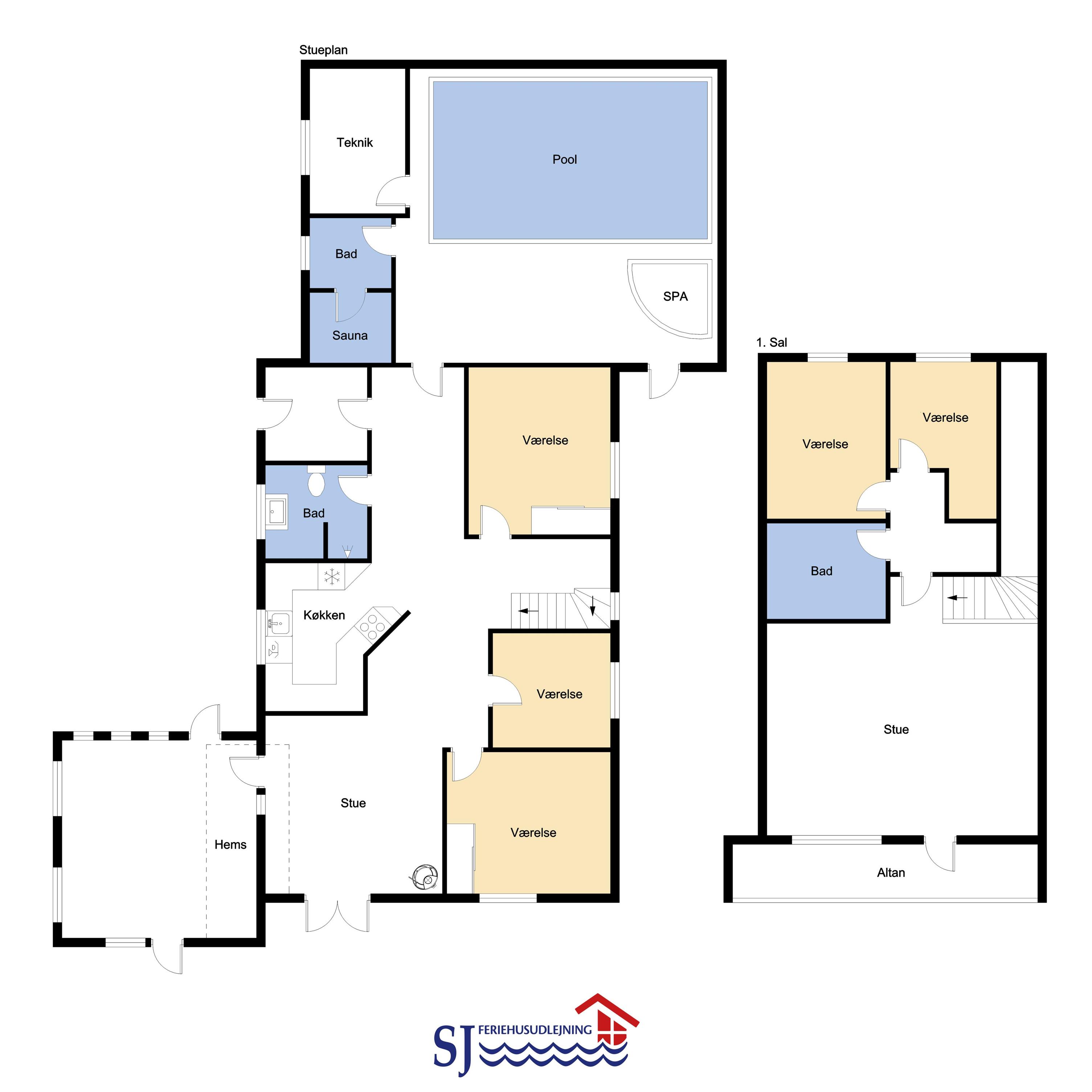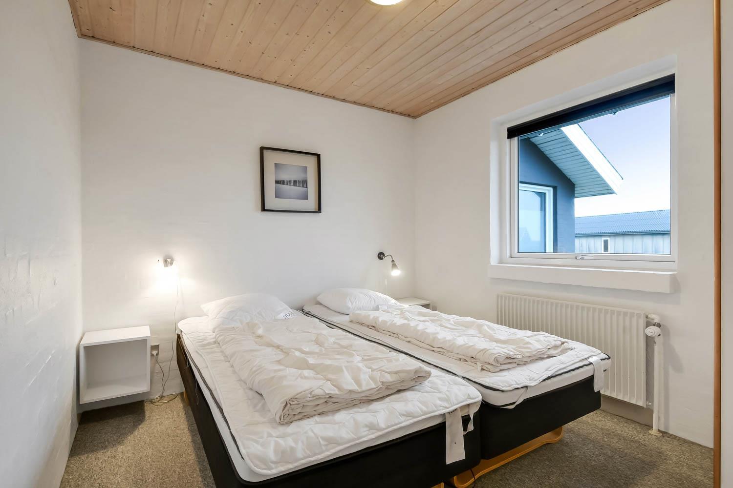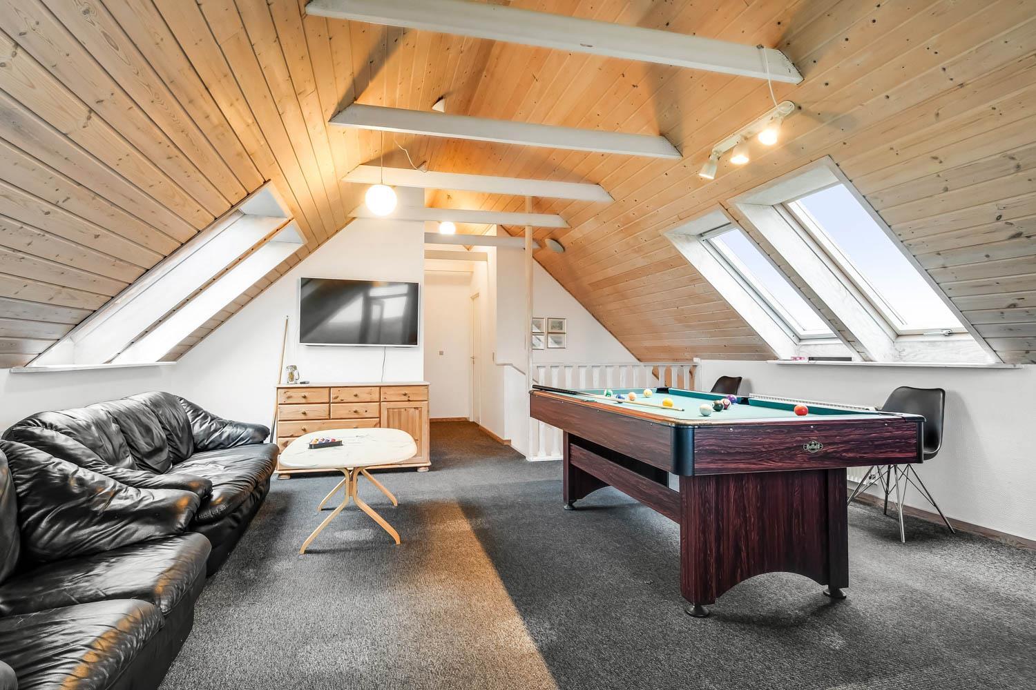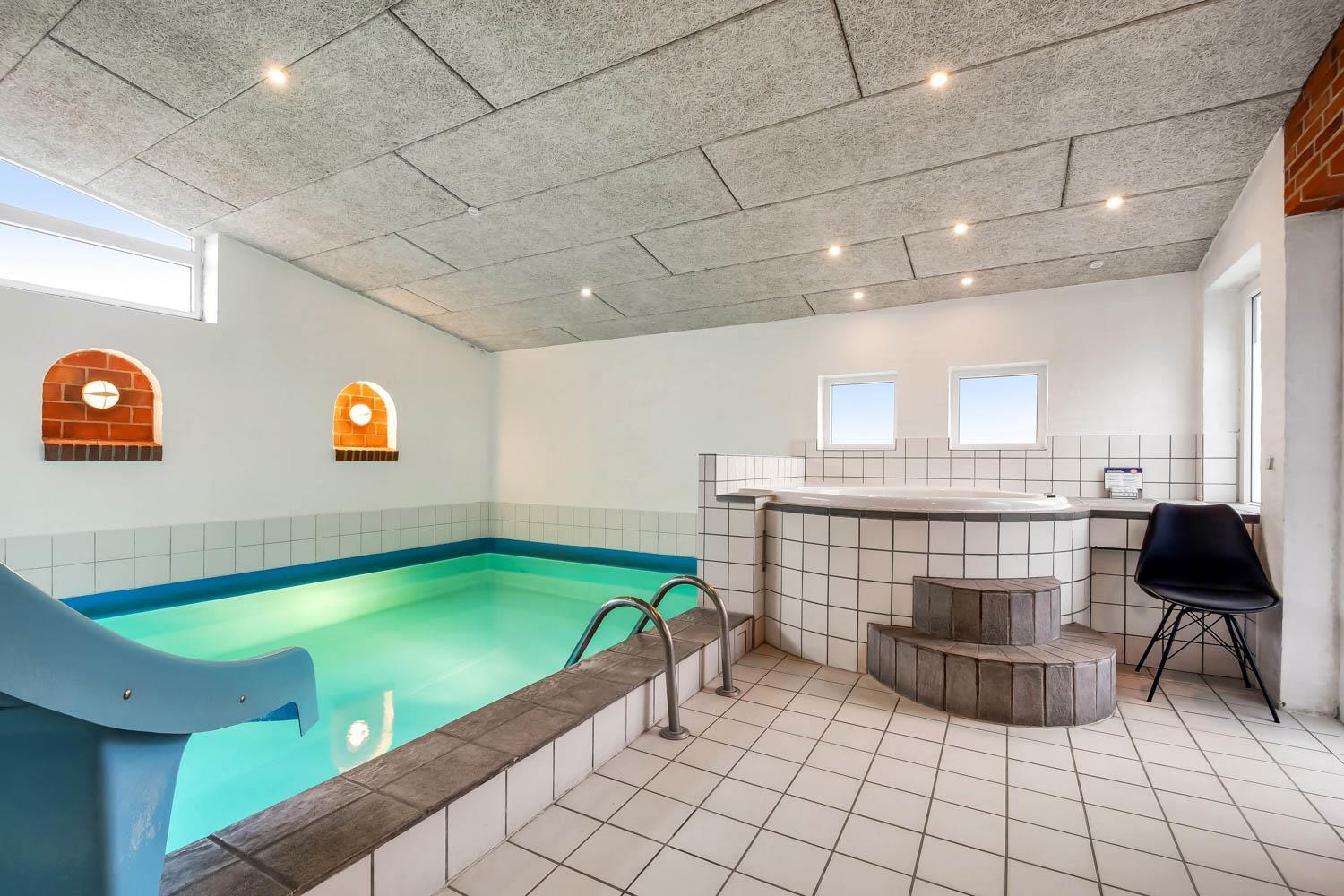 Das Ferienhaus ist mit 5 Schlafzimmern ausgestattet. Drei Zimmer mit jeweils 1 Doppelbett (3 DB), 1 Zimmer mit 2 Etagenbetten (4 Schlafplätze), 1 Zimmer mit 3 Einzelbetten (3 EB) und 1 Hems (Schlafboden) mit 2 weiteren Liegeplätzen. Außerdem gibt es 3 Toiletten alle mit Dusche, Waschbecken und Toilette. Im geräumigen Poolbereich finden Sie einen großen Pool mit Gegenstromanlage, einen 4-Personen-Whirlpool, Sauna und Toilette mit Dusche. Im Haus ist eine Wärmepumpe installiert.