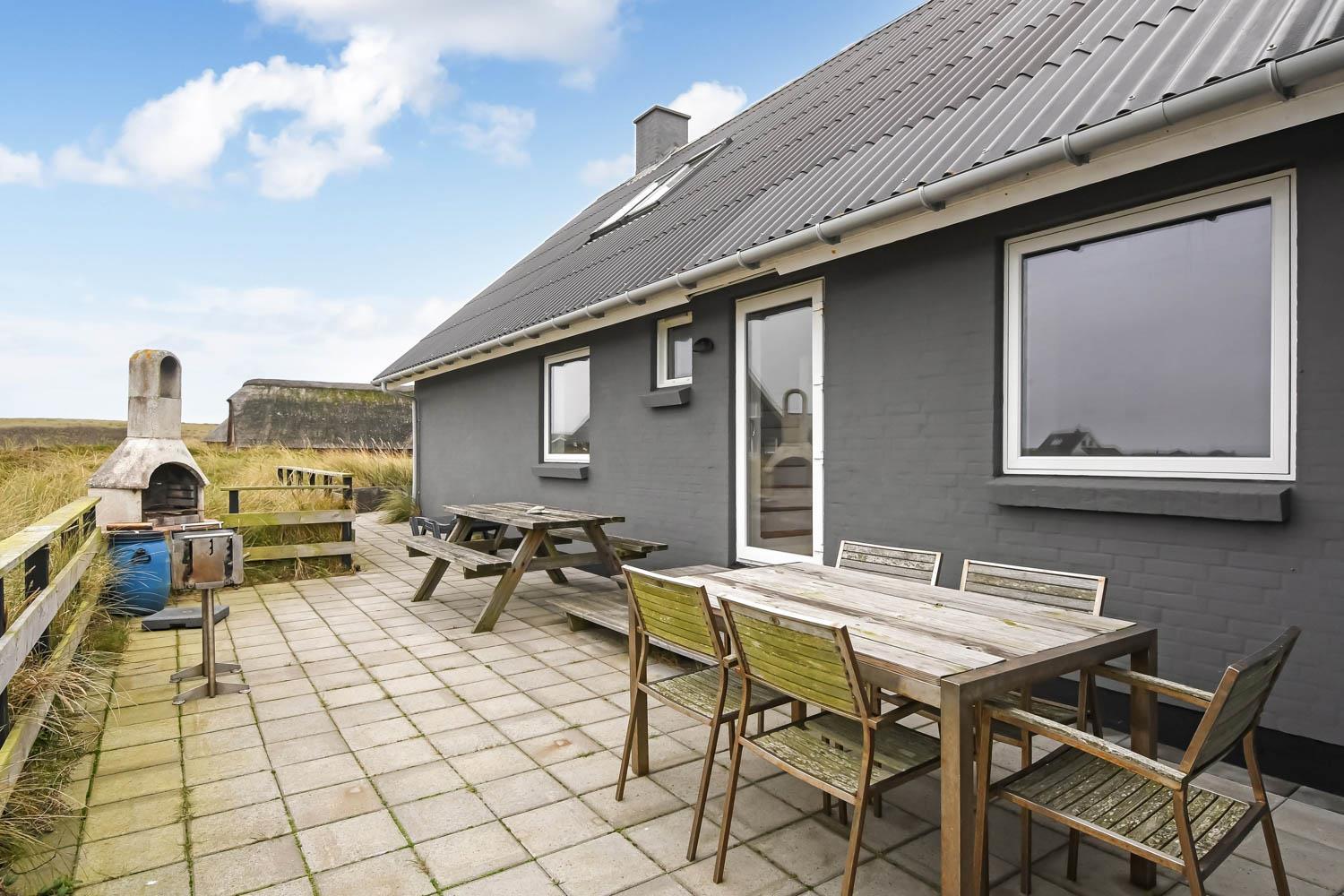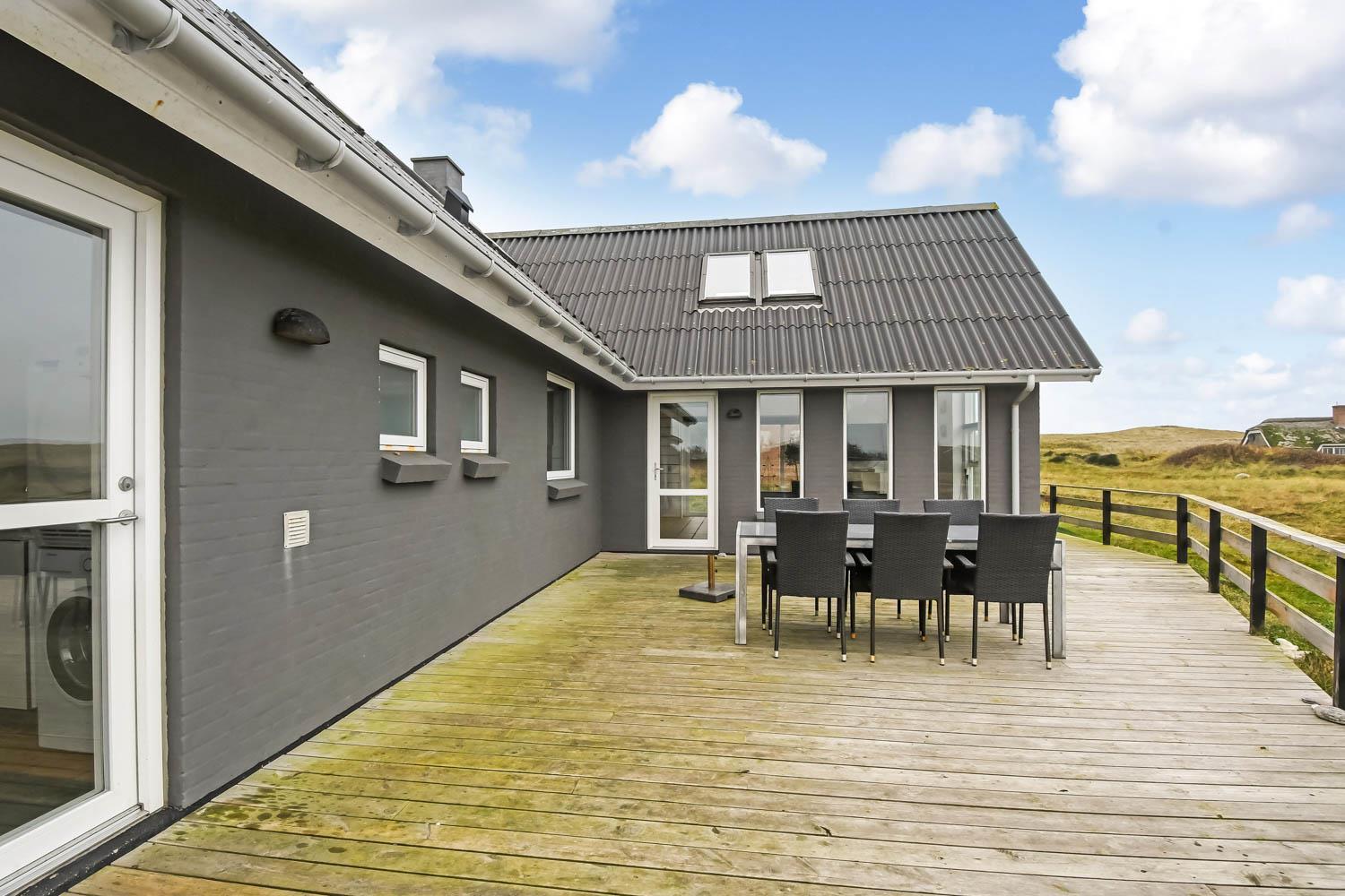 Vom Ferienhaus hat man Zugang zu einer großen und schönen Holzterrasse, die rund um das Haus verläuft. Hier finden Sie immer ein geschütztes Plätzchen. Gartenmöbel und Liegestühle stehen zur Verfügung. Es ist das perfekte Ferienhaus mit Blick auf die Dünen, für einen einzigartigen Urlaub dicht an der Nordsee.