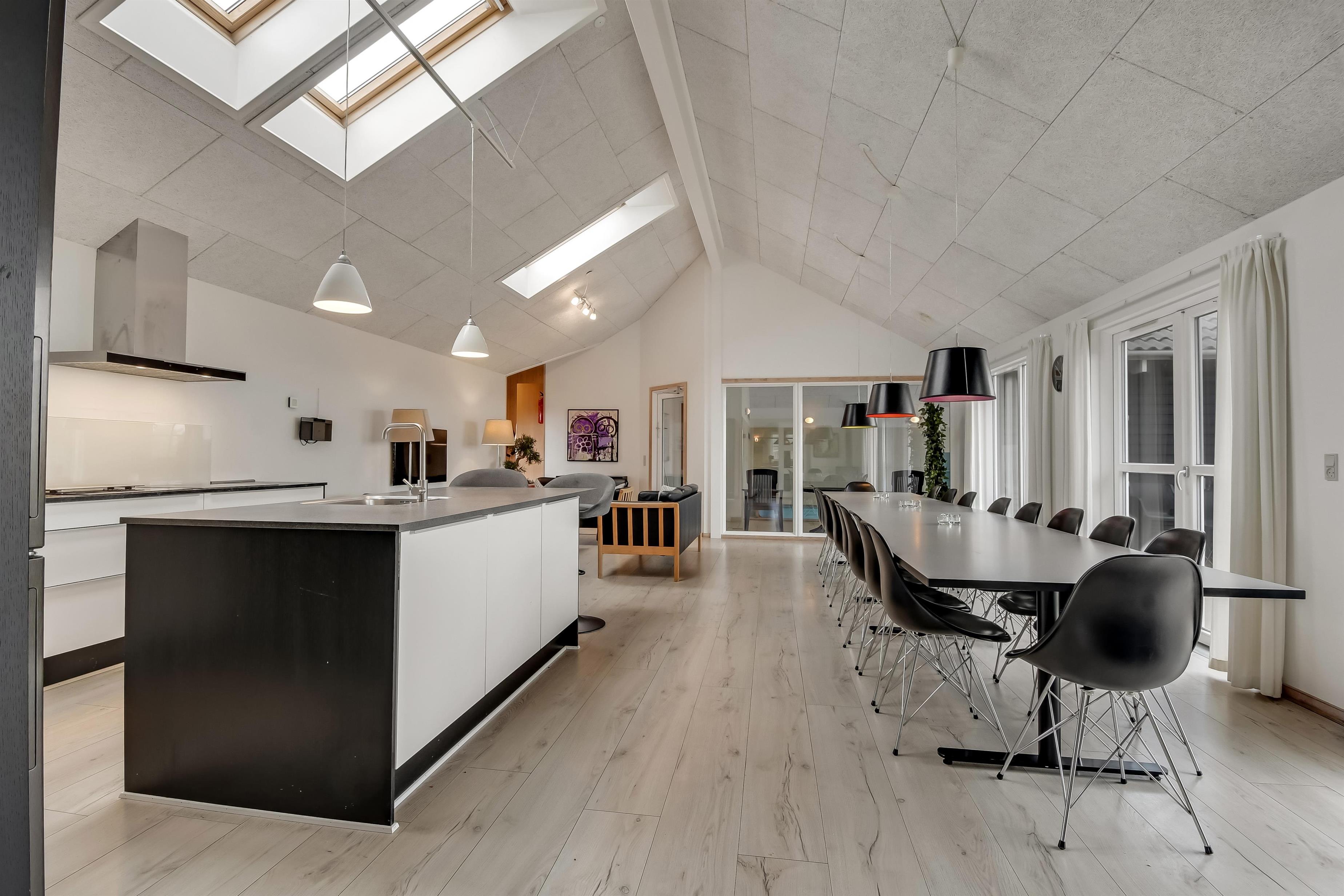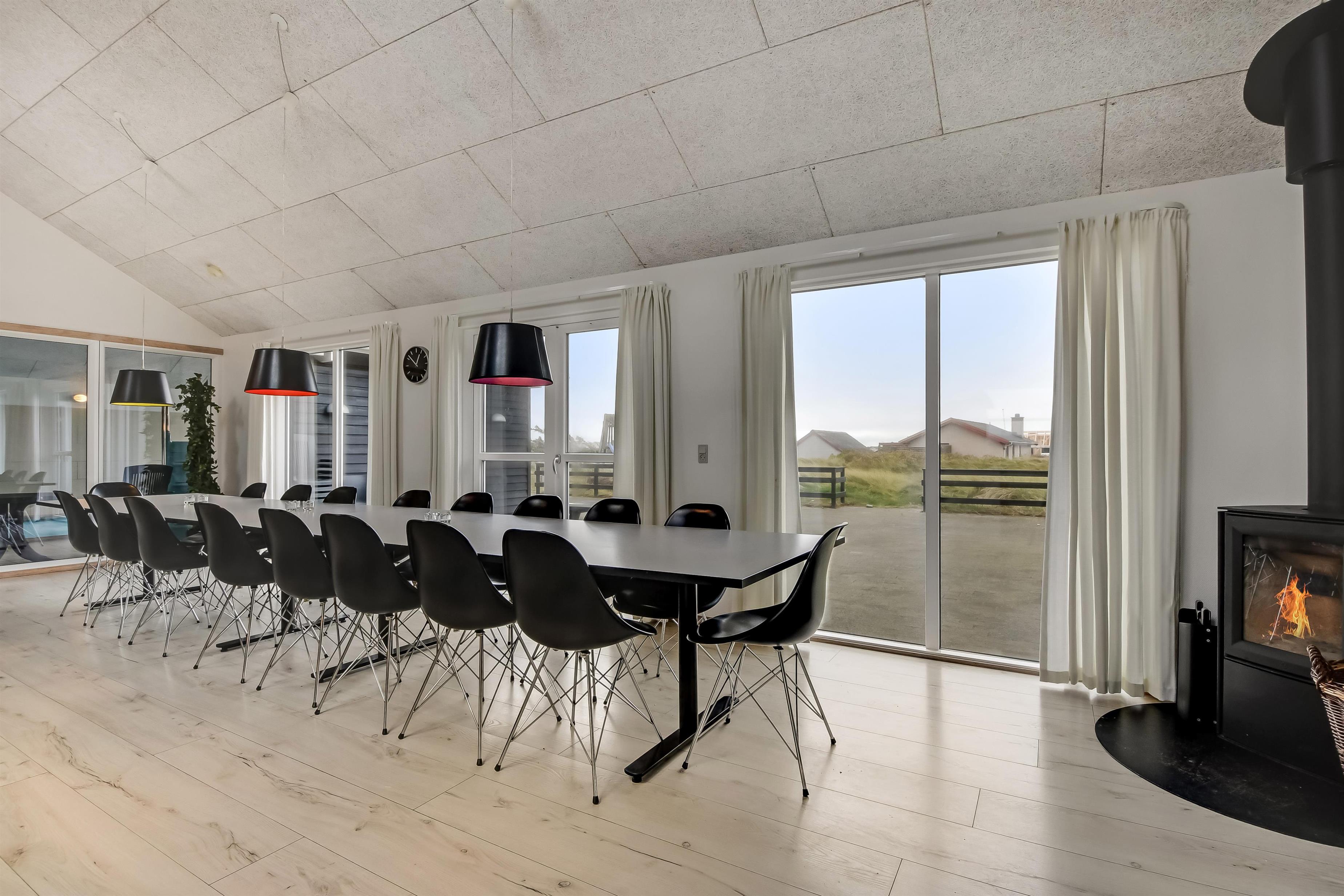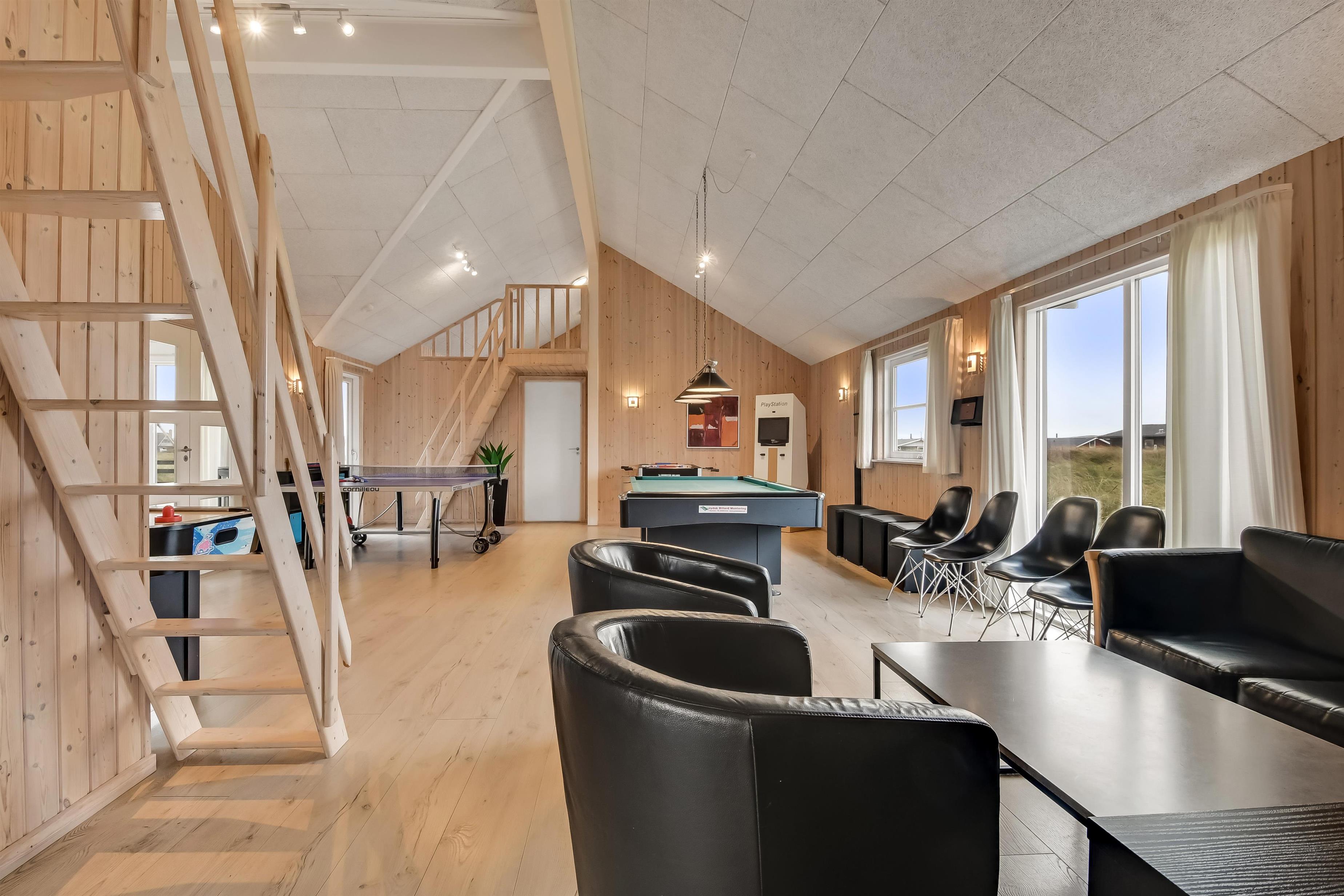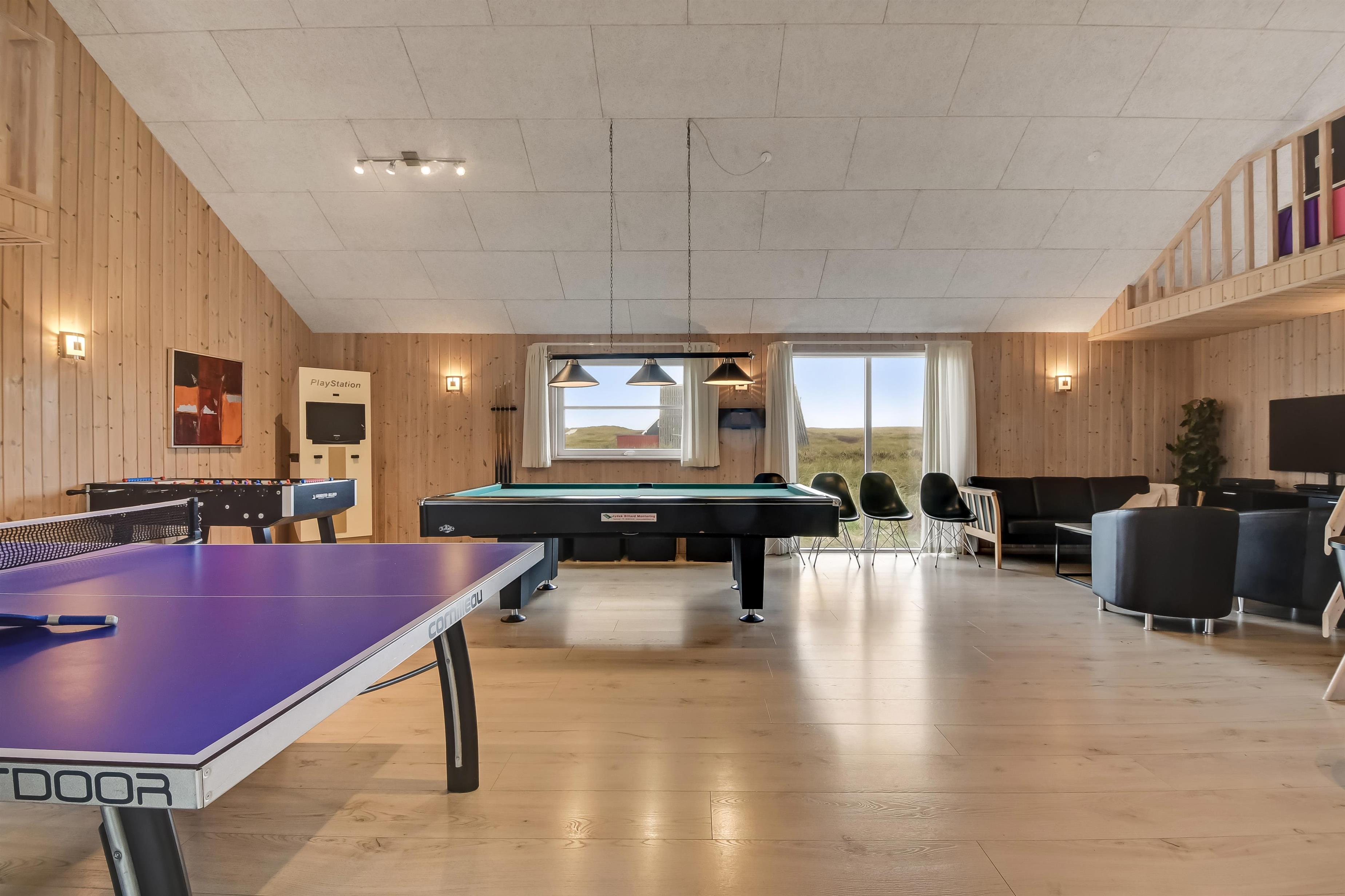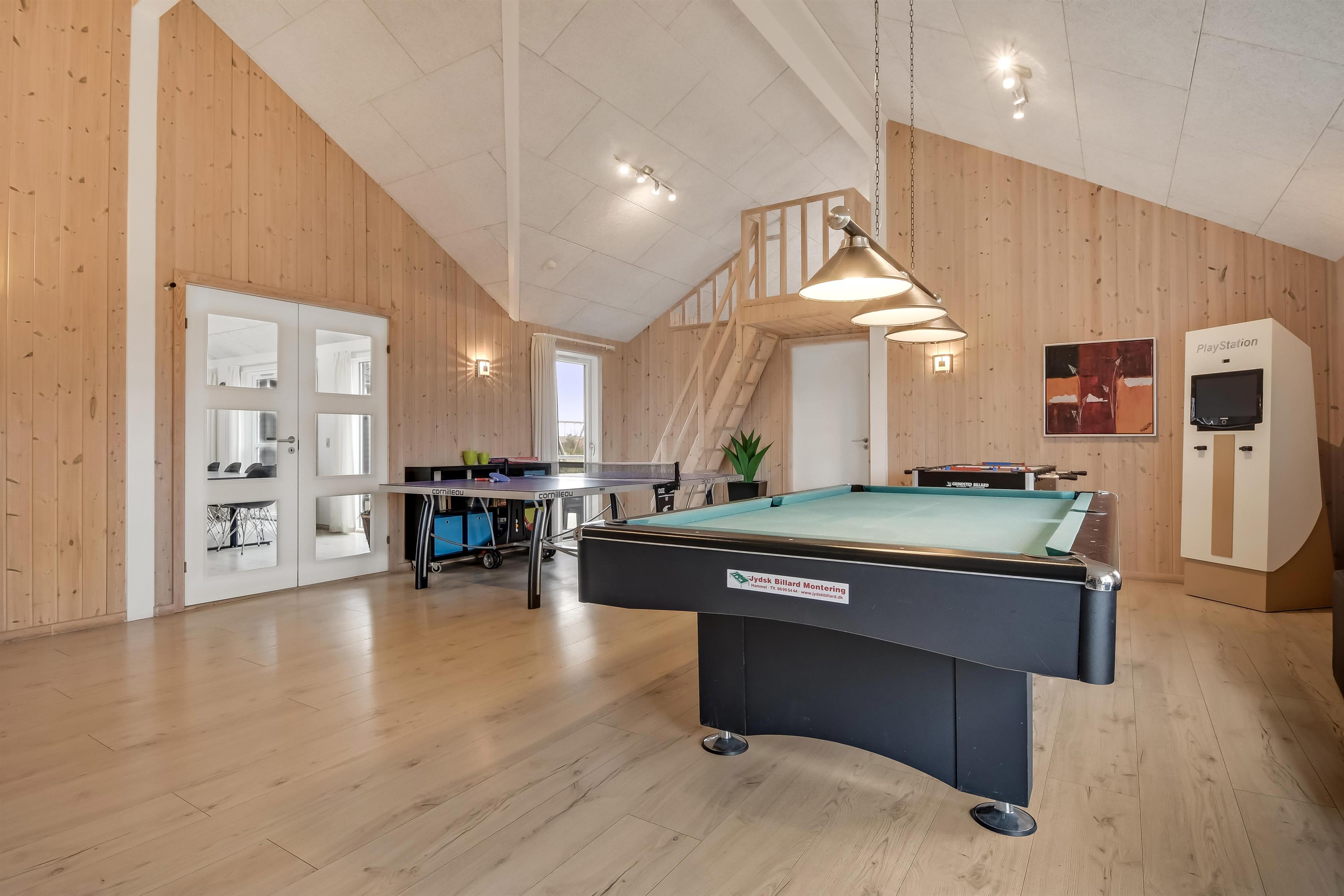 Neues und schön eingerichtetes 370 m² Ferienhaus mit 8 Schlafzimmern, ausgestattet mit : 1 DB + 1 DB + 1 DB + 1 DB + 1 DB + 1 DB + 2 EB + 2 EB. Des Weiteren gibt es 2 große Schlafböden (2 x Hems) mit jeweils 3 Schlafplätzen und einen herrlichen Spielehems. Die Schlafböden sind nicht abschließbar und auch Erwachsene können hier bequem übernachten. Das Haus verfügt über eine gut ausgestattete Küche, u. a. 2 elektrische Cerankochfelder, 2 Einbaubacköfen, große Dunstabzugshaube, 2 Geschirrspüler, Mikrowelle, großer Kühlschrank und separater Gefrierschrank (250 L). Alle 22 Bewohner können sich um den großen Esstisch des Hauses versammeln, der auch zum Spielen und Unterhalten einlädt. Von hier haben Sie durch die großen Fenster einen freien Blick in den Poolraum und auf die großen Dünen, die die einmalige Lage des Hauses unterstreichen. Entspannen Sie sich in den bequemen Qualitätsmöbeln vor dem wärmenden Holzofen in gemütlicher Atmosphäre. 5 x TV mit dänischem und deutschem Programm, davon ein TV mit Blue Ray Player. Es gibt Fliesenboden mit Fußbodenheizung im ganzen Haus und Holzboden in den Schlafzimmern. Große Wellness- und Poolabteilung mit 5-6-Personen-Whirlpool mit Massagedüsen sowie einer schönen Sauna. Der Pool ist 22 m² groß mit Rutsche und Gegenstromanlage. Der Aktivitätsraum umfasst: Tischfußball, Tischtennis, Dart, Billard, Airhockey und TV mit 2 verschiedenen Spielekonsolen (Playstation 3 und Xbox). Waschmaschine und Wäschetrockner sind selbstverständlich vorhanden. 4 Badezimmer mit Toilette, Dusche, Waschbecken und Fußbodenheizung. Für Kinder gibt es 3 Hochstühle. Max. 2 Haustiere sind erlaubt. Keine Vermietung an Jugendgruppen. Freier Zugang zum Harboøre Center. Kaution Wintersaison EUR 800 und Sommersaison EUR 500. Wenn Sie ein Elektroauto oder einen Plug-in-Hybrid haben, verfügt das Haus über eine Ladebox.
