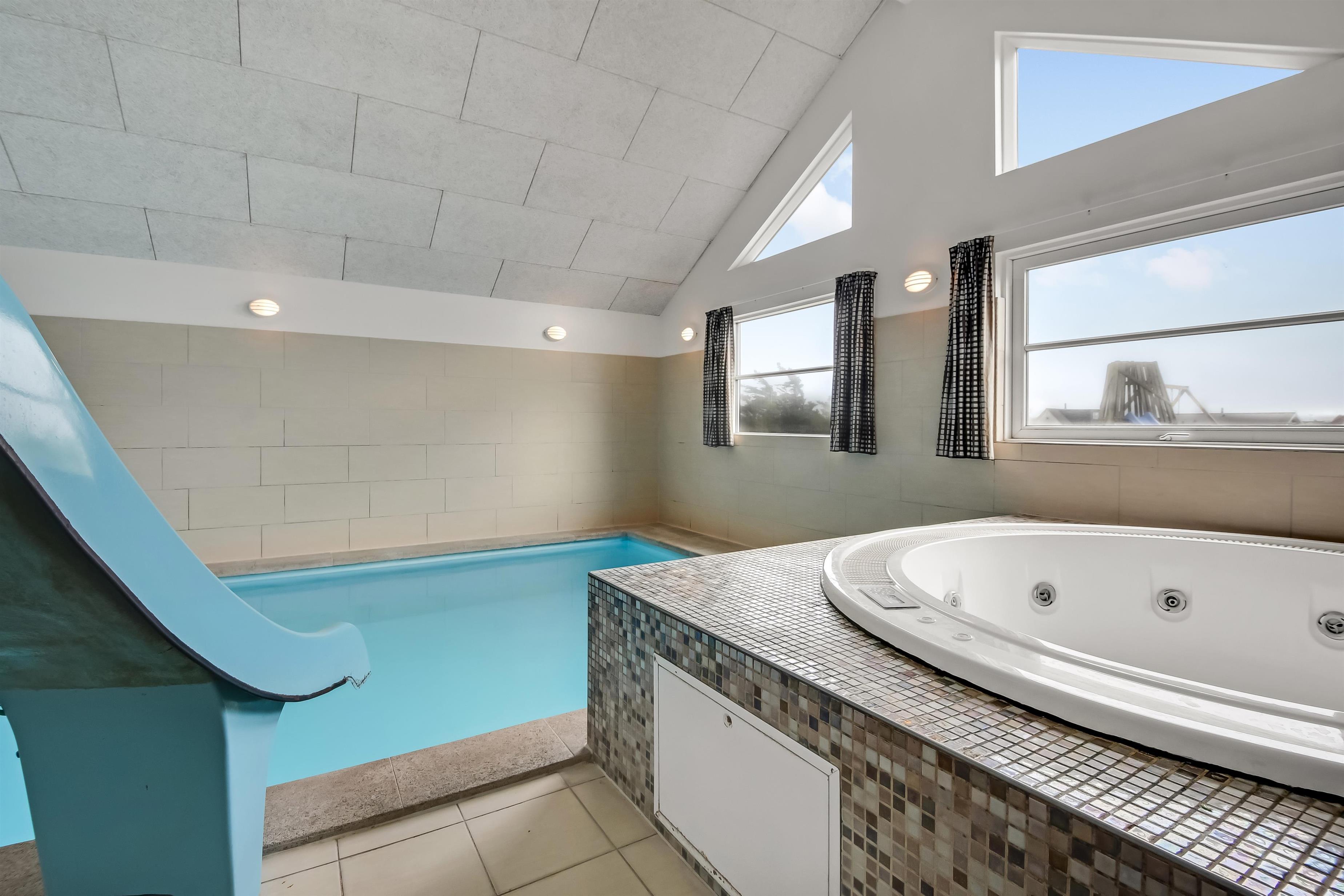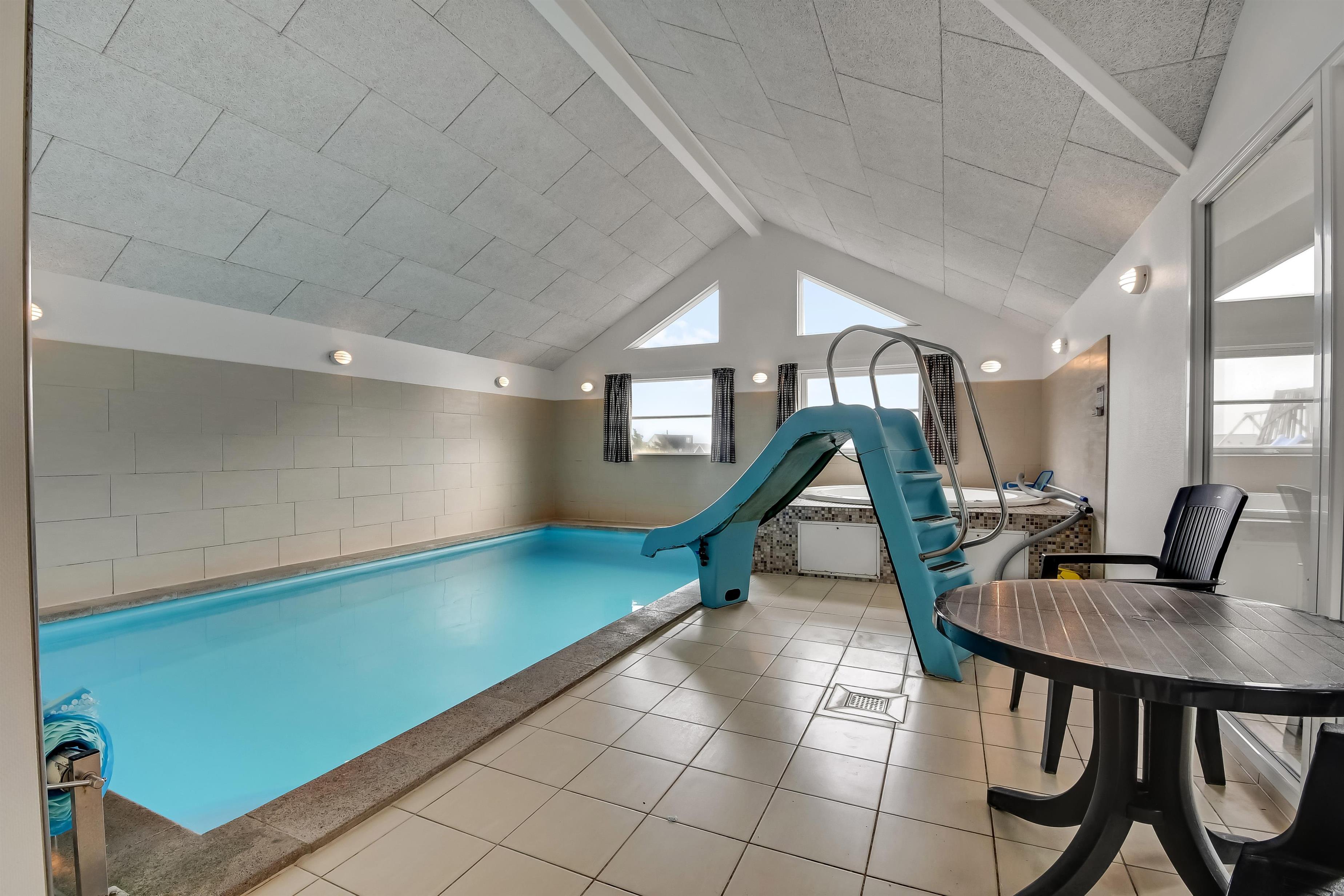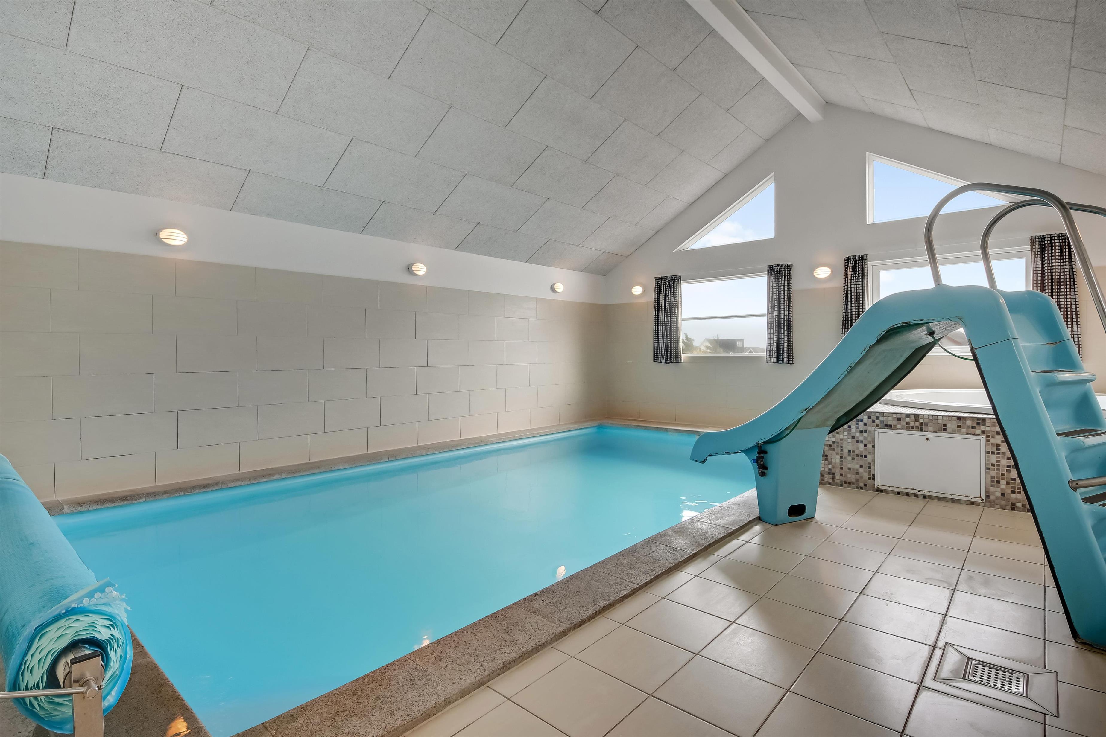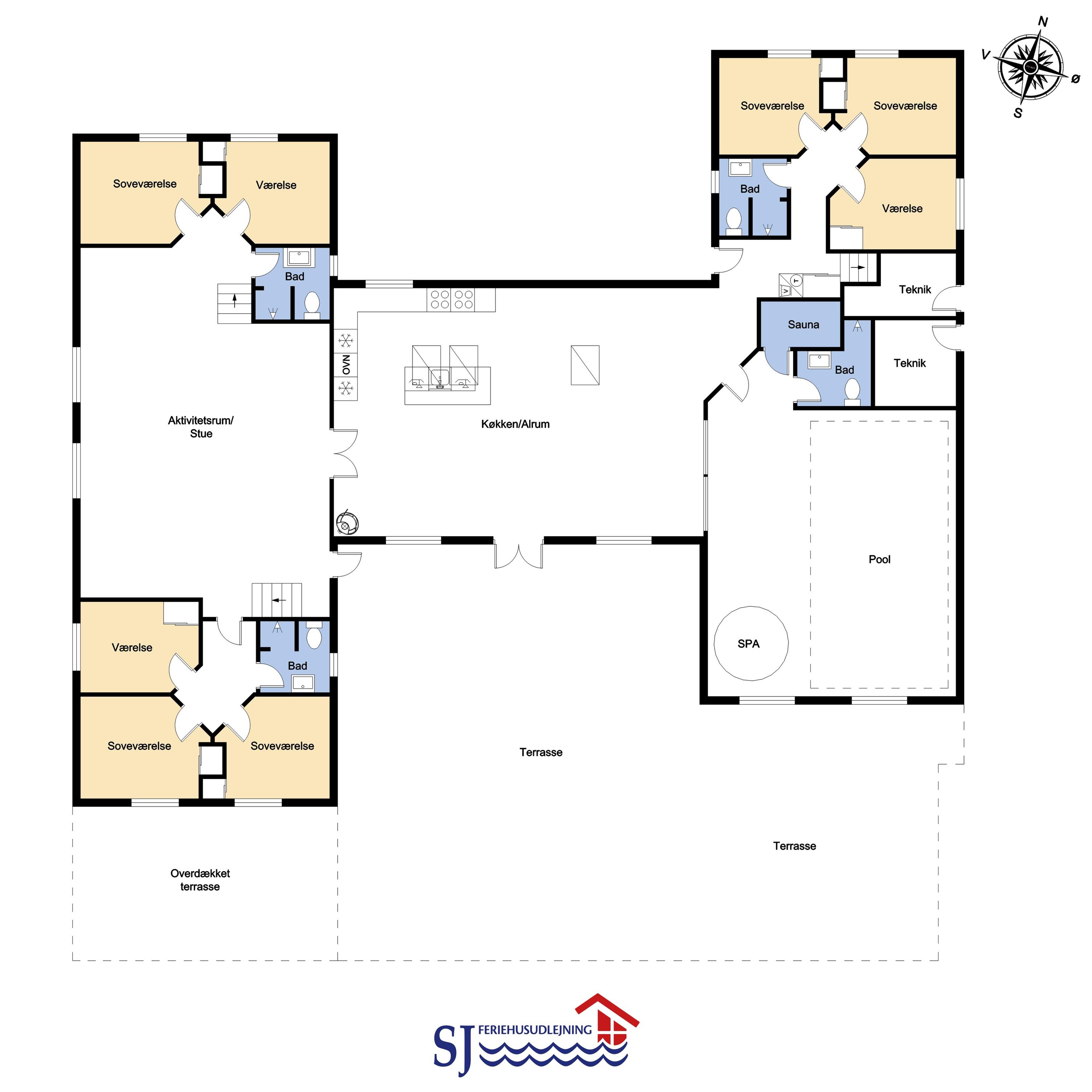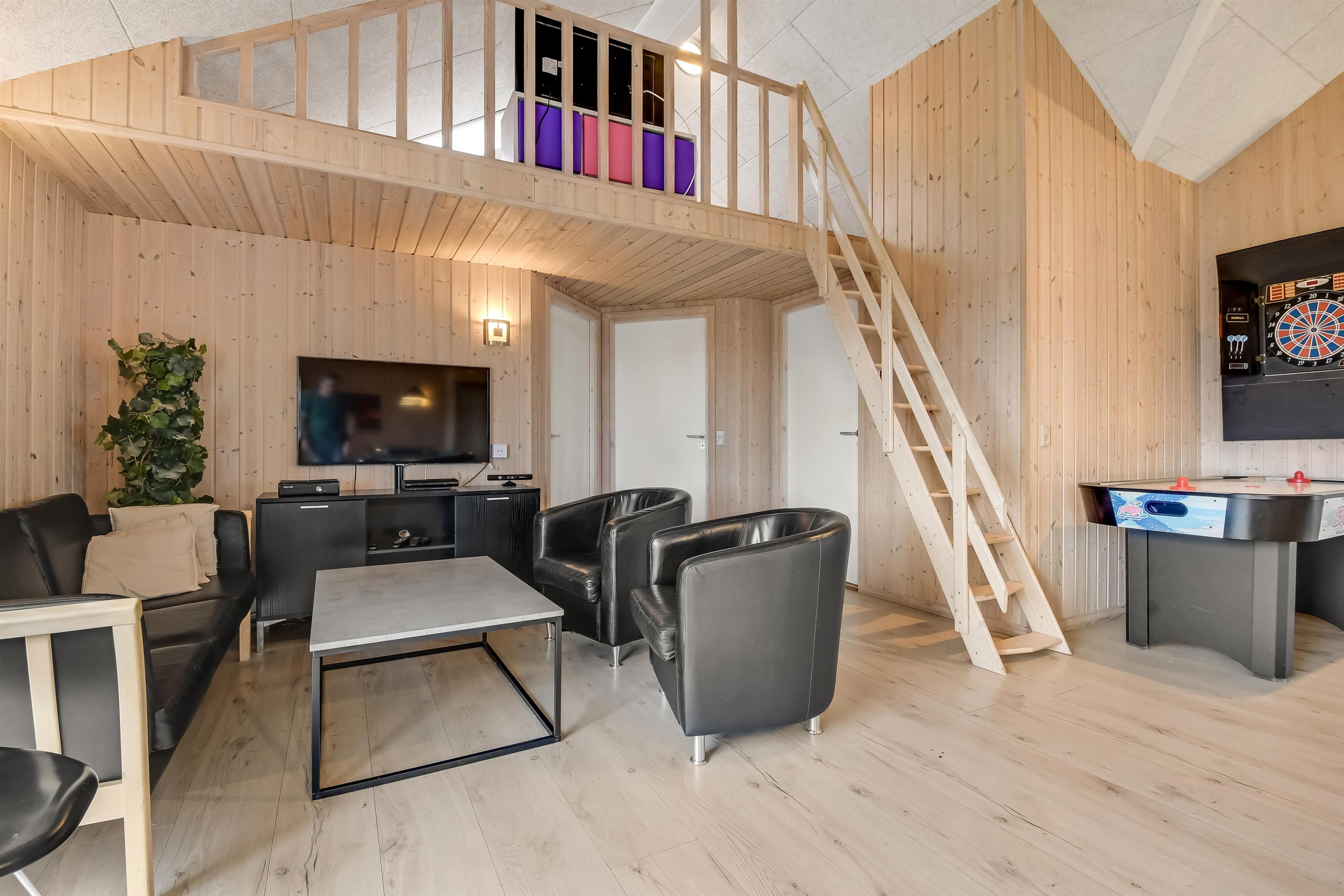 Neues und schön eingerichtetes 370 m² Ferienhaus mit 8 Schlafzimmern, ausgestattet mit : 1 DB + 1 DB + 1 DB + 1 DB + 1 DB + 1 DB + 2 EB + 2 EB. Des Weiteren gibt es 2 große Schlafböden (2 x Hems) mit jeweils 3 Schlafplätzen und einen herrlichen Spielehems. Die Schlafböden sind nicht abschließbar und auch Erwachsene können hier bequem übernachten. Das Haus verfügt über eine gut ausgestattete Küche, u. a. 2 elektrische Cerankochfelder, 2 Einbaubacköfen, große Dunstabzugshaube, 2 Geschirrspüler, Mikrowelle, großer Kühlschrank und separater Gefrierschrank (250 L). Alle 22 Bewohner können sich um den großen Esstisch des Hauses versammeln, der auch zum Spielen und Unterhalten einlädt. Von hier haben Sie durch die großen Fenster einen freien Blick in den Poolraum und auf die großen Dünen, die die einmalige Lage des Hauses unterstreichen. Entspannen Sie sich in den bequemen Qualitätsmöbeln vor dem wärmenden Holzofen in gemütlicher Atmosphäre. 5 x TV mit dänischem und deutschem Programm, davon ein TV mit Blue Ray Player. Es gibt Fliesenboden mit Fußbodenheizung im ganzen Haus und Holzboden in den Schlafzimmern. Große Wellness- und Poolabteilung mit 5-6-Personen-Whirlpool mit Massagedüsen sowie einer schönen Sauna. Der Pool ist 22 m² groß mit Rutsche und Gegenstromanlage. Der Aktivitätsraum umfasst: Tischfußball, Tischtennis, Dart, Billard, Airhockey und TV mit 2 verschiedenen Spielekonsolen (Playstation 3 und Xbox). Waschmaschine und Wäschetrockner sind selbstverständlich vorhanden. 4 Badezimmer mit Toilette, Dusche, Waschbecken und Fußbodenheizung. Für Kinder gibt es 3 Hochstühle. Max. 2 Haustiere sind erlaubt. Keine Vermietung an Jugendgruppen. Freier Zugang zum Harboøre Center. Kaution Wintersaison EUR 800 und Sommersaison EUR 500. Wenn Sie ein Elektroauto oder einen Plug-in-Hybrid haben, verfügt das Haus über eine Ladebox.