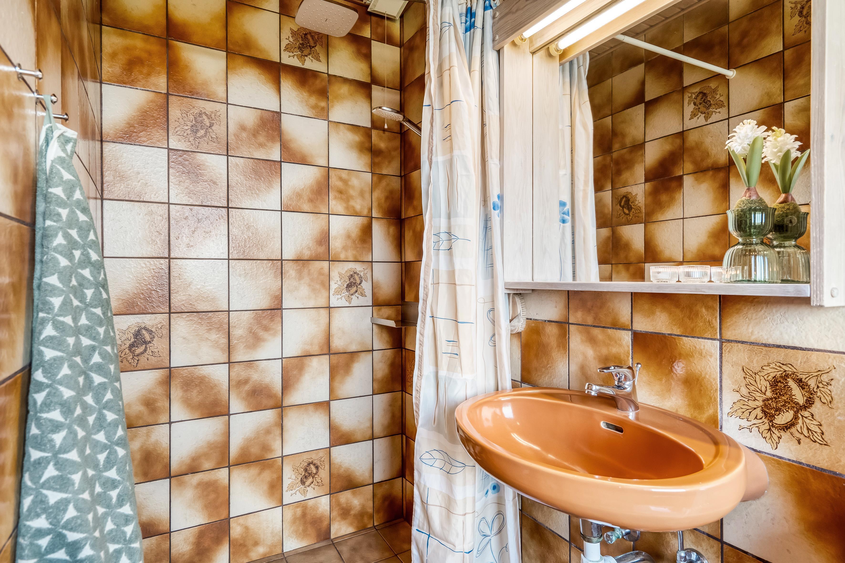 Das Badezimmer ist hell und einladend und bietet eine Dusche, Toilette und Fußbodenheizung sowie eine Badewanne, in der Sie sich nach einem aktiven Tag entspannen können.