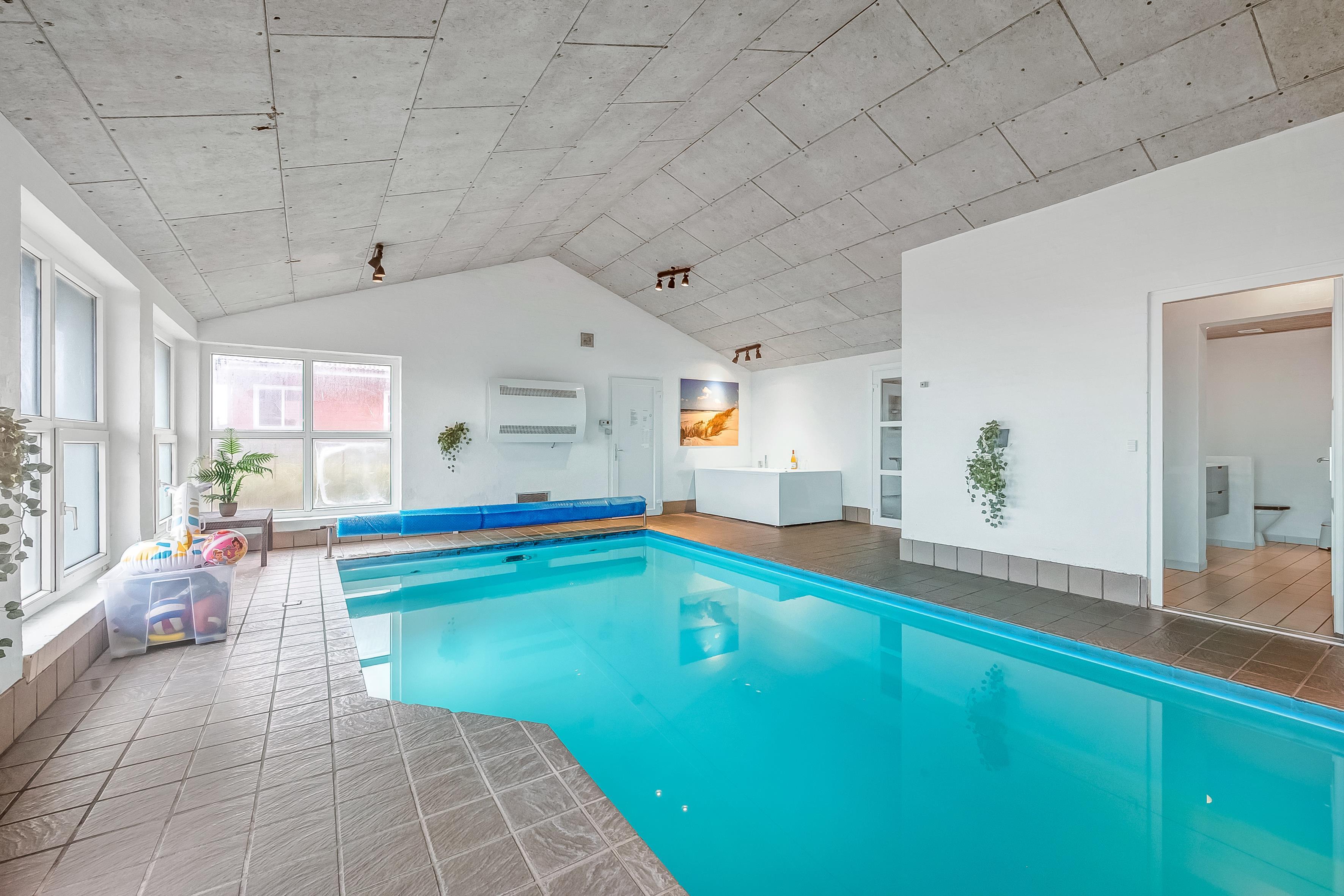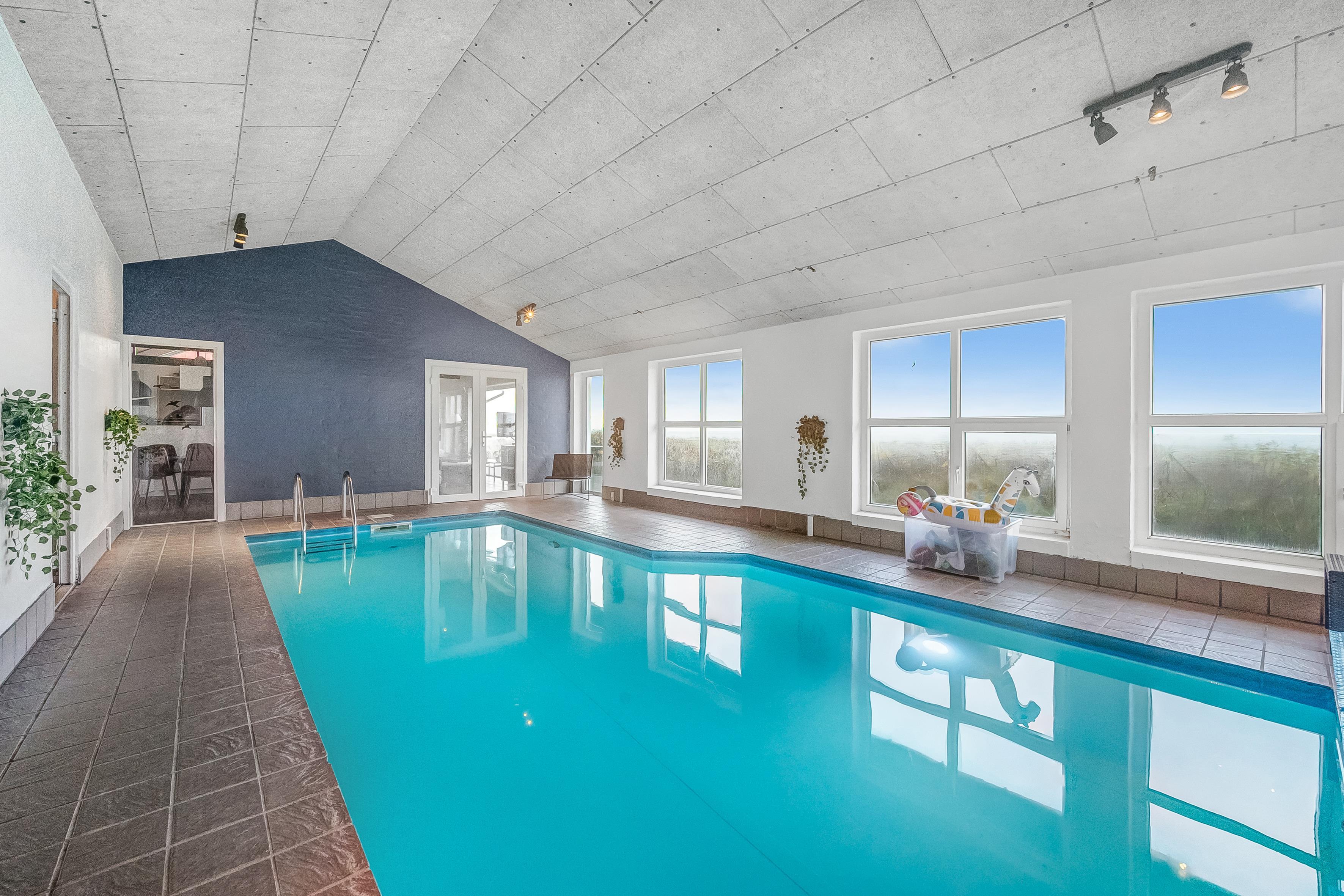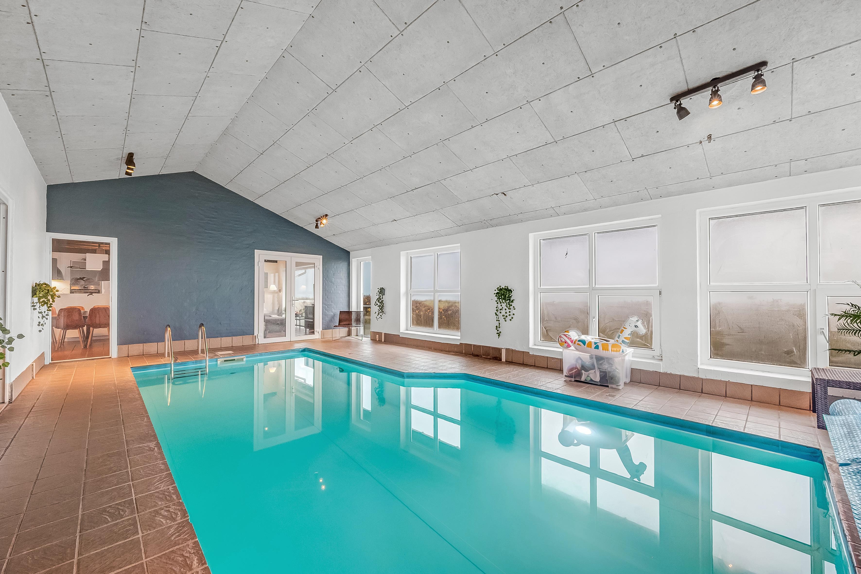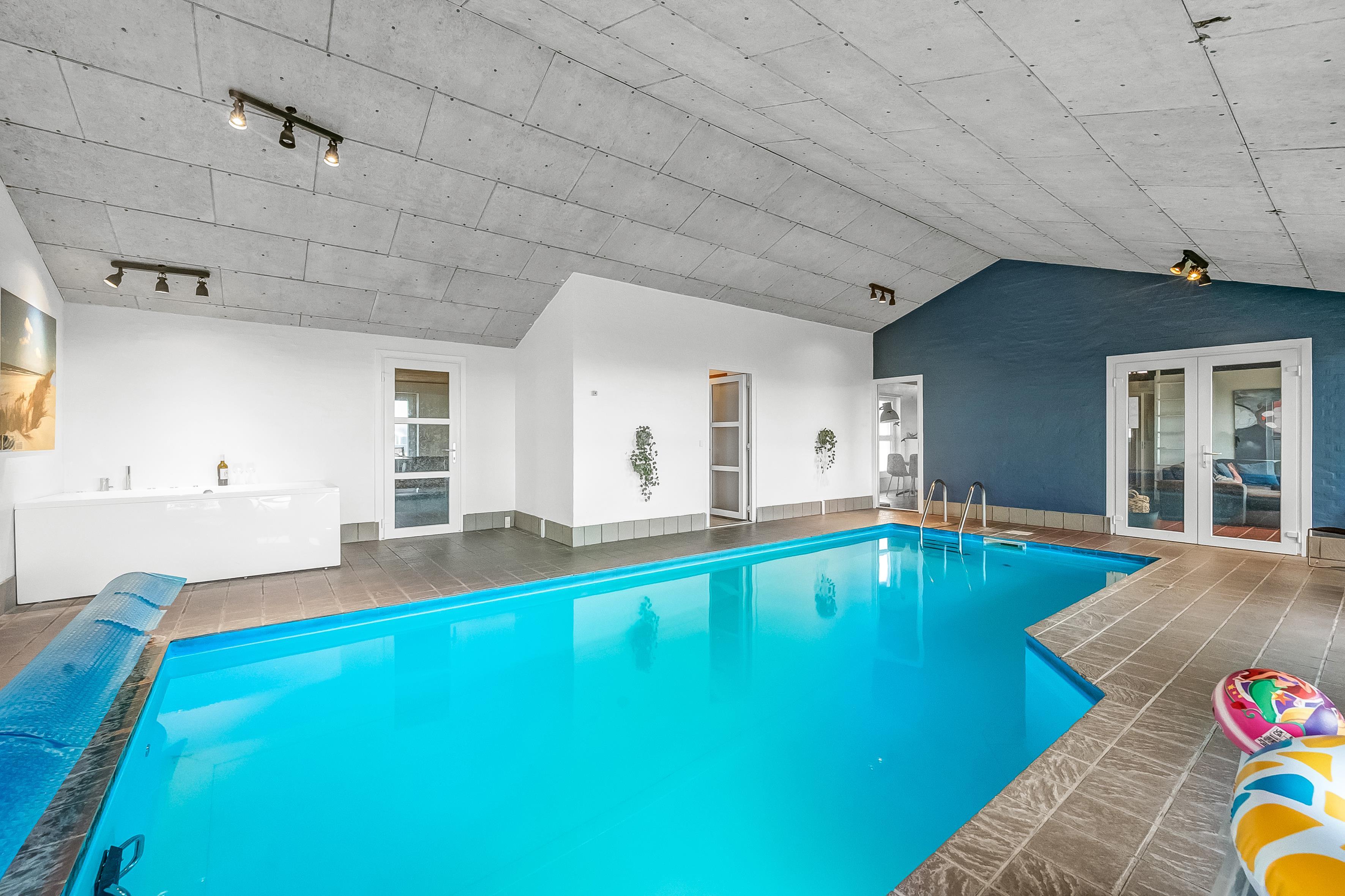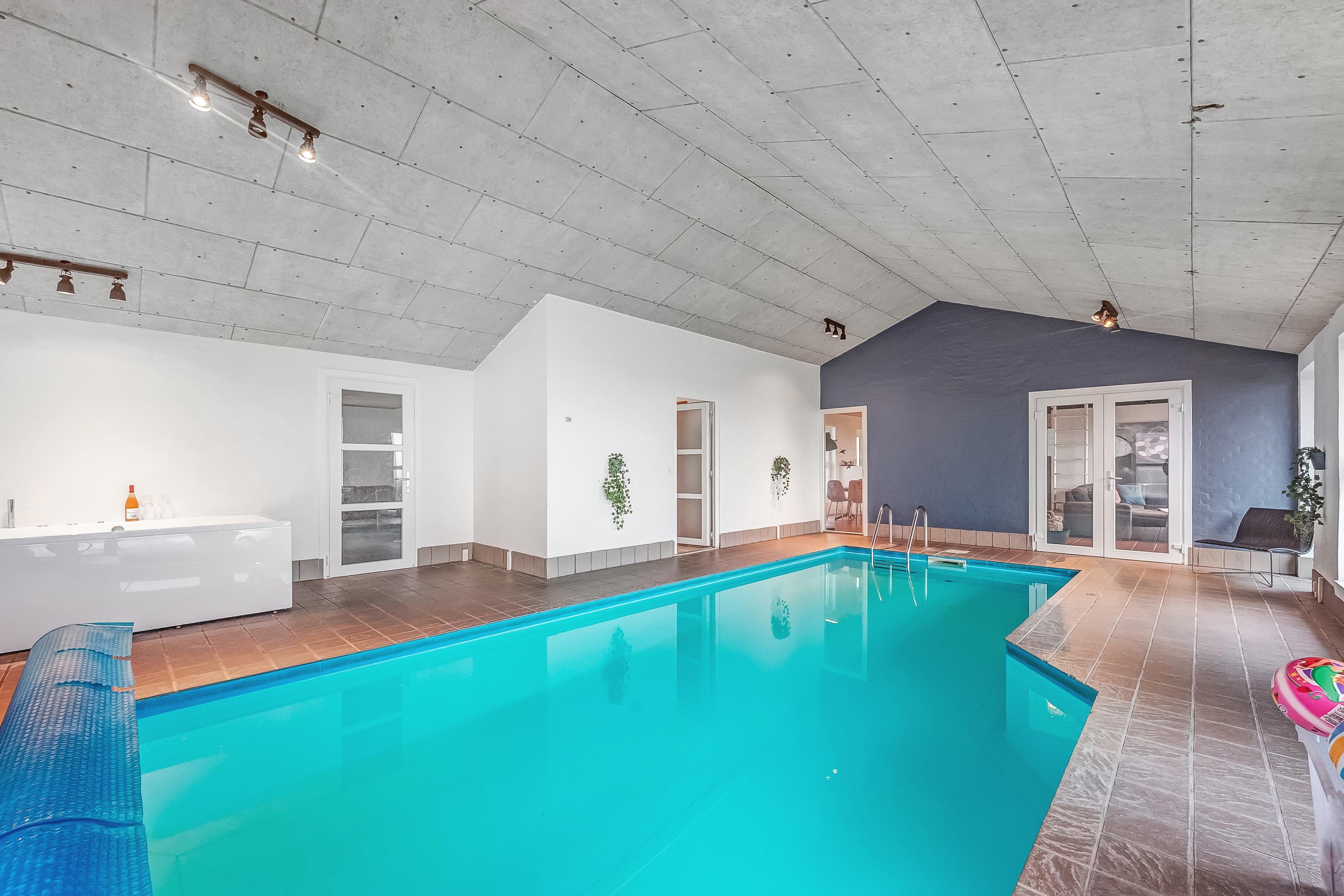 Im Inneren bietet das Ferienhaus viel Platz und Aktivitäten. Das Poolhaus verfügt über ein herrliches Schwimmbecken, in dem das Wasser immer angenehm warm ist – perfekt sowohl für Spiel als auch Entspannung. Außerdem können Sie sich im Aktivitätsraum des Hauses mit Billard, Dart und Tischfußball vergnügen. Die fünf geräumigen Schlafzimmer und der Dachboden sorgen für eine erholsame Nachtruhe für die ganze Familie, während der Innen-Whirlpool und die Sauna nach einem langen Tag in der Natur Entspannung und Wohlbefinden bieten.