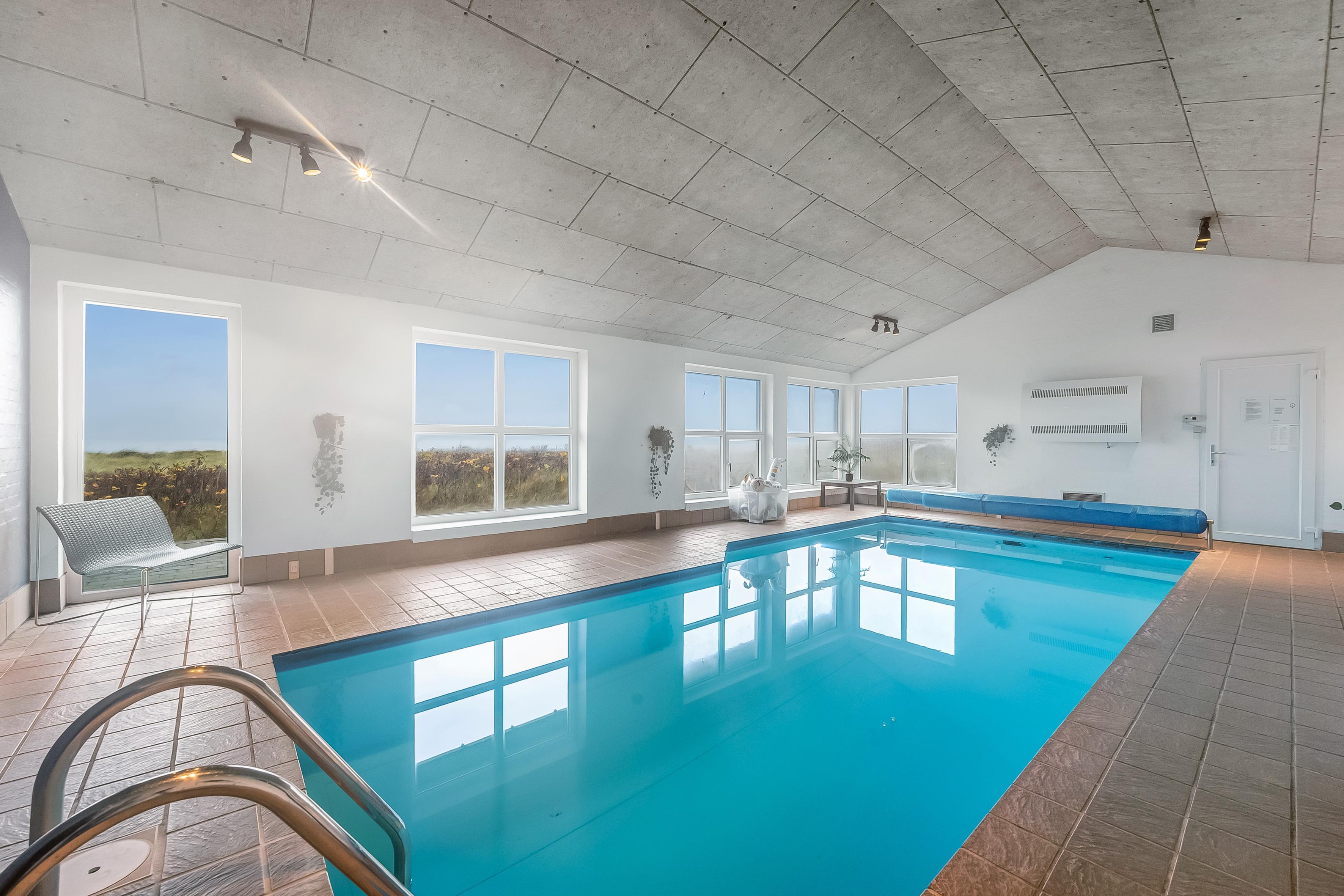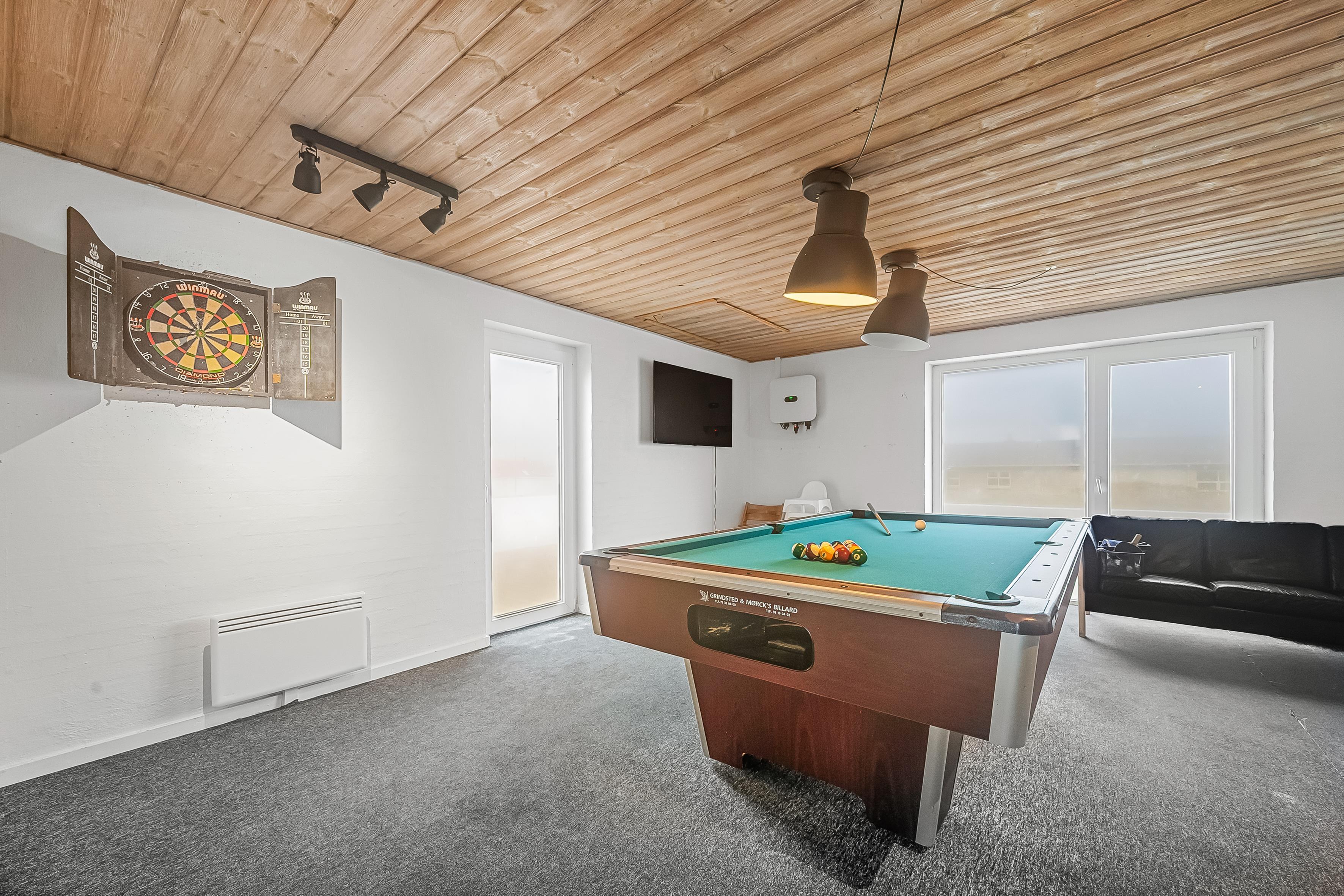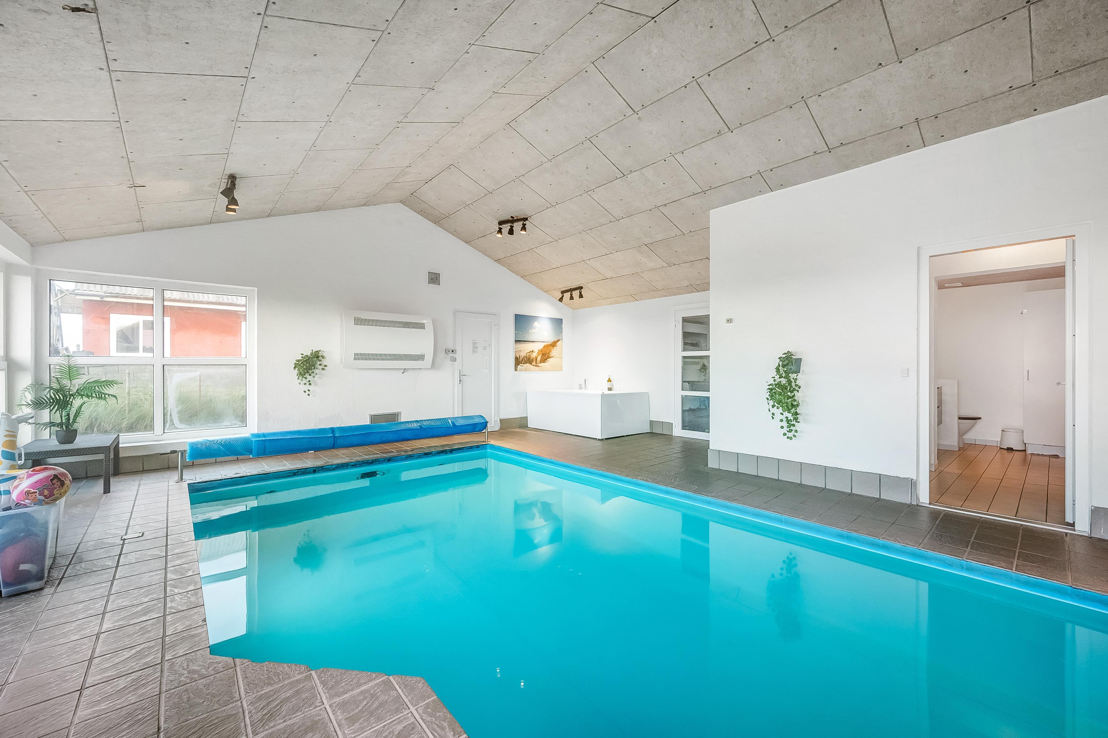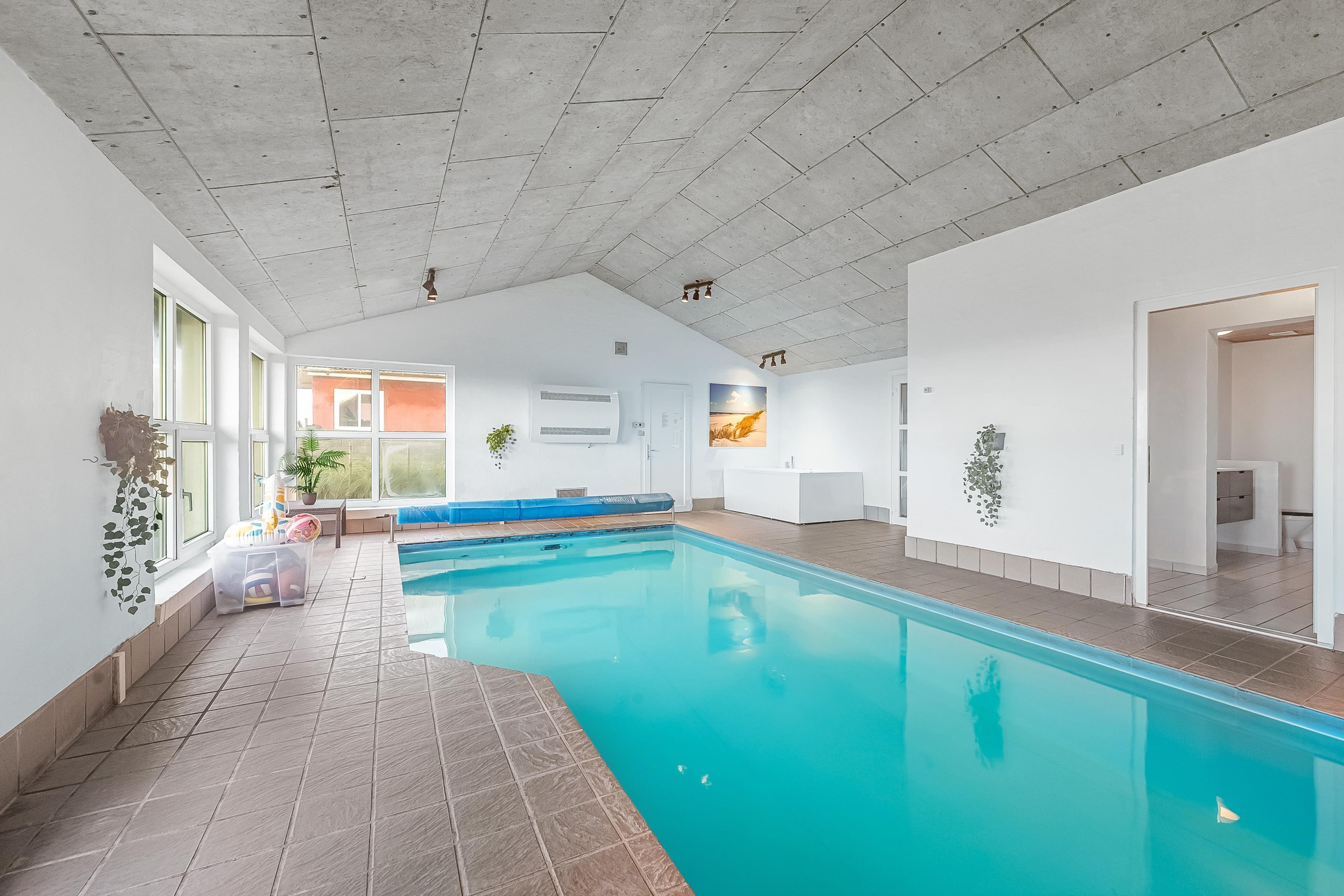 Im Inneren bietet das Ferienhaus viel Platz und Aktivitäten. Das Poolhaus verfügt über ein herrliches Schwimmbecken, in dem das Wasser immer angenehm warm ist – perfekt sowohl für Spiel als auch Entspannung. Außerdem können Sie sich im Aktivitätsraum des Hauses mit Billard, Dart und Tischfußball vergnügen. Die fünf geräumigen Schlafzimmer und der Dachboden sorgen für eine erholsame Nachtruhe für die ganze Familie, während der Innen-Whirlpool und die Sauna nach einem langen Tag in der Natur Entspannung und Wohlbefinden bieten.
