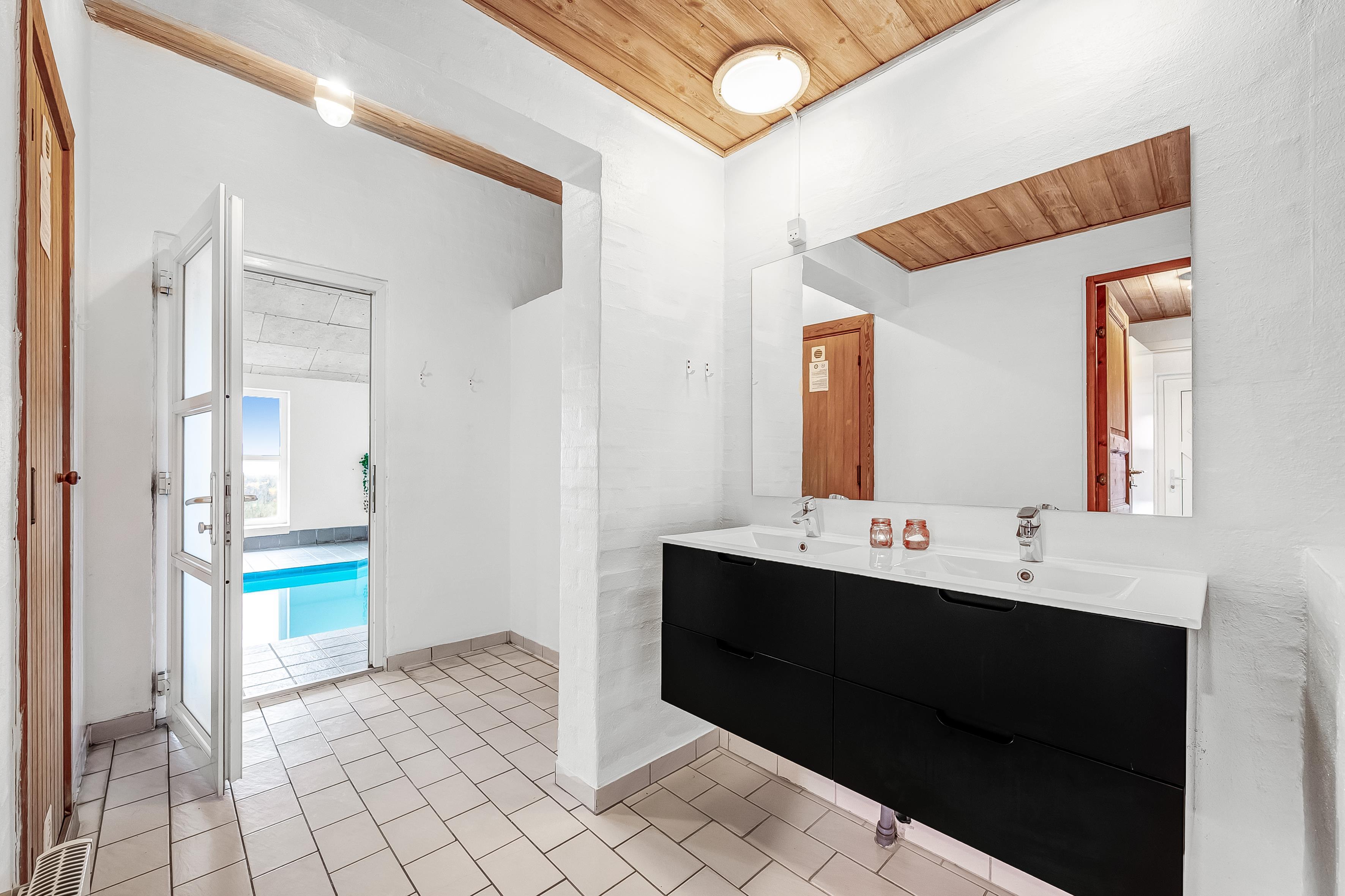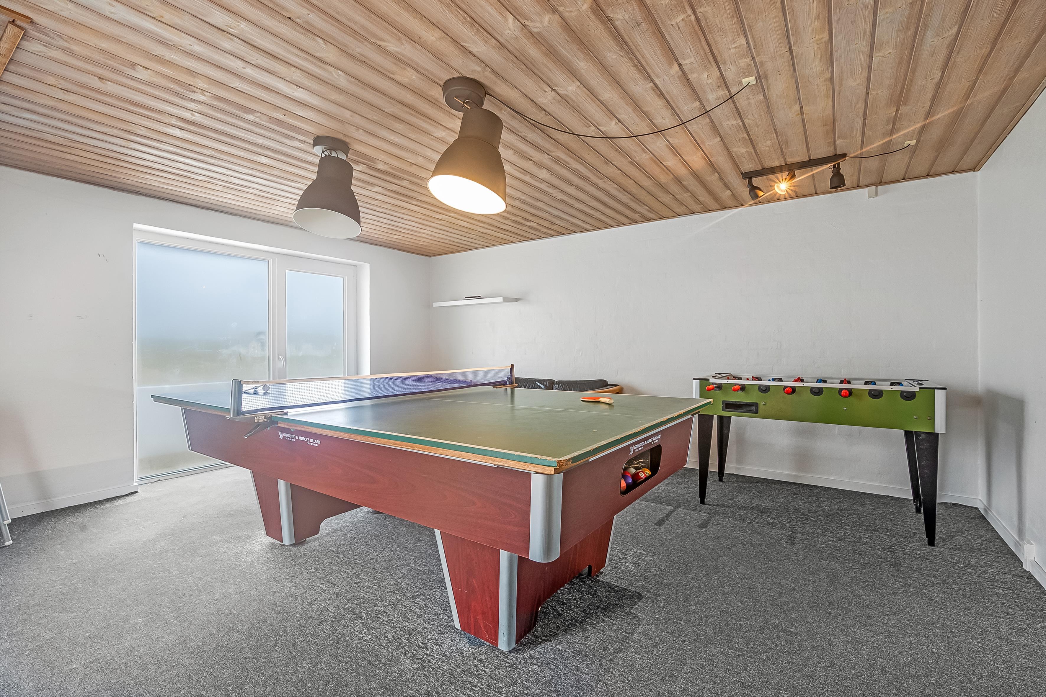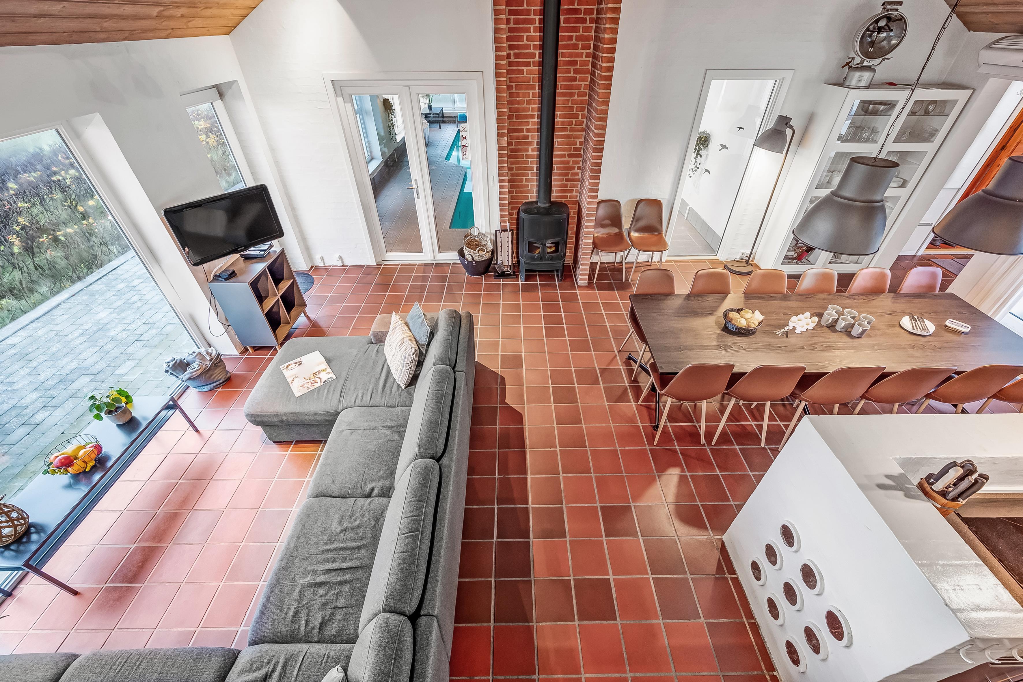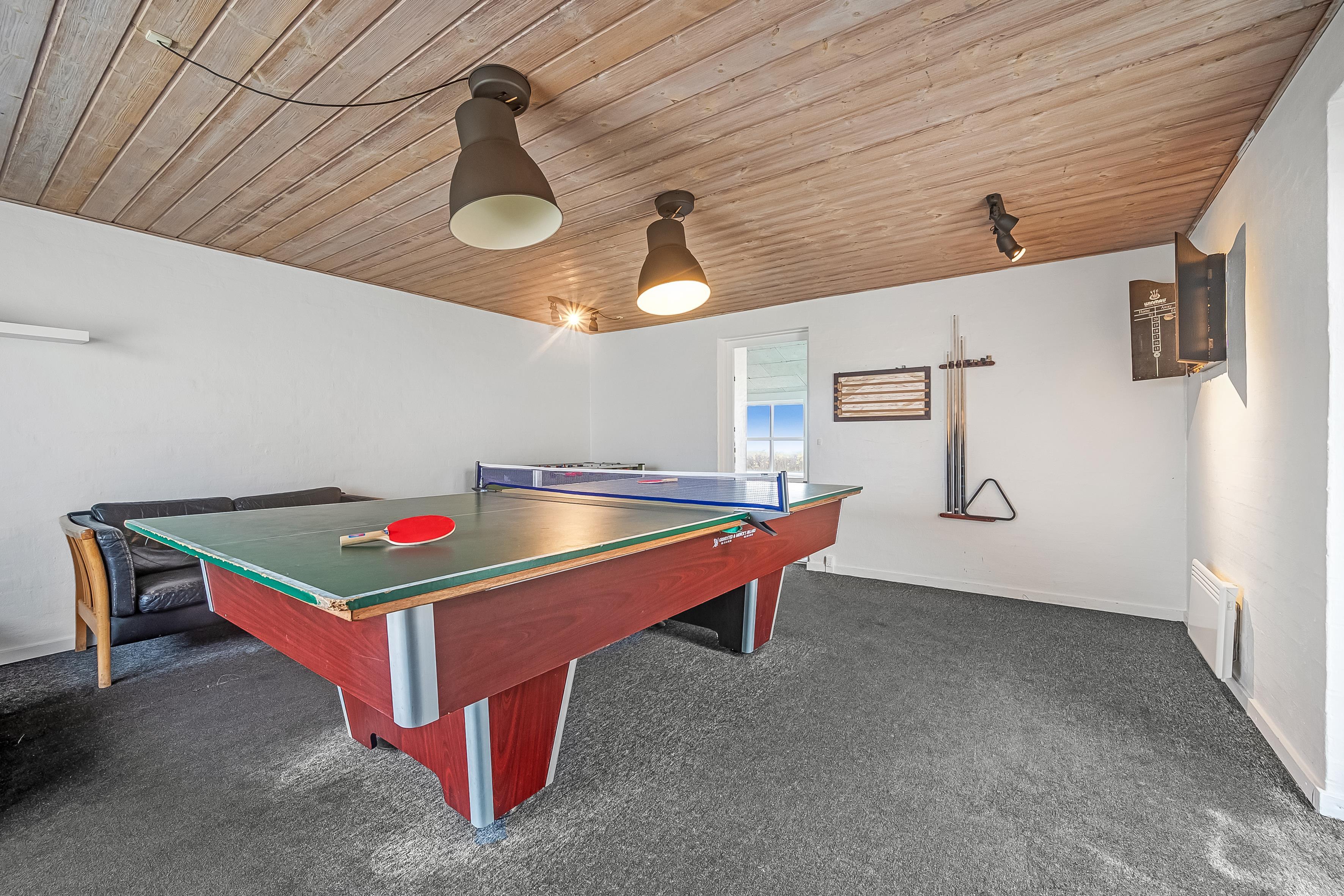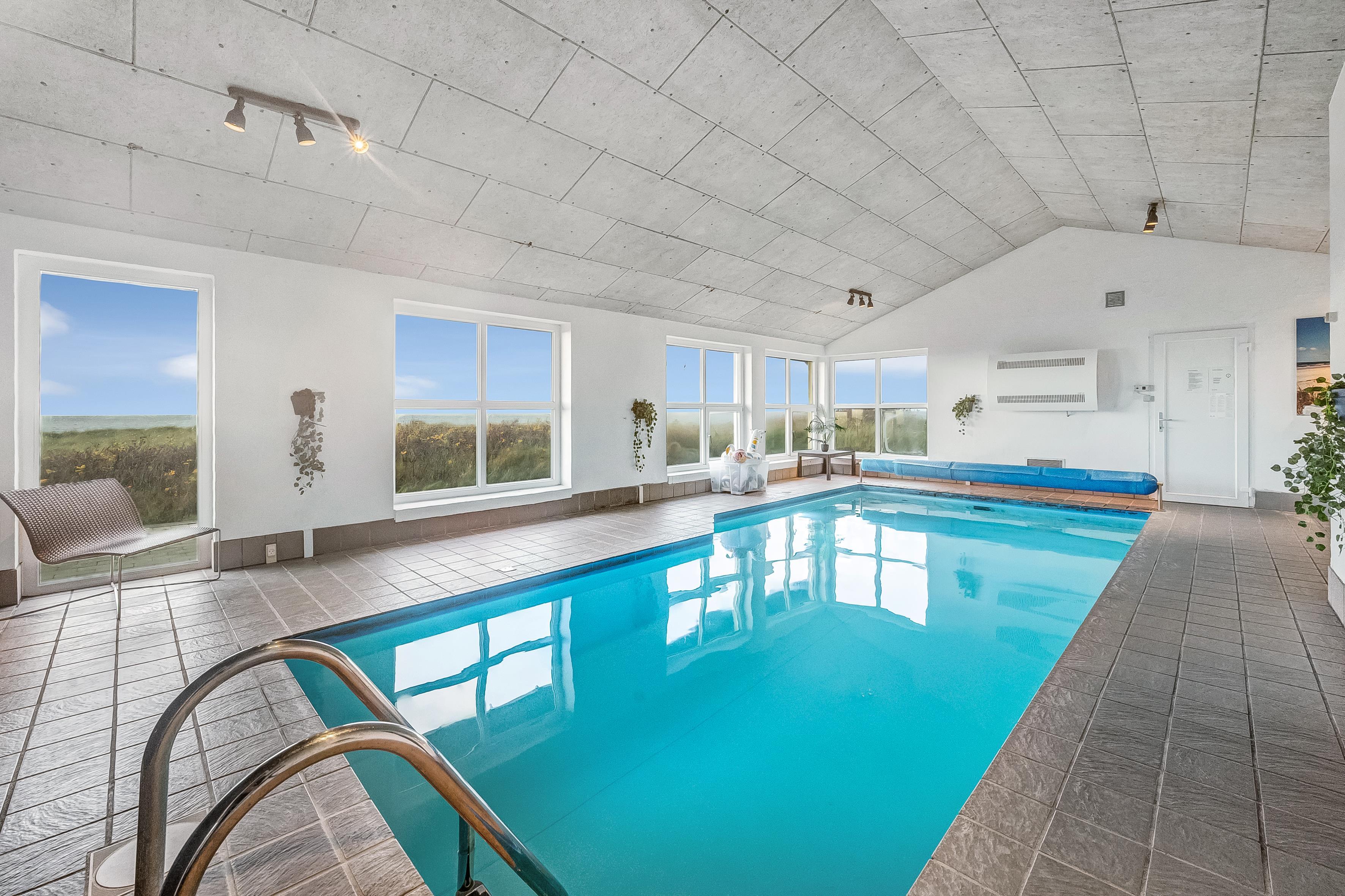 Im Inneren bietet das Ferienhaus viel Platz und Aktivitäten. Das Poolhaus verfügt über ein herrliches Schwimmbecken, in dem das Wasser immer angenehm warm ist – perfekt sowohl für Spiel als auch Entspannung. Außerdem können Sie sich im Aktivitätsraum des Hauses mit Billard, Dart und Tischfußball vergnügen. Die fünf geräumigen Schlafzimmer und der Dachboden sorgen für eine erholsame Nachtruhe für die ganze Familie, während der Innen-Whirlpool und die Sauna nach einem langen Tag in der Natur Entspannung und Wohlbefinden bieten.