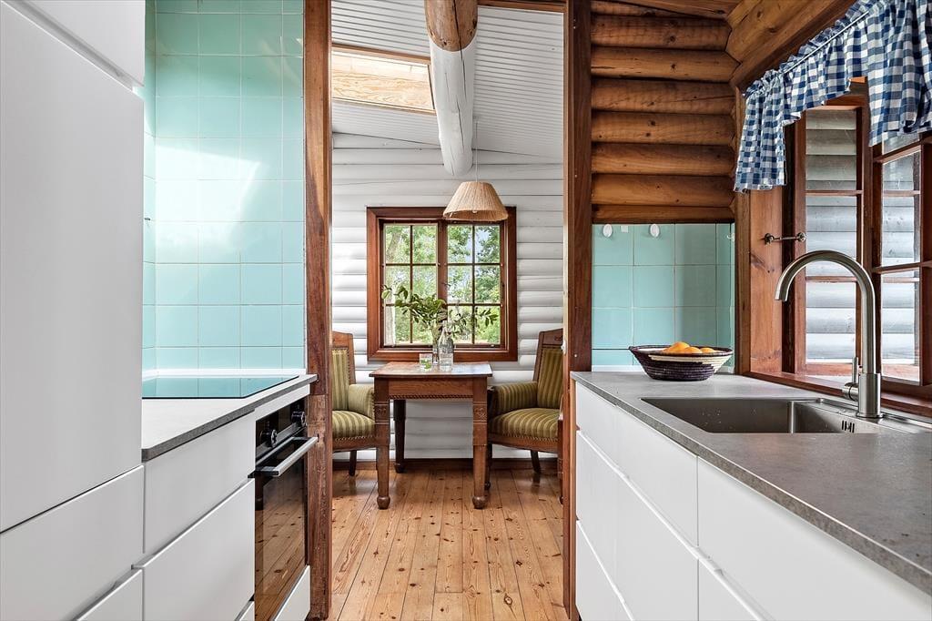 Der neuere Teil des Hauses öffnet sich hell und freundlich – mit einem modernen Wohnraum, in dem das Doppelbett im natürlichen Tageslicht steht, und einem stilvollen Badezimmer. Die schlichte, luftige Gestaltung bildet einen ruhigen Kontrast zum traditionellen Bereich, und gemeinsam verleihen die beiden Stile dem Haus eine besondere, fast filmreife Atmosphäre – wie eine dänische Version von „High Chaparral“.