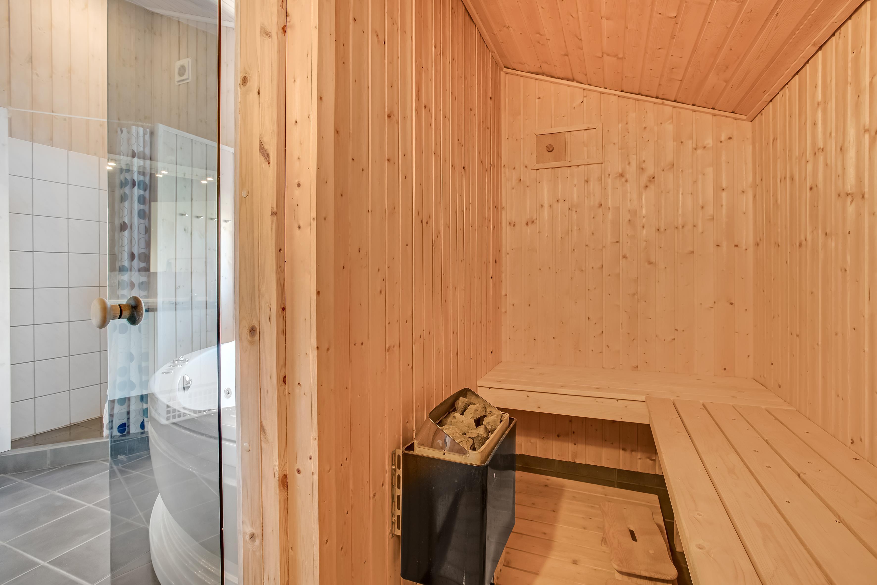 Das Badezimmer verfügt über eine Duschkabine, ein WC sowie Fußbodenheizung. Außerdem gibt es im Haus eine Sauna, in der Sie sich nach einem Tag am Meer entspannen können. Zusätzlich steht ein Innen-Whirlpool für 2 Personen zur Verfügung.