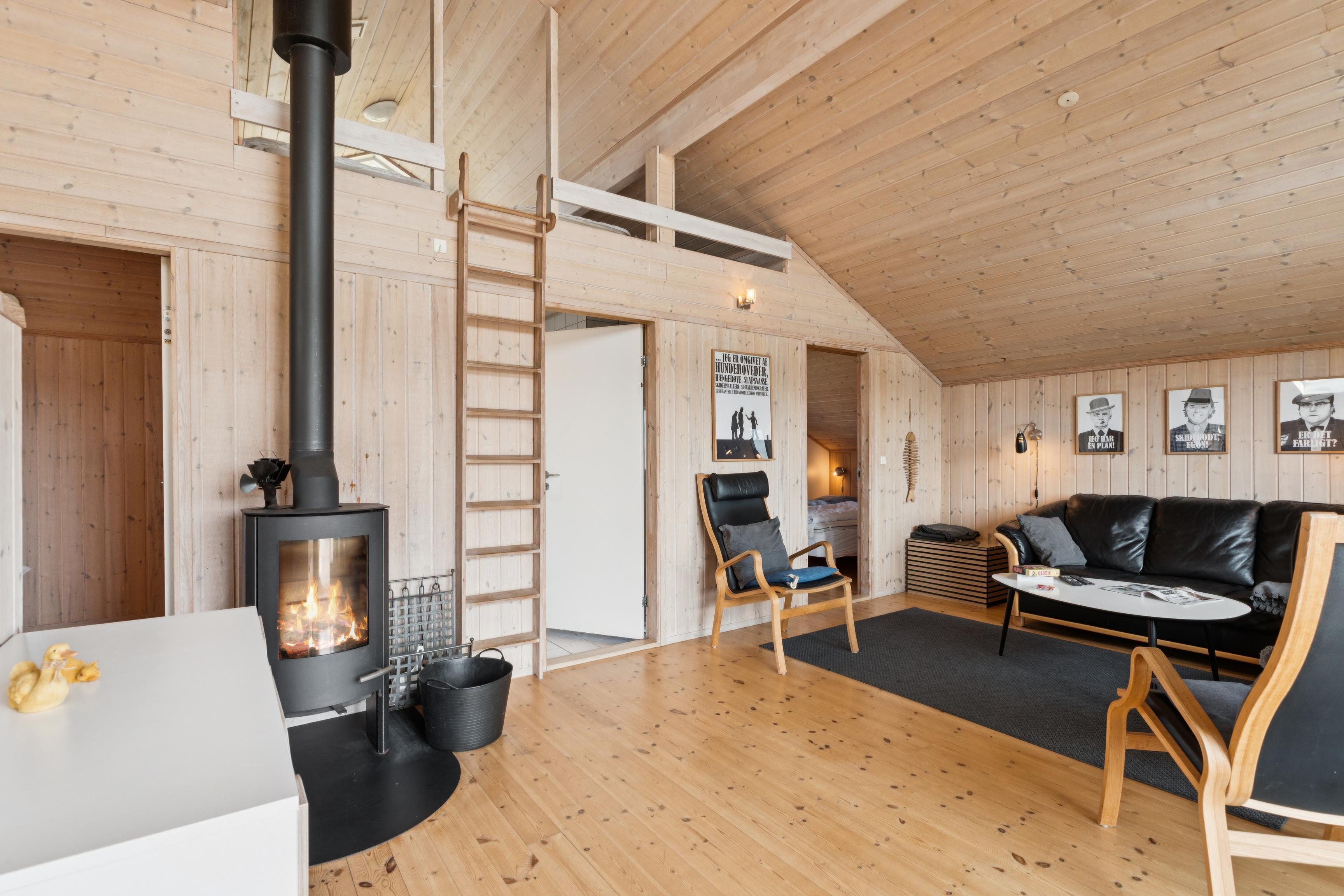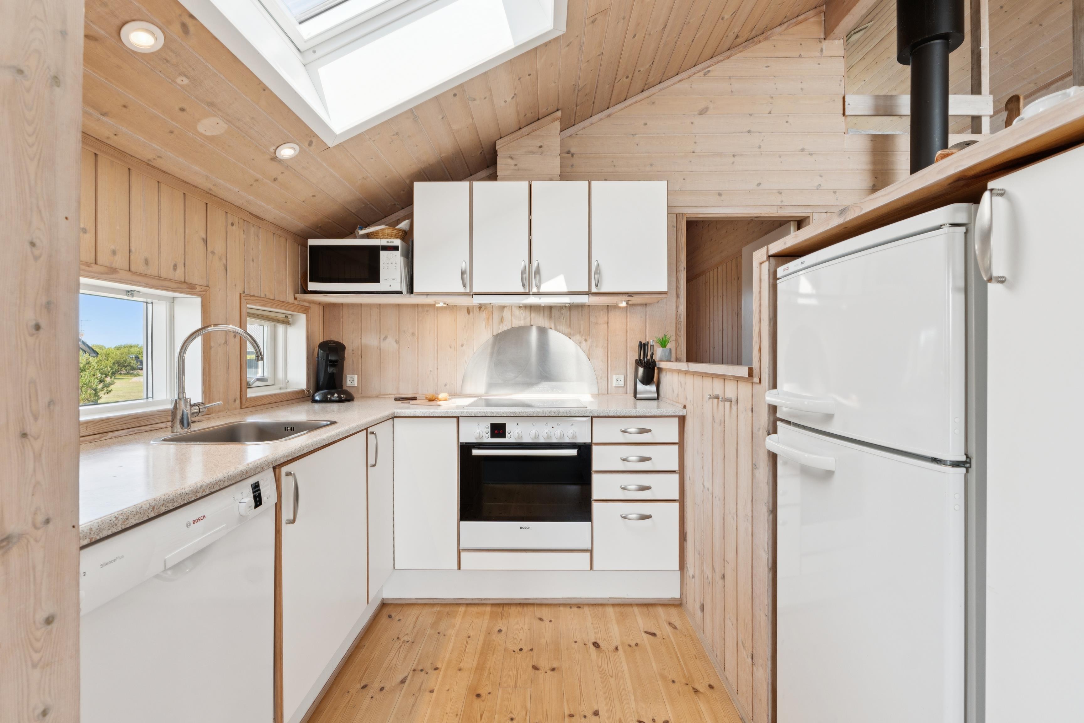 Der offene Wohn-/Essbereich mit Kaminofen lädt zum verweilen und geselligen Abend ein und geht übergangslos in die moderne Küche über. Diese ist mit einem Cerankochfeld, Spülmaschine, Mikrowelle, Kaffeepadmaschine und einem großen Kühlschrank mit Gefrierfach ausgestattet. Die Zubereitung eurer Mahlzeiten geht hier ganz leicht von der Hand. Das Ferienhaus hat zwei komfortable Schlafzimmer die mit je einem Doppelbett und Schränken für genug Stauraum ausgestattet sind. Auf dem Dachboden, der über eine Leiter zu erreichen ist, gibt es 2 weitere Schlafmöglichkeiten.
