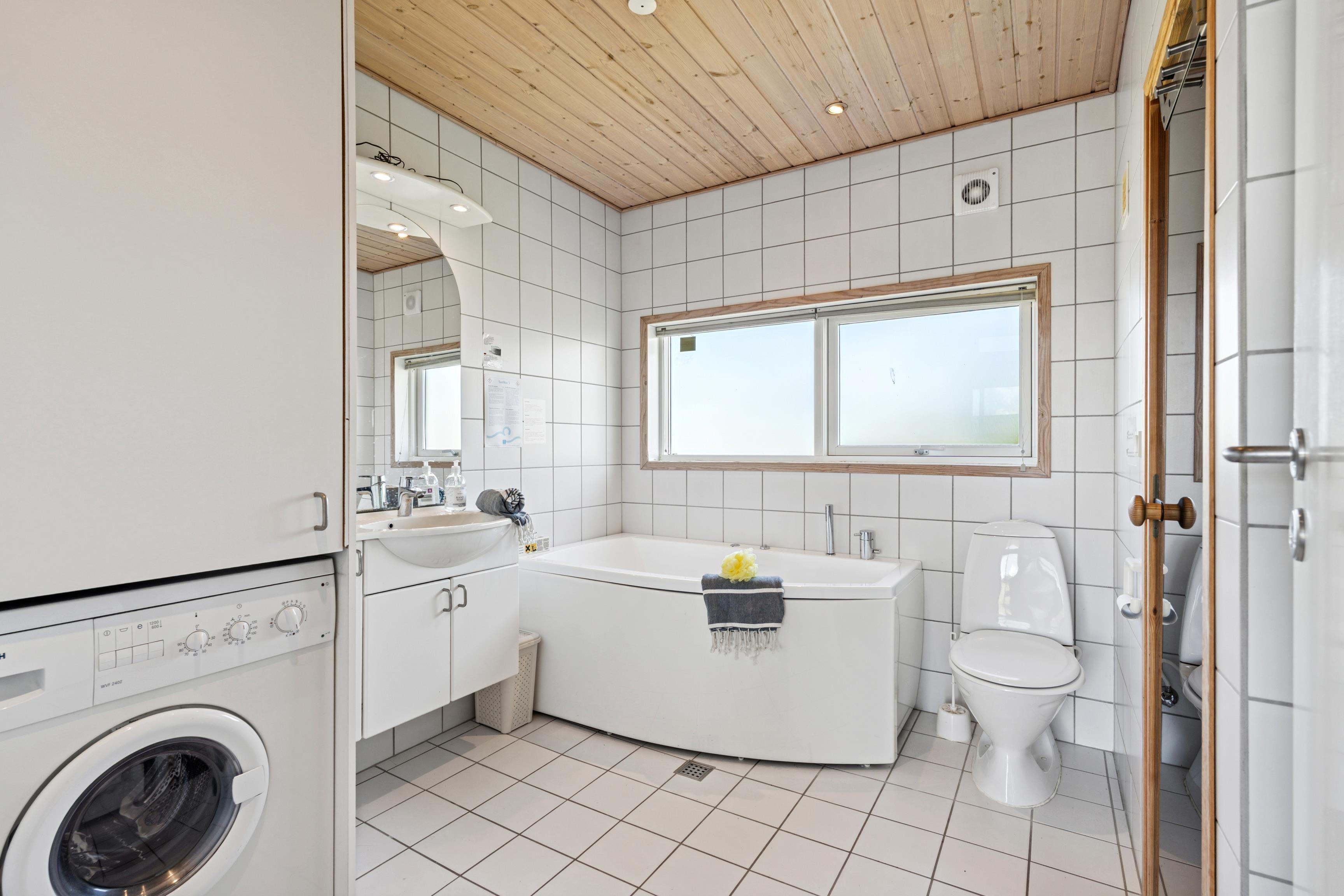 Das Badezimmer ist mit Fußbodenheizung und Whirlpool sowie Sauna ausgestattet - ideal zum Entspannen nach einem aktiven Tag an dem 200 m entfernten Angelsee oder dem 800 m entfernten Golfplatz. Relaxt nach einem Saunagang draußen auf den Sonnenliegen, die auf der großen nach Süden ausgerichteten Terrasse bereit stehen oder grillt dort eueren selbstgefangenen Fisch und genießt den Abend mit einem guten Glas Wein und Freunden. Hier könnt ihr sowohl morgens den Sonnenaufgang als auch Abends den Sonnenuntergang bewundern.