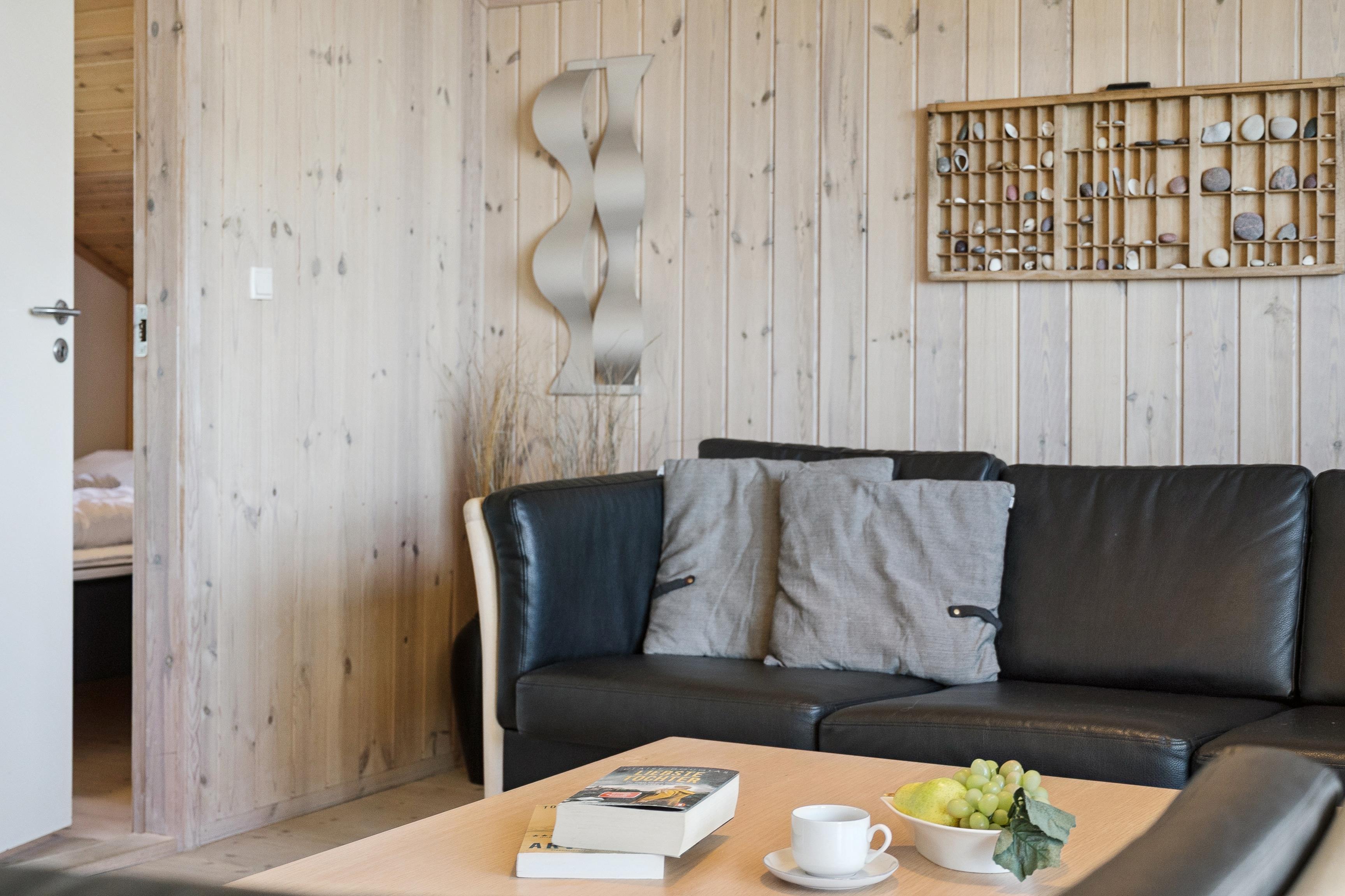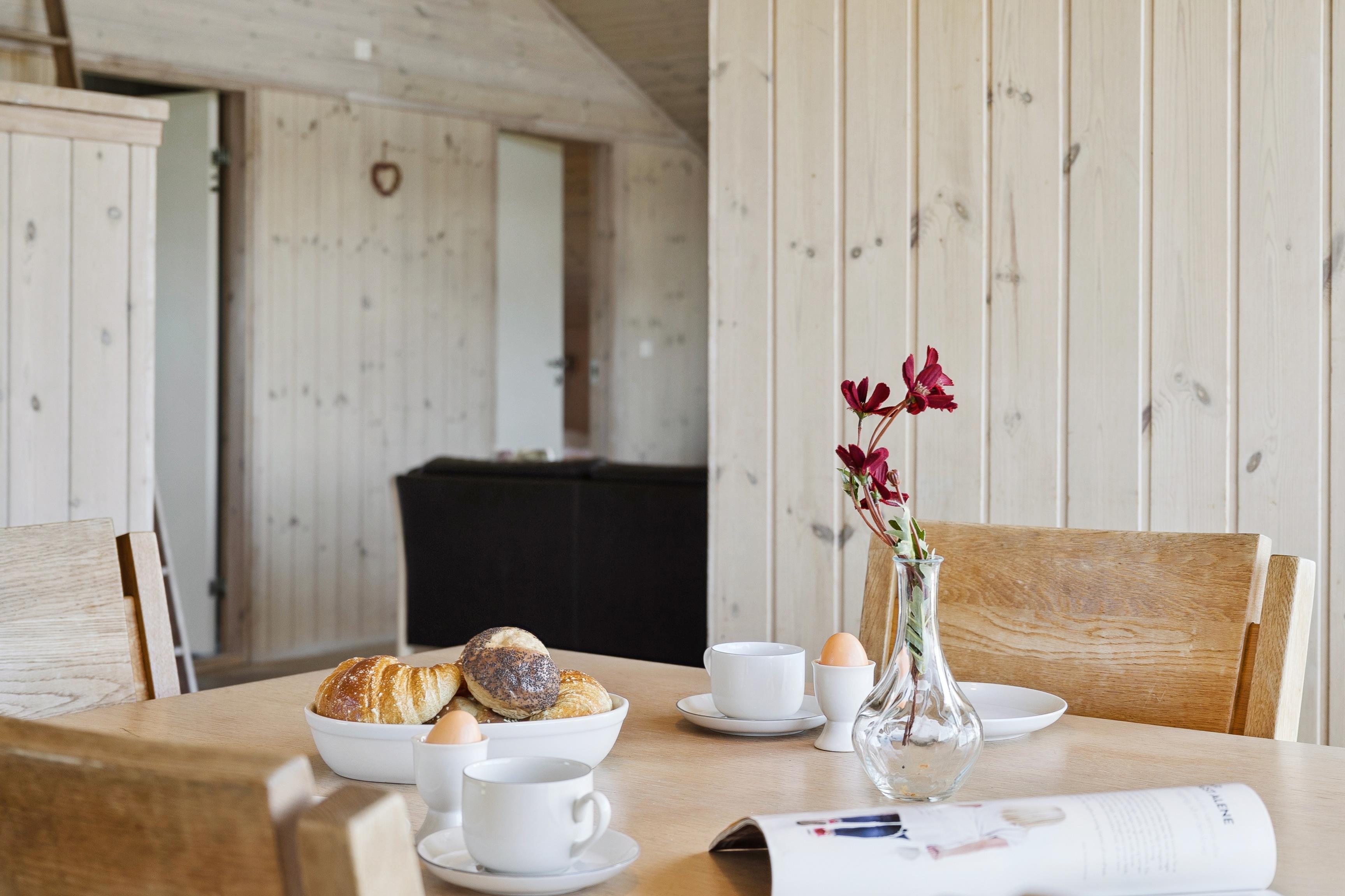 Der offene Wohn-/Essbereich mit Kaminofen lädt zum verweilen und geselligen Abend ein und geht übergangslos in die moderne Küche über. Diese ist mit einem Cerankochfeld, Spülmaschine, Mikrowelle, Kaffeepadmaschine und einem großen Kühlschrank mit Gefrierfach ausgestattet. Die Zubereitung eurer Mahlzeiten geht hier ganz leicht von der Hand. Das Ferienhaus hat zwei komfortable Schlafzimmer die mit je einem Doppelbett und Schränken für genug Stauraum ausgestattet sind. Auf dem Dachboden, der über eine Leiter zu erreichen ist, gibt es 2 weitere Schlafmöglichkeiten.
