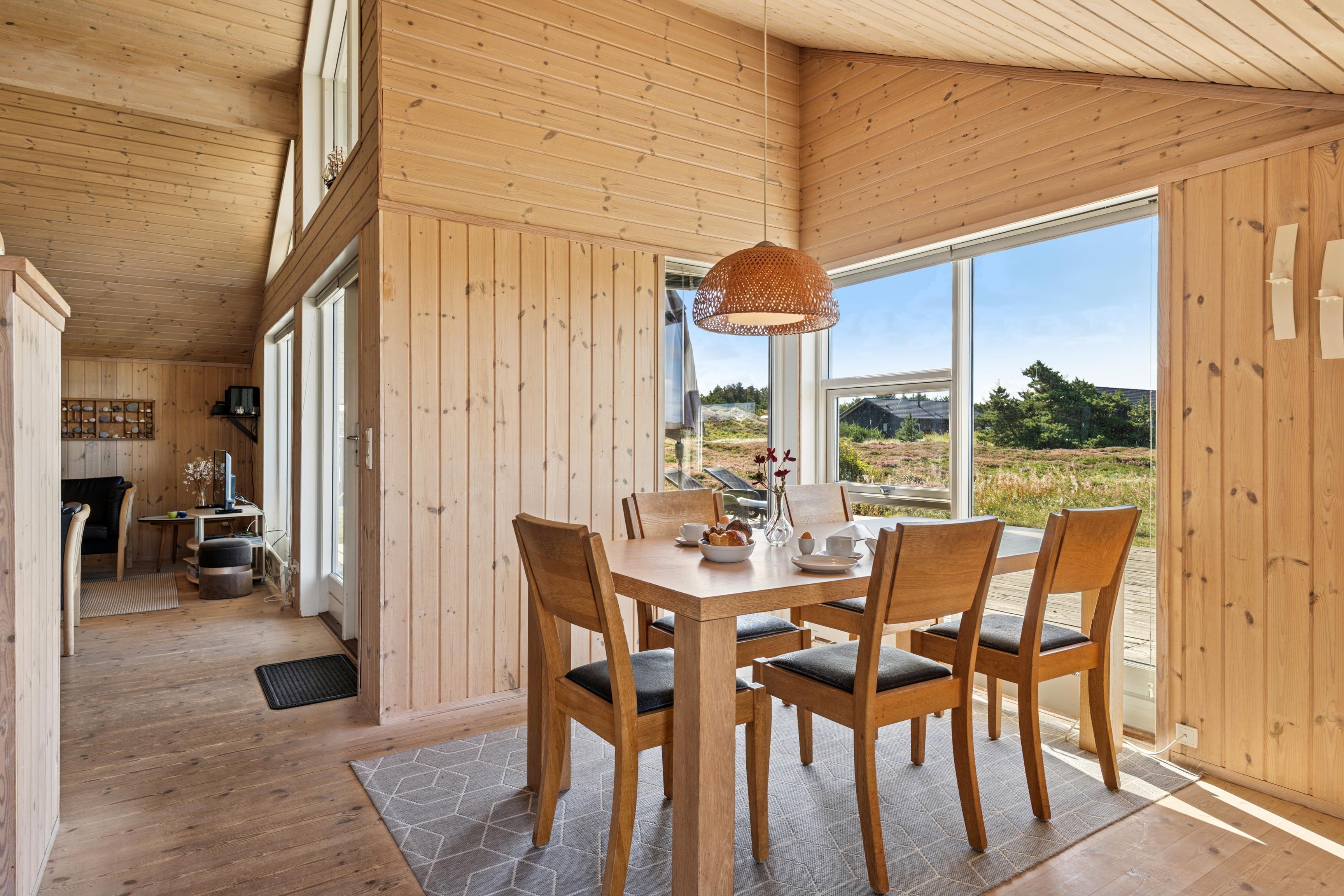 Dieses gemütliche 70 m² Ferienhaus mit Whirlpool und Sauna liegt in der landschaftlich reizvollen Lodbjerg-Hede - nur einen Steinwurf vom Angelsee Lodbjerg Hede Ørredsø entfernt. Der Holmland Klit Golfclub mit 18 Löchern und Café ist in nur knapp 1,5 km vom Haus erreichbar. Große Fenster, die viel Tageslicht hereinlassen schaffen eine helle und einladende Atmosphäre. Das Haus ist innen komplett mit Naturholz verkleidet und vom Essbereich aus habt ihr einen fantastischen Blick über die westjütländische Landschaft.