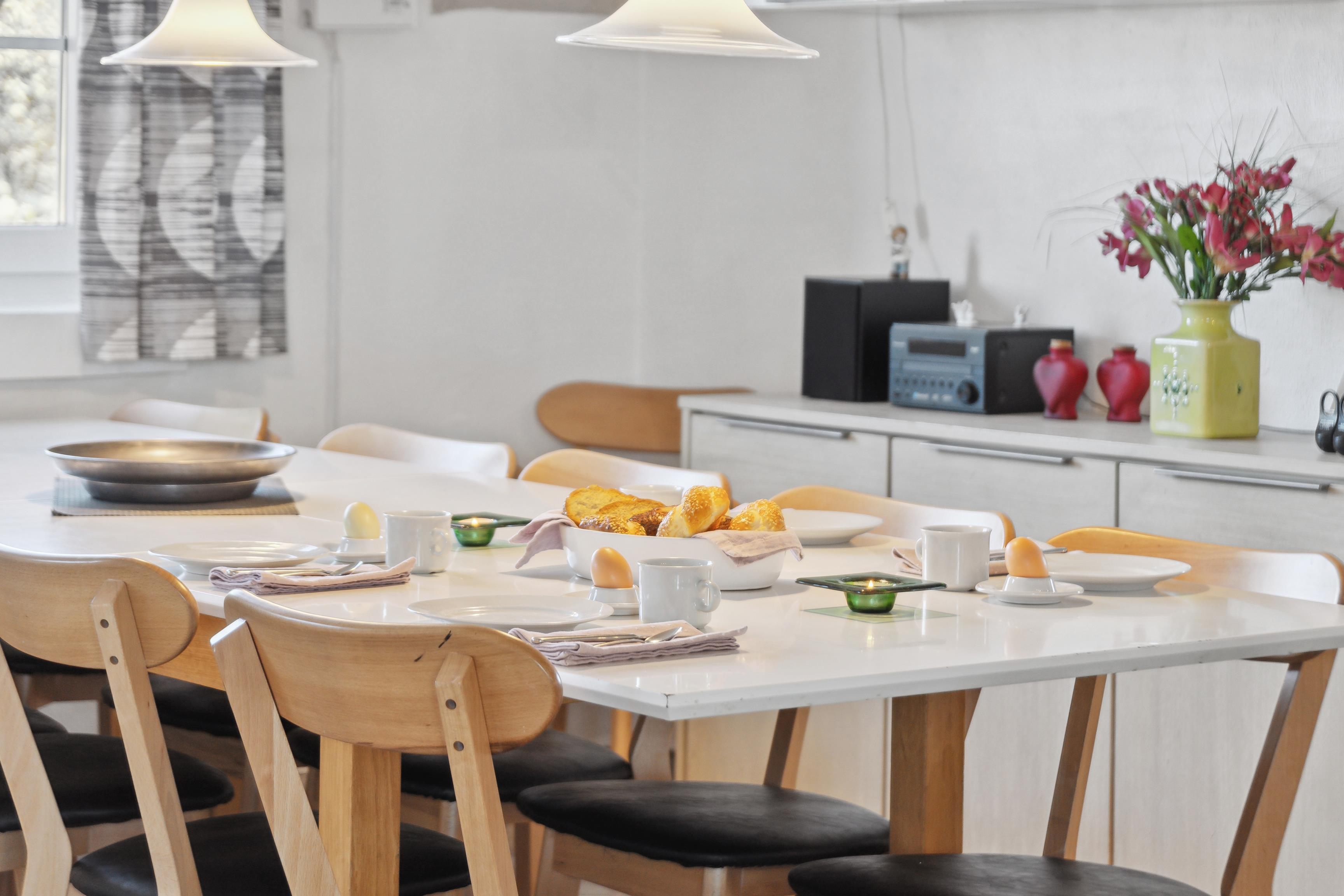 Die Küche ist mit allem ausgestattet, was Sie benötigen um sich selbst zu versorgen. Eine Spülmaschine, Backofen, Kühlschrank und ein Gefrierfach mit 2 Schubladen mit ca. 40 Litern runden die Ausstattung ab. Außerdem steht euch eine Waschmaschine und ein Wäschetrockner zur Verfügung. Im Wohnbereich könnt ihr vor dem Fernseher entspannen, am großen Tisch interessante Gespräche führen oder dort zusammen einen Spieleabend verbringen. Ein Tischfußball (Kicker) sorgt für unterhaltsame Momente und freundschaftliche Wettkämpfe.