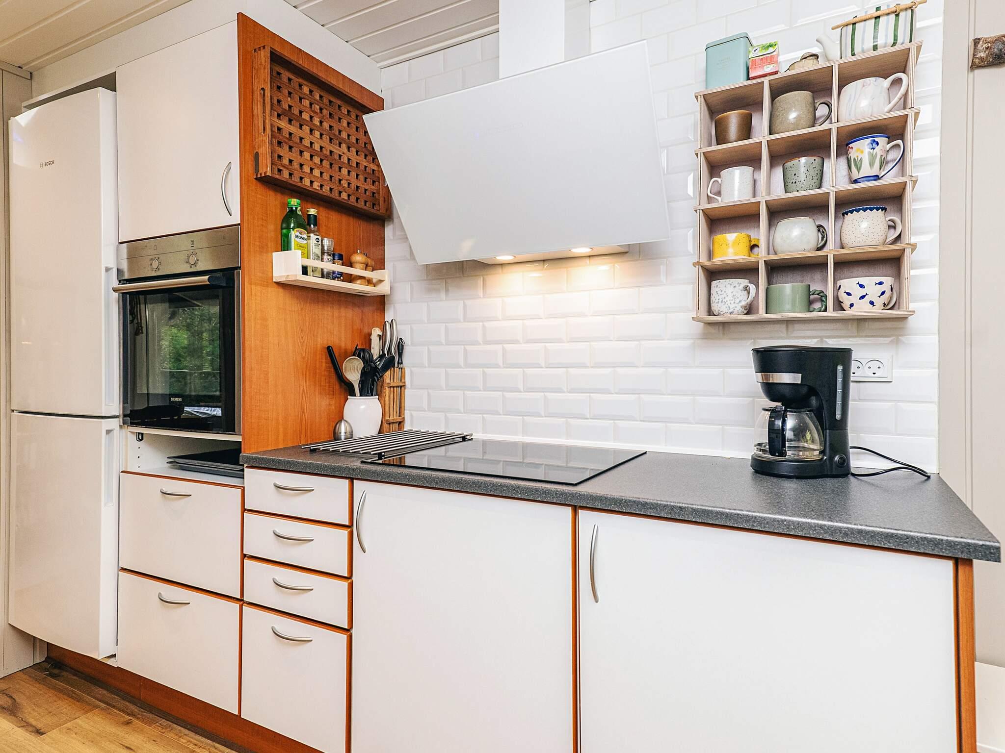 Die Küche ist komplett ausgestattet mit Kühlschrank, Gefrierschrank, Backofen, Geschirrspüler, Elektroherd, Dunstabzugshaube, Mikrowelle sowie verschiedenen Küchengeräten und -utensilien.