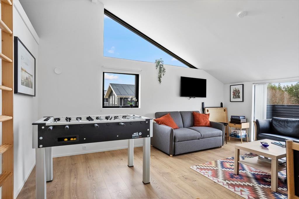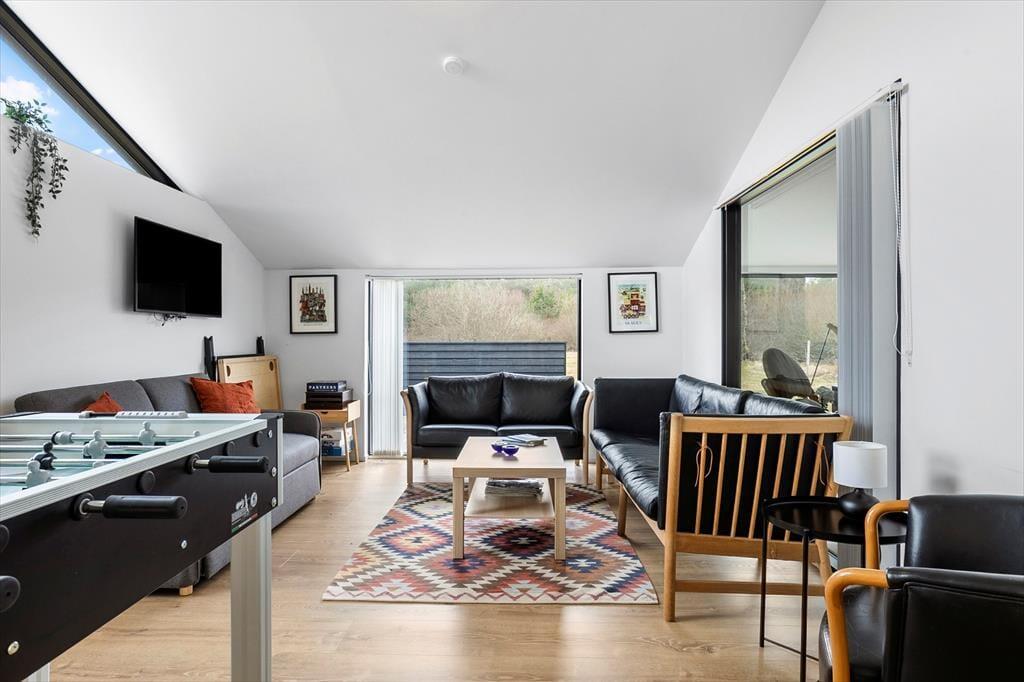Drinnen erwartet Sie ein geräumiges und gut ausgestattetes Ferienhaus mit Platz für Gemütlichkeit und gemeinsame Aktivitäten. Das Wohnzimmer lädt zum Entspannen mit einem guten Film oder einem Spieleabend ein, und die große Küche macht es leicht, sich gemeinsam beim Kochen zu versammeln. Das Haus verfügt außerdem über einen Aktivitätsraum, in dem Sie sich mit Familie und Freunden in lustigen Spielen messen oder vor dem Fernseher entspannen können. Wenn Sie einen vierbeinigen Freund mit in den Urlaub nehmen möchten, ist das kein Problem – Hunde sind hier herzlich willkommen.