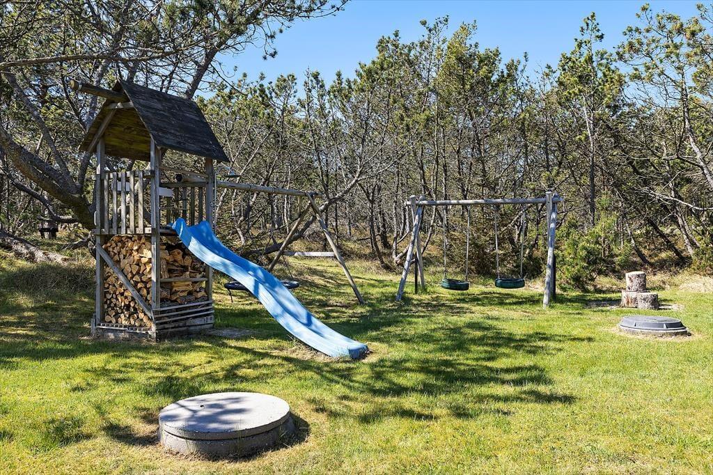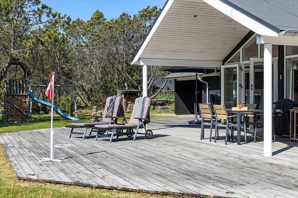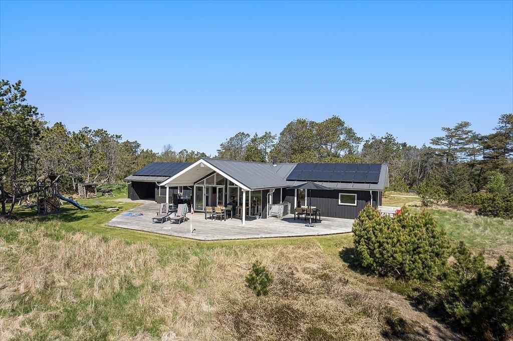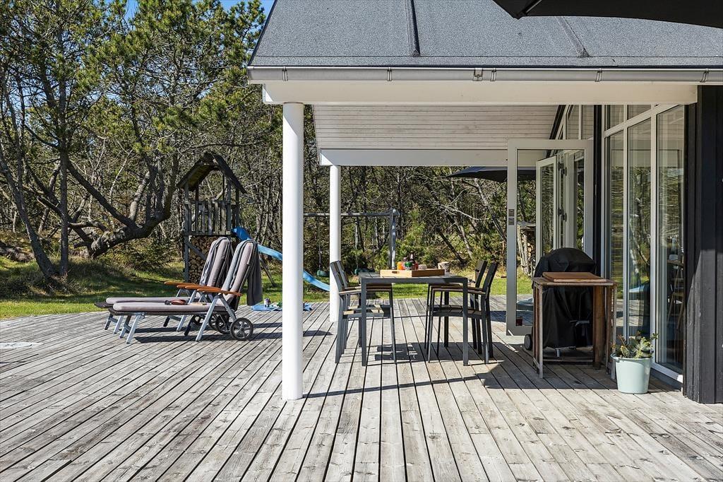 Das Leben unter freiem Himmel steht im Mittelpunkt – das zeigt sich deutlich an den schönen Terrassenbereichen, die das Haus umgeben und das Draußensein vom Morgen bis zum Abend ermöglichen. Hier kannst du deinen Morgenkaffee mit Blick in die Natur genießen, ein Nickerchen im Liegestuhl machen oder das Abendessen auf dem Grill zubereiten, während die Kinder auf dem großen Rasen frei spielen. Es gibt Schaukeln, viel Platz für Ballspiele und zahlreiche Möglichkeiten, je nach Tageszeit und Stimmung einen sonnigen oder schattigen Platz zu finden. Die grüne Umgebung strahlt eine besondere Ruhe aus, und mit Wald, Dünenlandschaft und Vogelgezwitscher im Hintergrund fällt es leicht, zur Ruhe zu kommen und den Moment zu genießen. Die großzügigen Terrassen machen es einfach, bei jedem Wetter draußen zu sein – vielleicht sogar mit einem Glas Wein unter freiem Himmel, während die Abendsonne langsam hinter dem Horizont verschwindet.
