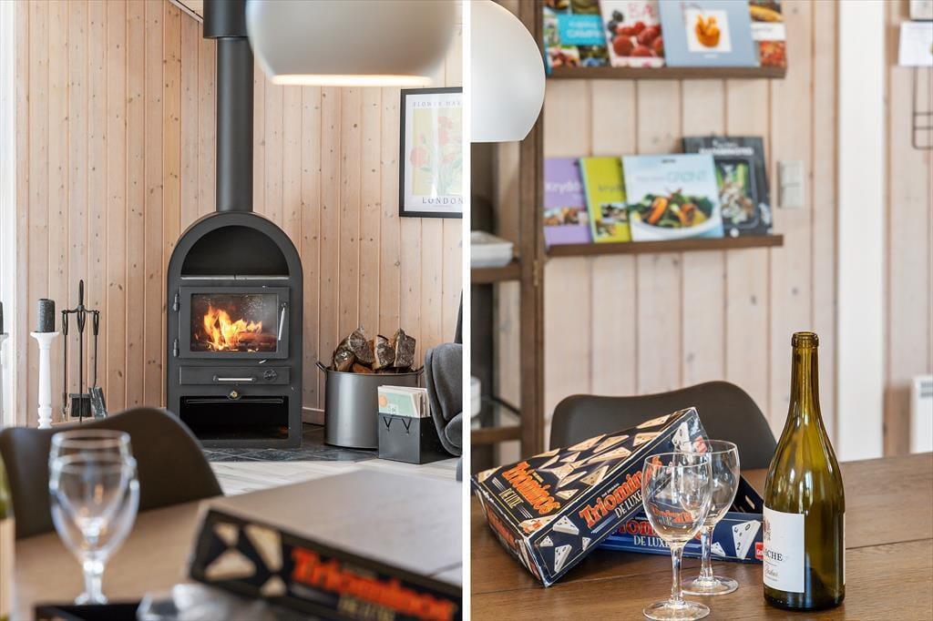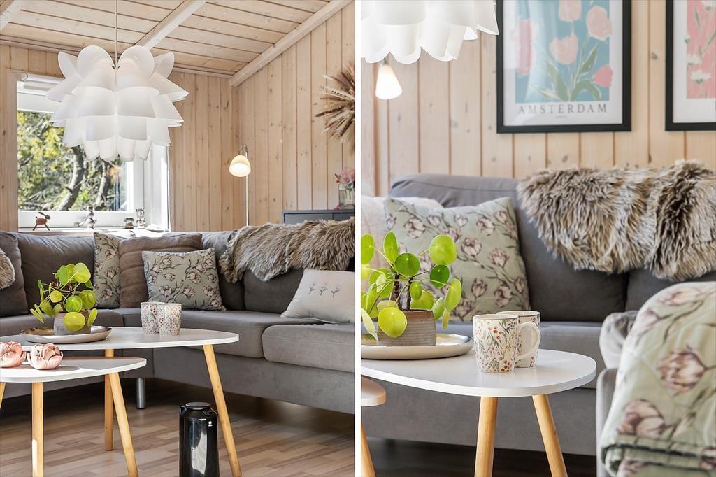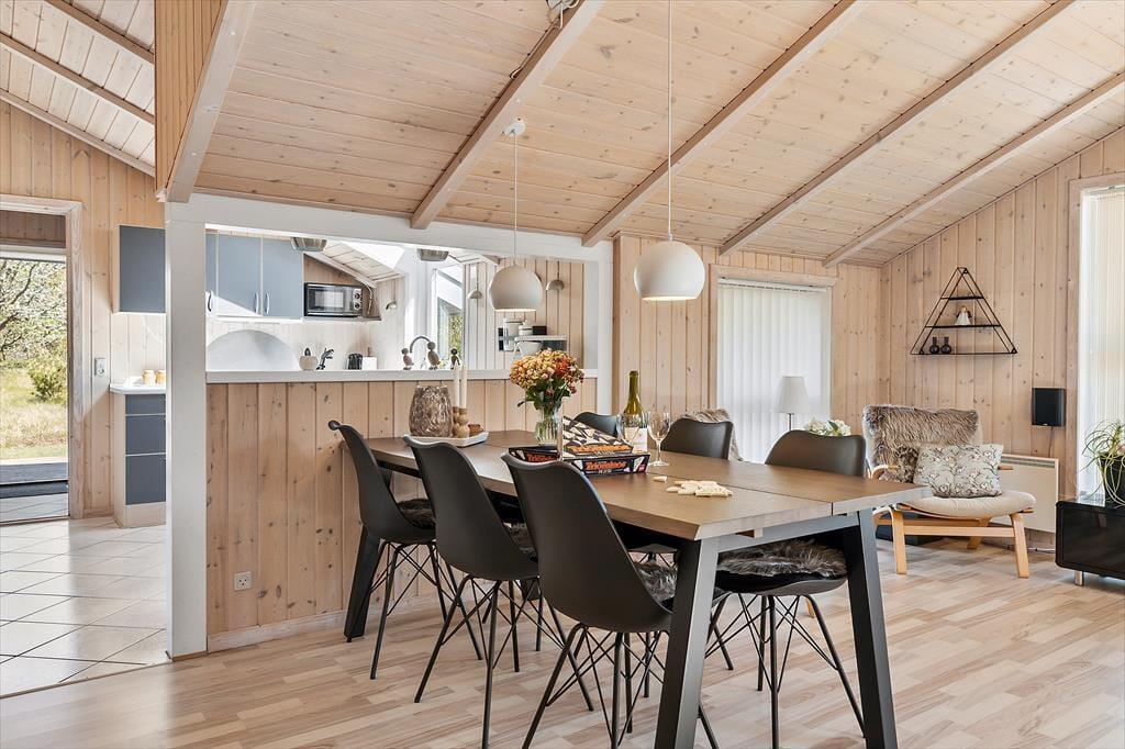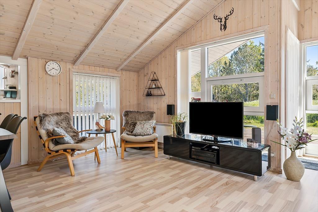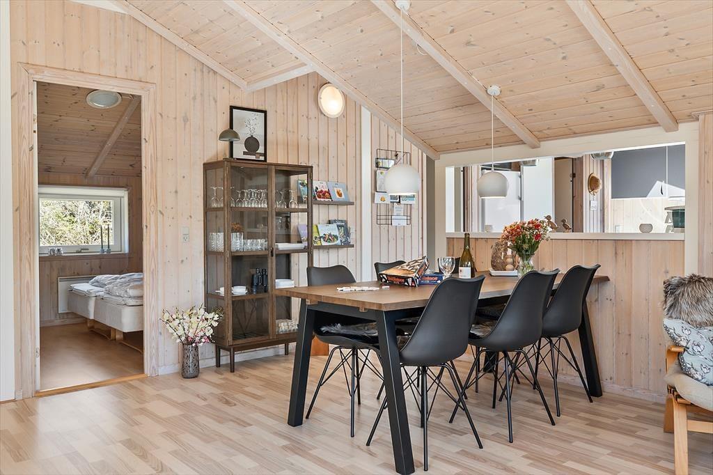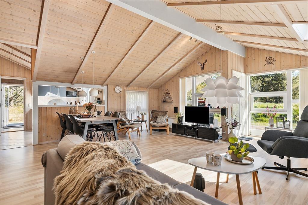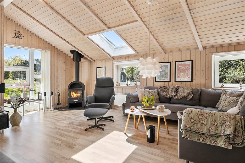 Wenn du das Ferienhaus in der Oksevej 38 betrittst, spürst du sofort, wie sich eine wohlige Ruhe ausbreitet. Das liegt sowohl an der friedlichen Umgebung draußen als auch an der hellen und luftigen Atmosphäre im Inneren. Hohe Decken und große Fensterfronten holen die Natur ins Haus und schaffen ein Gefühl von Weite und Leichtigkeit. Die Einrichtung ist schlicht und warm zugleich – besonders der Wohnbereich lädt dazu ein, einfach die Seele baumeln zu lassen: vielleicht vor dem knisternden Kaminofen, während der Regen sanft gegen die Scheiben trommelt, oder gemütlich auf dem Sofa mit einem Kartenspiel und fröhlichem Gelächter. Das Tageslicht flutet den Raum über viele Stunden hinweg, und die verschiedenen Zonen im Wohnbereich bieten sowohl Platz für gemeinsames Beisammensein als auch ruhige Ecken für Rückzug und Entspannung. Hier kannst du mit deinen Liebsten Urlaub machen – und dich vom ersten Moment an wie zu Hause fühlen.
