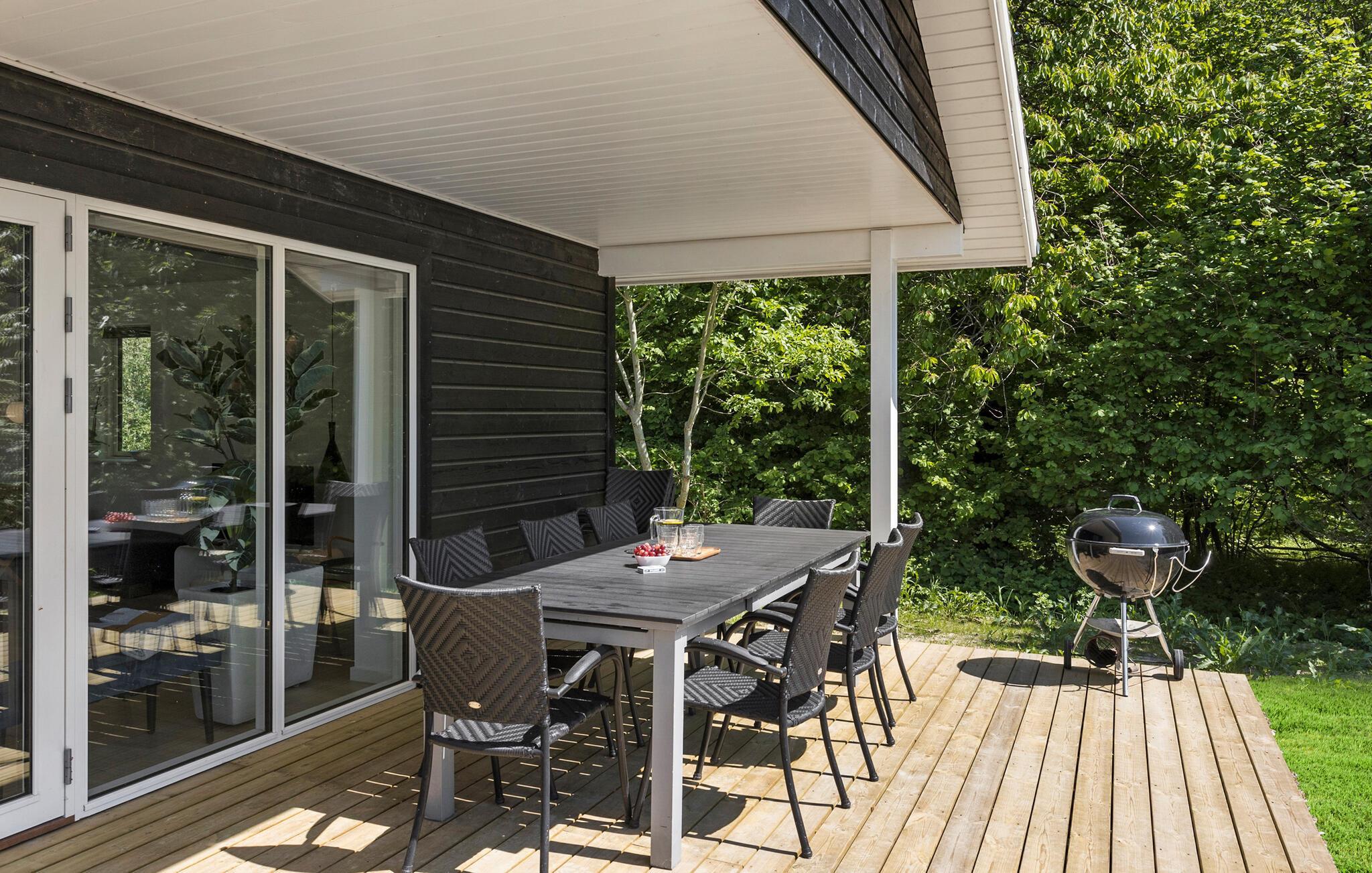 Das moderne Haus liegt auf einem schönen Grundstück mit einer Terrasse und Liegestühlen, auf denen Sie die sonnigen Tage in vollen Zügen genießen können. Zünden Sie abends den Grill an und lassen Sie den Tag mit saftigen Steaks und einem guten Glas Wein in der Abendsonne ausklingen. Genießen Sie dabei auch das idyllische Naturgrundstück mit wilder Vegetation, hohem Gras und schönen Blumen.