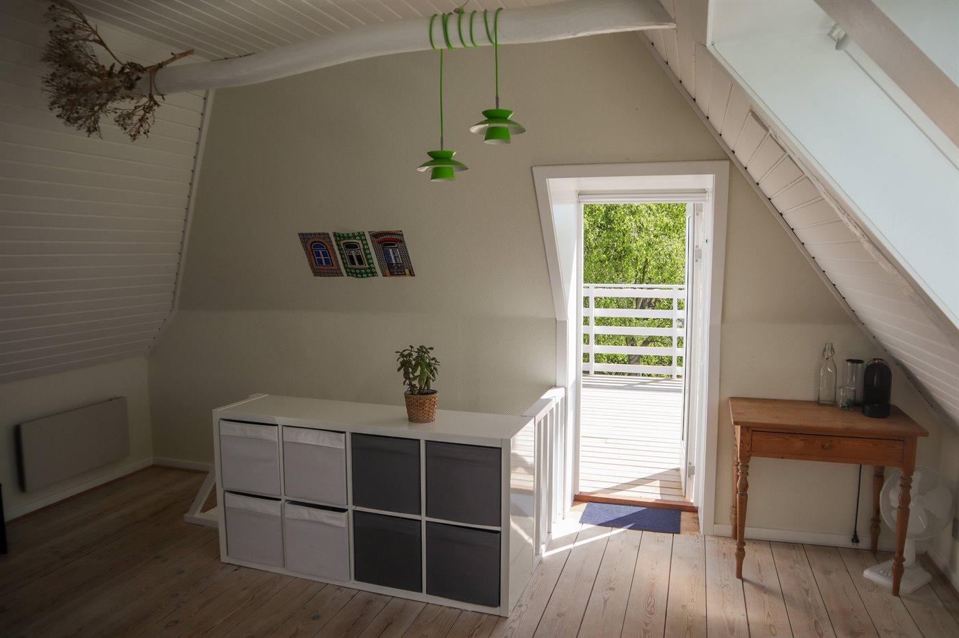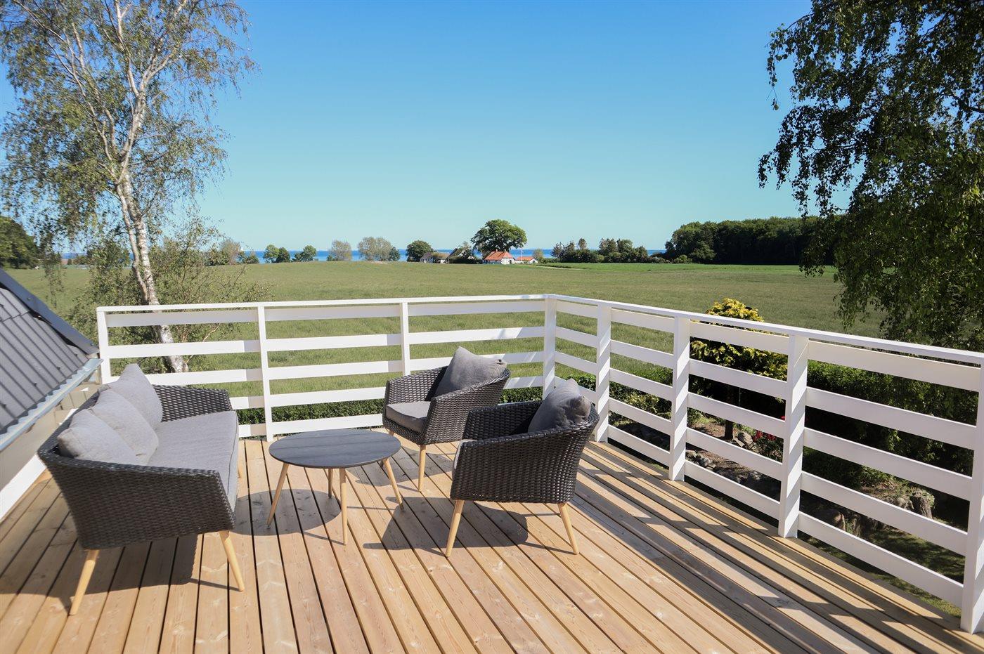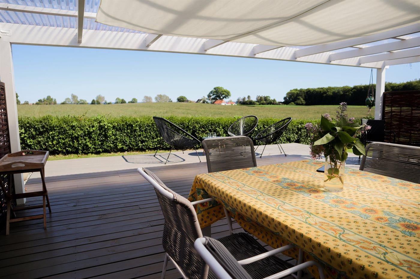 Gemütliches ehemaliges Bauernhaus mit Meerblick, Terrasse und Hobbyraum nahe Rudkøbing, ideal für erholsame Ferien in naturnaher Umgebung.