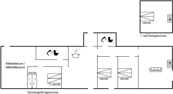 Die Schlafplätze verteilen sich auf 4 Schlafräume. 8 Schlafplätze in Doppelbetten. 2 Schlafplätze auf einer Doppelschlafcouch. Ferner steht ein Kinderbett zur Verfügung.
