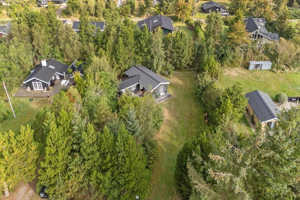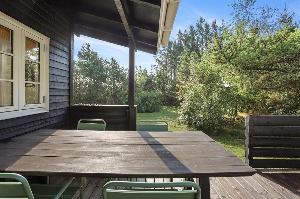 Når du træder ud på den store træterrasse, bliver du mødt af en dejlig fredfyldt atmosfære. Sommerhuset ligger på en ugeneret grund omgivet af grønne træer, hvilket giver en følelse af privatliv og ro. Her kan du starte dagen med morgenkaffe i solen eller nyde en afslappet grillaften i familiens skød, mens du lytter til fuglenes kvidren. Den store græsplæne indbyder til leg og boldspil, og de små kan frit udforske området omkring huset. Med stranden kun 5 minutters gang væk, er det let at tage en forfriskende dukkert i Kattegats klare vand eller bare tage på en rolig gåtur langs kysten og mærke sandet mellem tæerne.