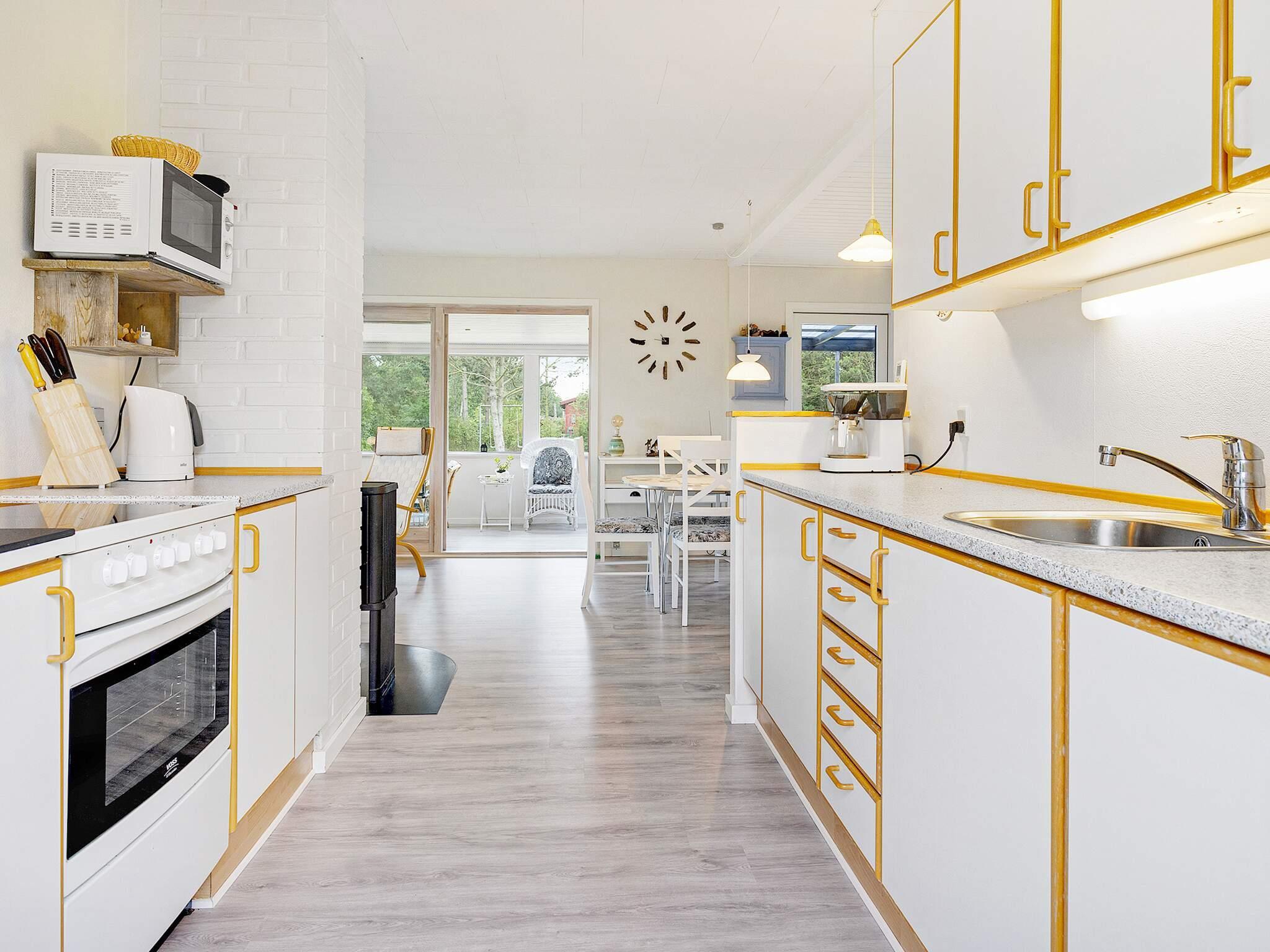 Das Ferienhaus ist gut gepflegt und wohnlich eingerichtet. Die großen Fenster sorgen für viel Tageslicht, der Ofen bei Bedarf für wohlige Wärme. Im Haus drei Schlafzimmer mit jeweils einem Doppelbett sowie ein offener Küchen-/Wohnbereich mit Zugang zu einer teilweise überdachten Terrassenfläche, auf der Sie die Sommertage und -abende genießen können.