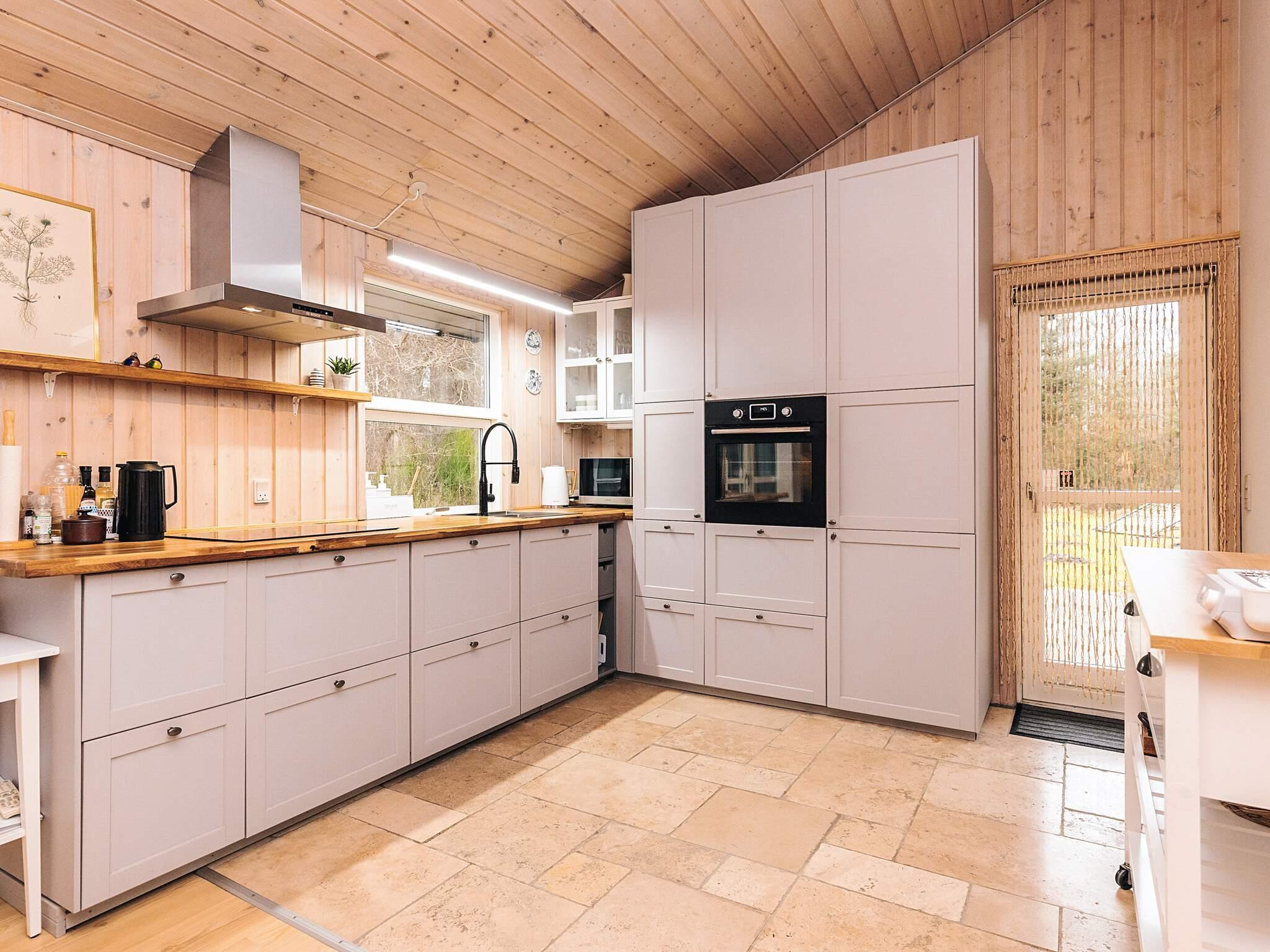 Das Ferienhaus wurde frisch renoviert und verfügt über eine schöne neue Küche im klassischen Landhausstil. Die offene Wohnküche mit Wohnzimmer bildet das Herzstück des Hauses und verfügt über hohe Decken und große Fenster, die viel Licht hereinlassen.