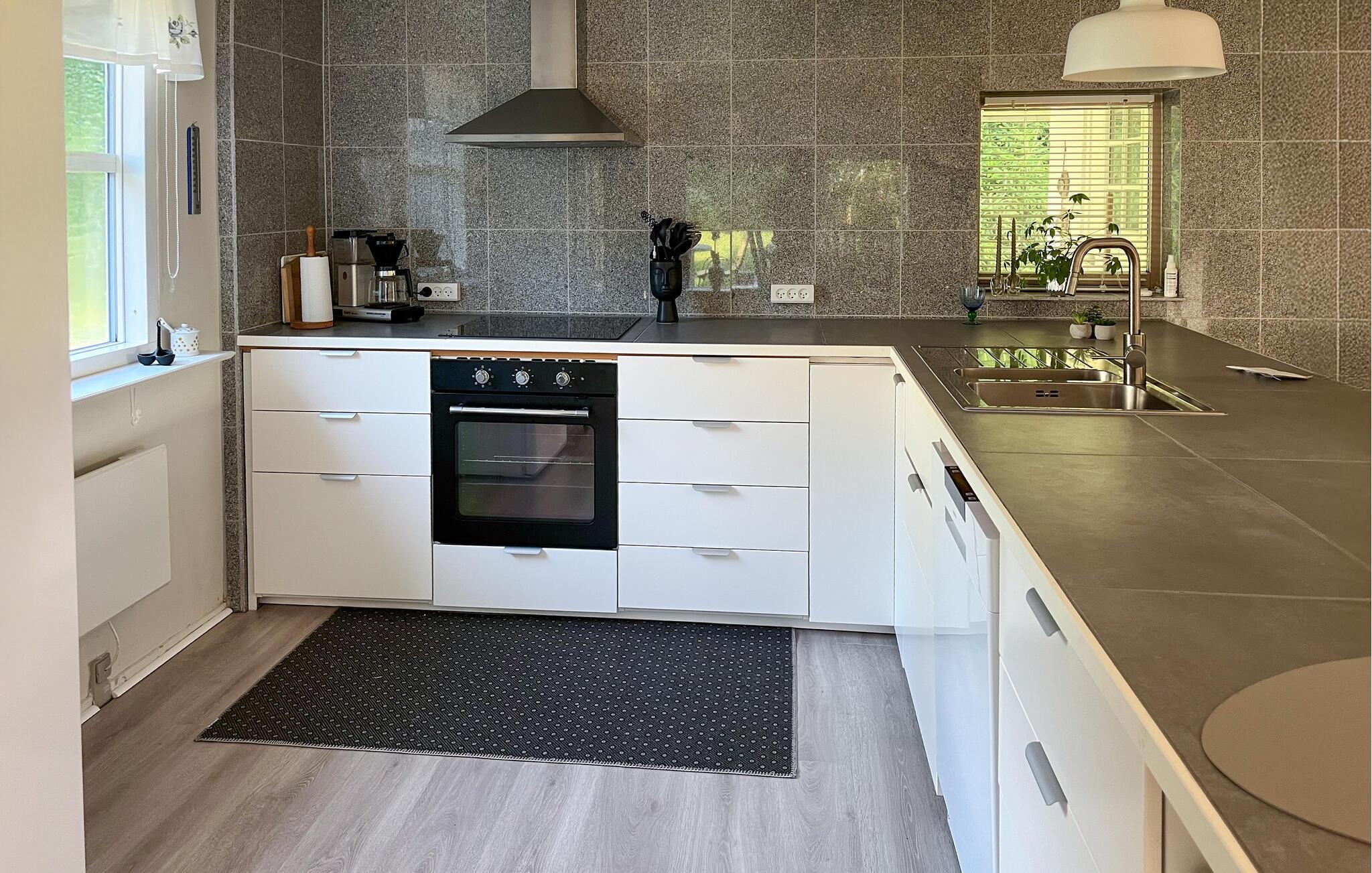 Eingebettet in einen schönen, blickgeschützten Garten und unweit der Küste heißt Sie dieses reizvolle Ferienhaus mit der ganzen Familie willkommen. Lassen Sie sich beim Kochen vom Blick ins Grüne inspirieren und genießen Sie harmonische Mahlzeiten am knisternden Kaminofen. Servieren Sie im hellen Wohnzimmer Kaffee und Kuchen und machen Sie es sich nach einem langen Tag an der frischen Luft auf dem Sofa gemütlich, um einen Film zu streamen oder bei einem Spieleabend zu entspannen.