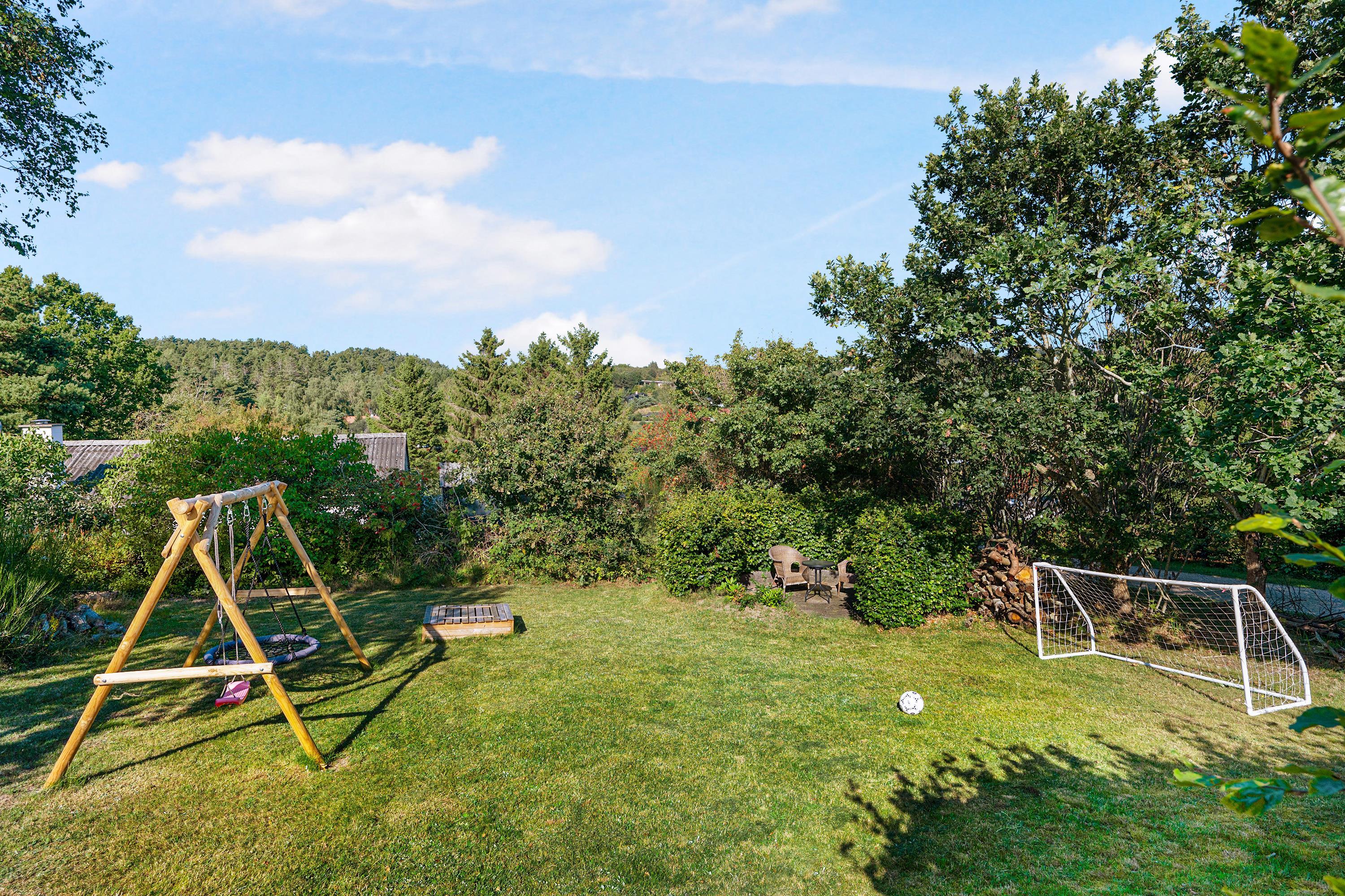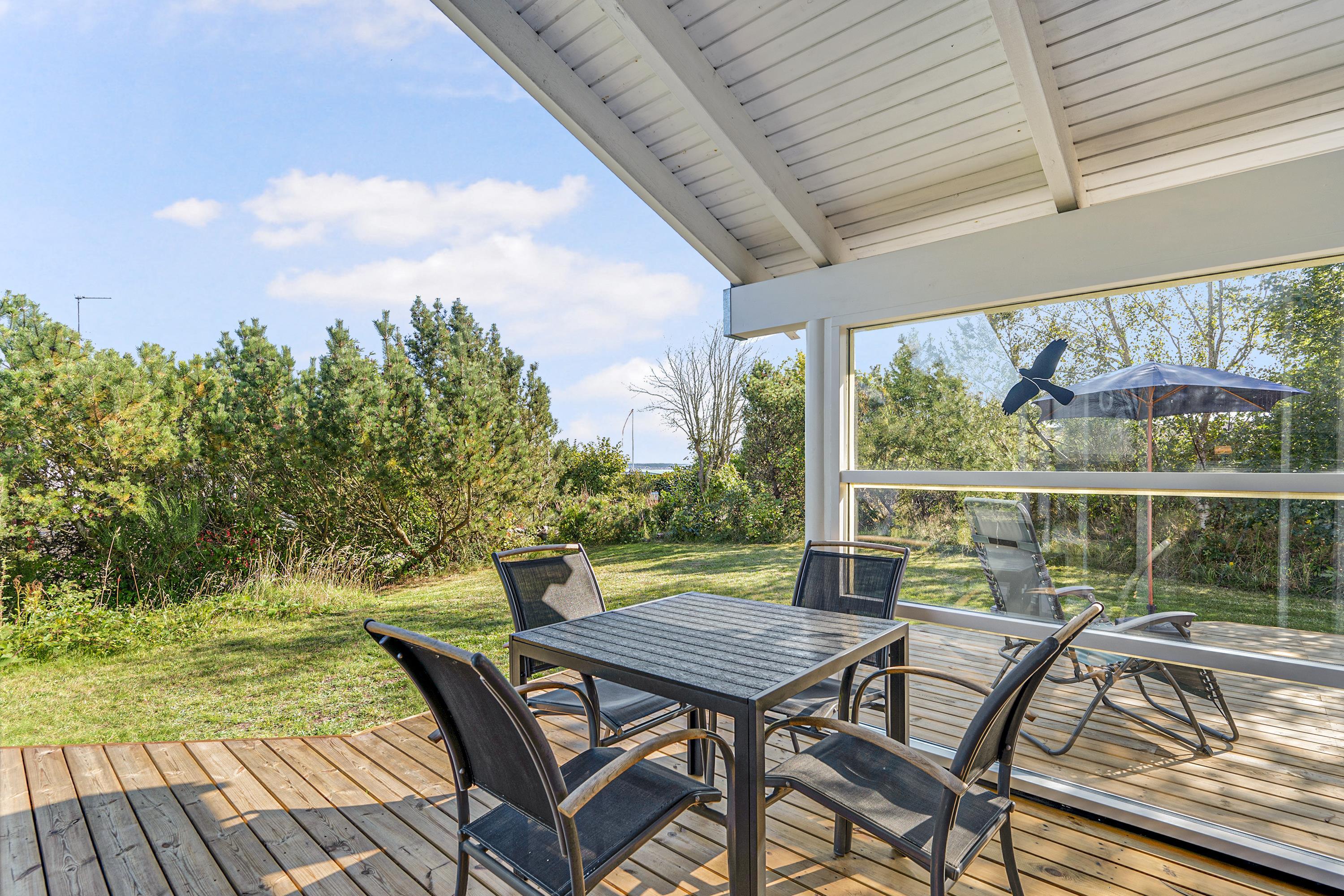 Dieses schöne, helle und gut eingerichtete Ferienhaus liegt hoch auf einem lauschigen Naturgrundstück in den Hügeln am Handrup Strand mit Blick auf die Bucht Ebeltoft Vig. Das Haus ist von einer großen, teilweise überdachten Holzterrasse mit Gartenmöbeln, Liegestühlen, Sonnenschirm und Grill umgeben. Es hat einen Carport und auf dem Grundstück befinden sich eine Schaukel, ein Sandkasten und ein Fußballtor für die Kinder. Die Eigentümergemeinschaft verfügt über ein eigenes Strandgrundstück mit Bouleplatz und Badesteg.