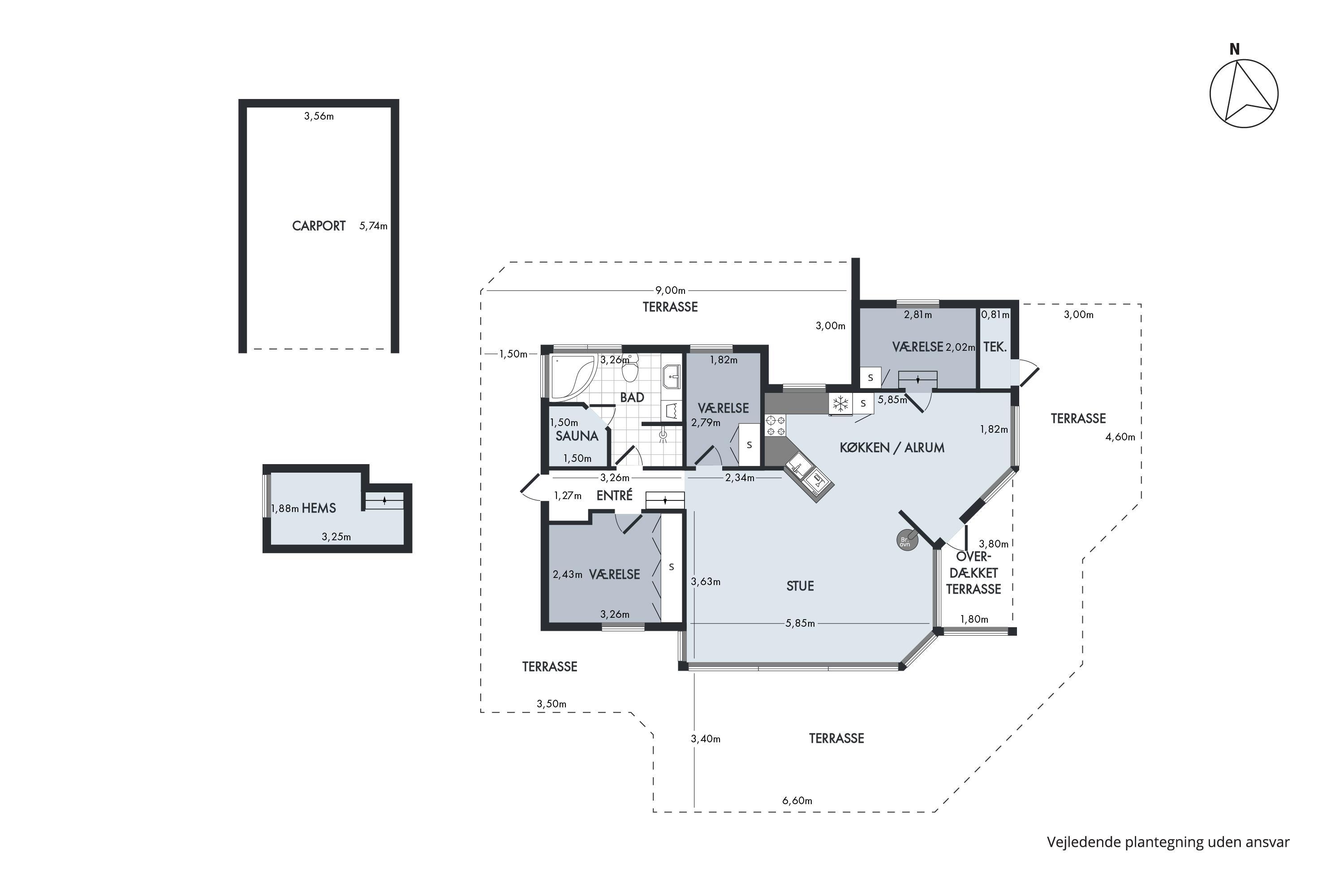 Vom geräumigen Eingangsbereich gelangt man in das große, helle Wohnzimmer mit Panoramafenstern. Es ist mit Essplatz für sechs Personen, schöner Sofaecke, Kaminofen, Fernseher mit dänischen (inkl. TV2) und deutschen Programmen, Chromecast sowie Radio ausgestattet. In offener Verbindung dazu liegt die große, gut ausgestattete Küche mit Glaskeramikherd, Kühl-/Gefrierkombination, Geschirrspüler und Mikrowelle.