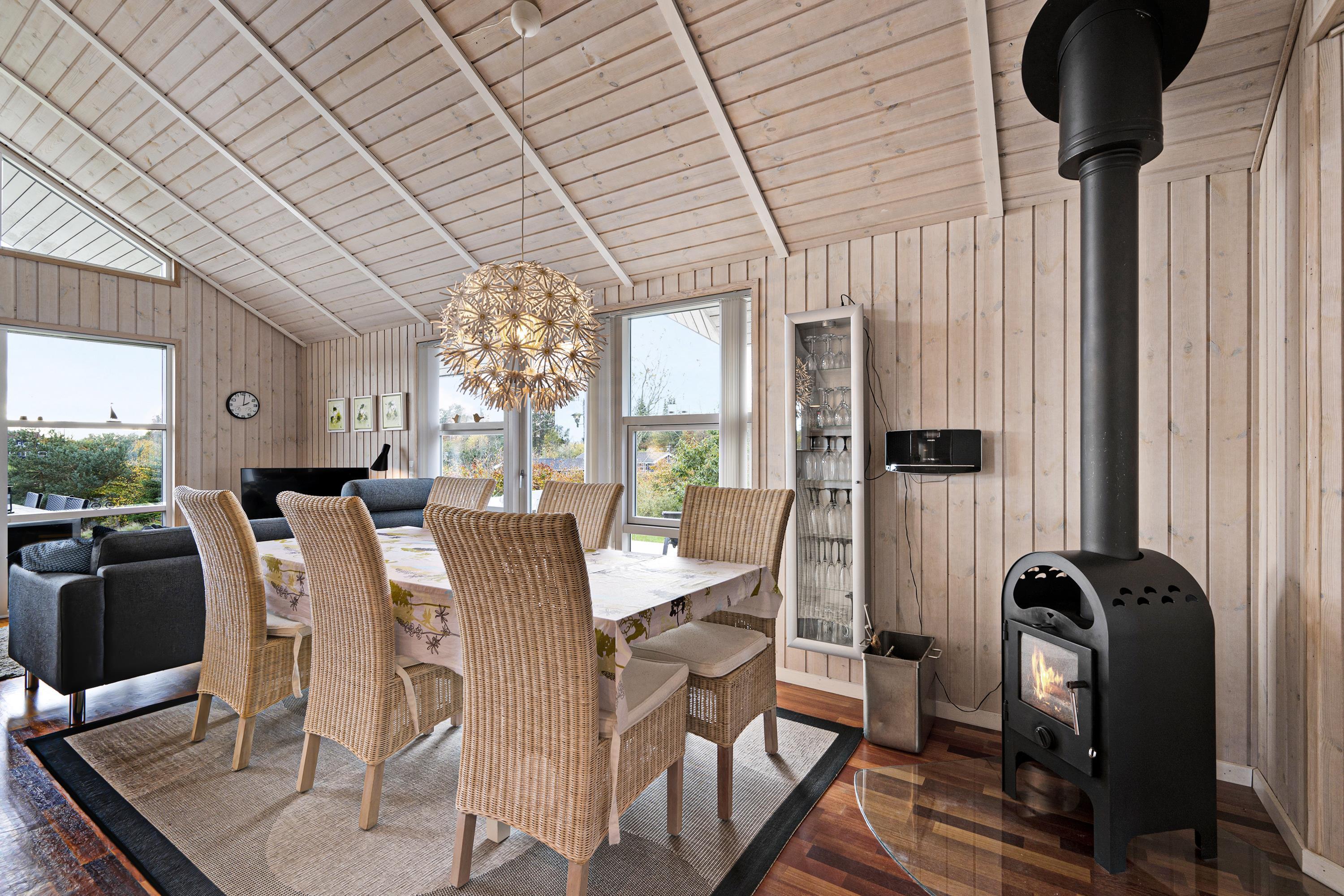 Das helle, zum Dachfirst hin offene Wohnzimmer liegt in offener Verbindung zur Küche und ist mit einem geräumigen Essplatz für 6 Personen, einem bequemen Sofabereich, Kaminofen, Smart-TV mit dänischen Programmen (inkl. TV2) und einem deutschen Programm, CD-Player und Radio ausgestattet. Schicke, gut eingerichtete und moderne Küche mit Glaskeramik-Kochfeld, Einbaubackofen, Kühl-/Gefrierkombination, Geschirrspüler und Mikrowelle. Schönes Badezimmer mit Dusche, Fußbodenheizung und Waschmaschine. Die insgesamt sechs Schlafplätze verteilen sich auf drei gute und helle Schlafzimmer, zwei mit Doppelbett und eines mit Etagenbett. Außerdem besteht vom Wohnzimmer aus Zugang zu einem schönen Hängeboden mit zwei Einzelbetten. Internetzugang.