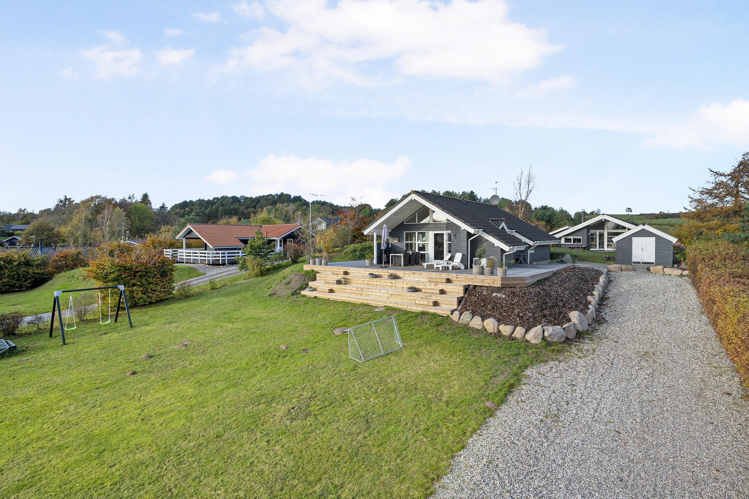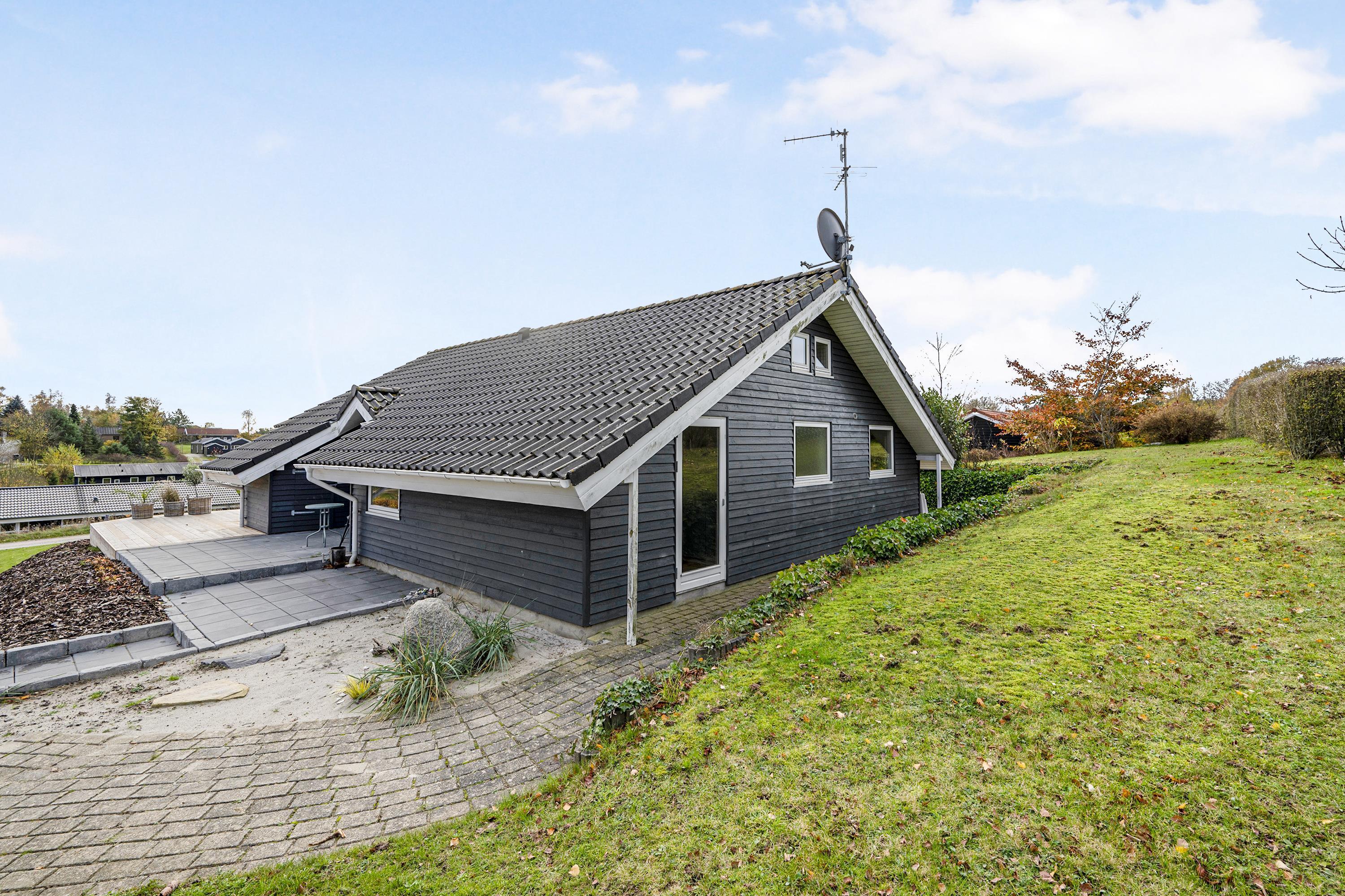 Dieses schöne Ferienhaus liegt hoch auf einem offenen Naturgrundstück in den Hügeln am Lyngsbæk Strand. Schöne, große und teilweise überdachte Holzterrasse mit guten Gartenmöbeln, Liegestühlen, Sonnenschirm und Grill, wo man die Sonne genießen kann. Auf dem Grundstück befinden sich ein Sandkasten, Schaukeln und ein Fußballtor.
