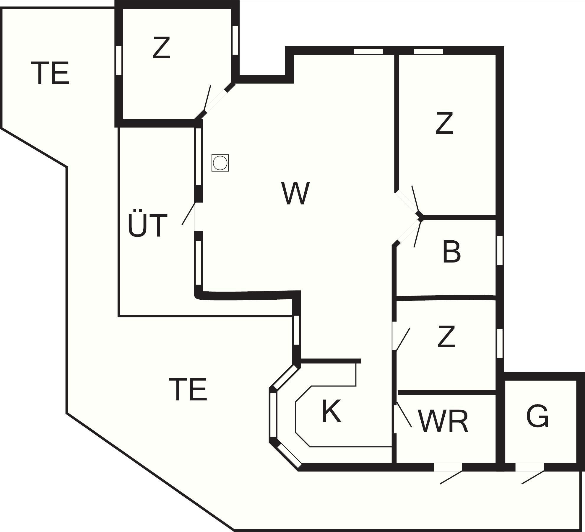Off. Küche: E-Herd, Kühlschr. m. Gefrierfach, Mikrow., Abzugsh., Kaffeem., Spülm., Waschm.
