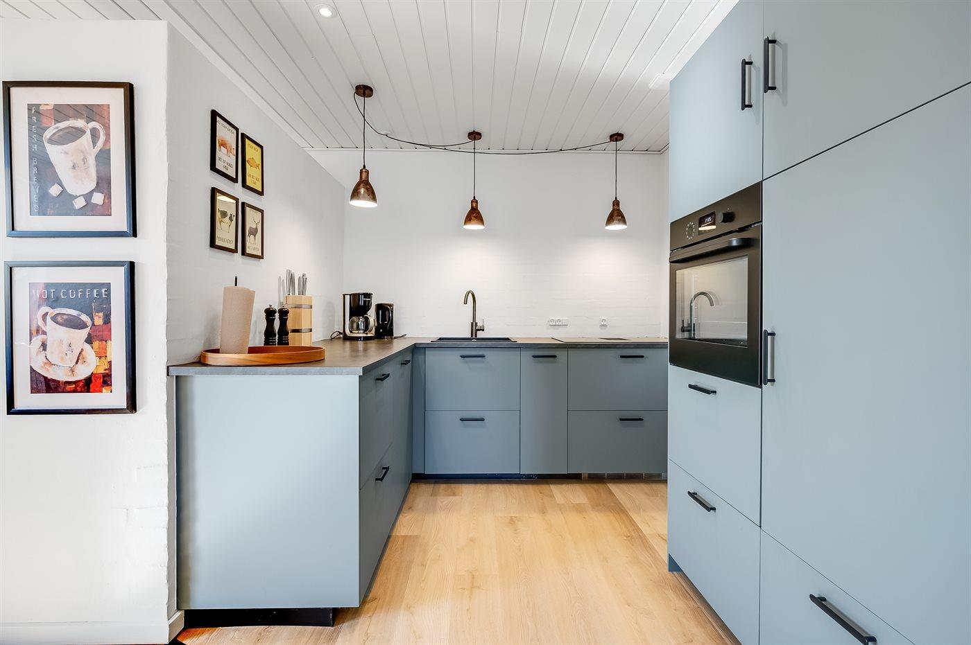 Die Küche ist mit Kühlschrank ausgestattet. Außerdem gibt es 4 Induktions-Kochzonen, Umluftofen sowie Geschirrspüler.