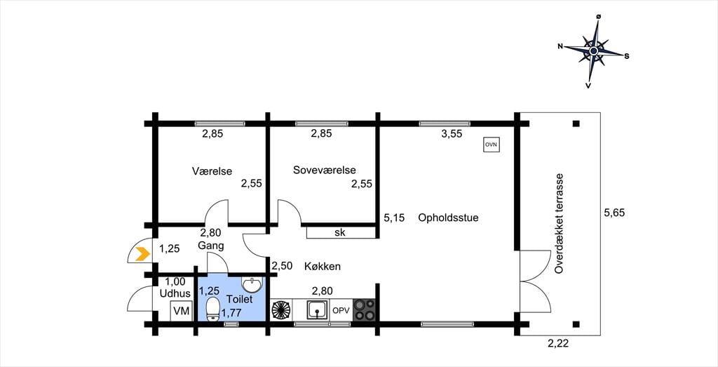 Herzstück des Hauses ist der Wohnraum, der über einen Kaminofen und einen Zugang zur überdachten Terrasse verfügt. Neben dem Kaminofen befindet sich eine Polstersitzgruppe, in der Sie es sich gemütlich machen und fernsehen können. WiFi ist ebenfalls vorhanden. Gegenüber der gemütlichen Ecke befindet sich der Esstisch - auf den dank der Sprossenfenster viel Tageslicht fällt. Der Esstisch ist neben der Küche platziert, Teil des Wohnraums und dennoch angenehm separat. Die weiße Küche, die sowohl durch das Fenster über dem Küchentisch als auch vom Wohnzimmer aus Tageslicht bekommt, bietet gute Arbeitsbedingungen und Stauraum. Sie beinhaltet unter anderem einen Herd, einen Backofen, einen Geschirrspüler und einen Kühl- und Gefrierschrank.