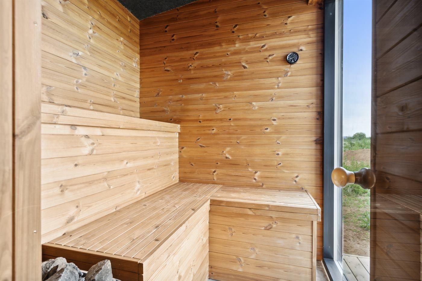 Auf der schönen großen Terrasse kann man die Aussicht auch aus dem großen Whirlpool genießen, der Platz für die gesamte Familie bietet. Auch ein toller Saunaraum mit einer großen Fensterfront und Blick aufs Wasser ist vorhanden.