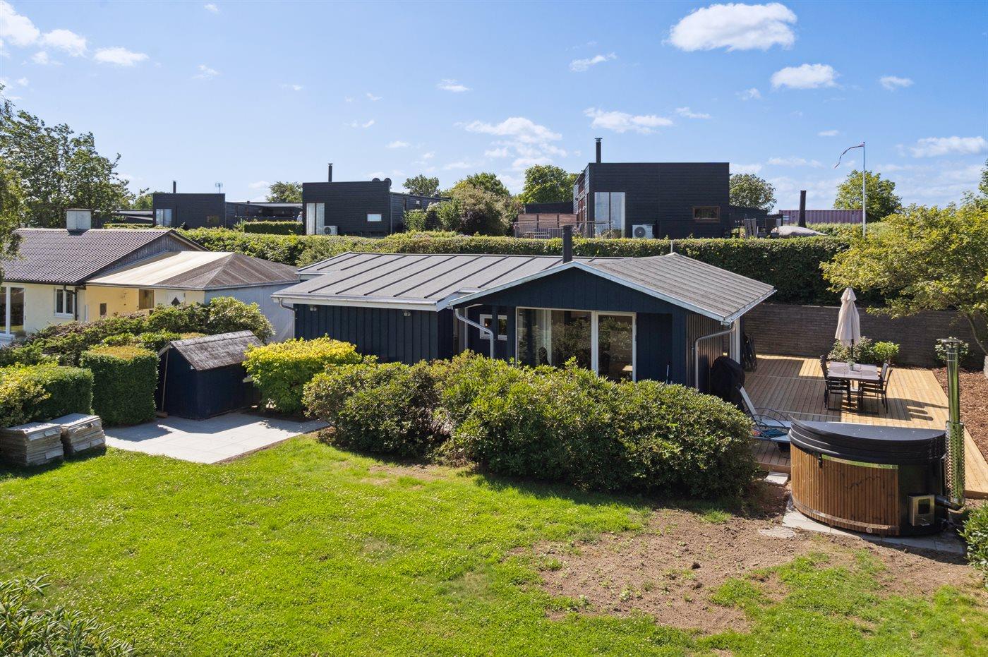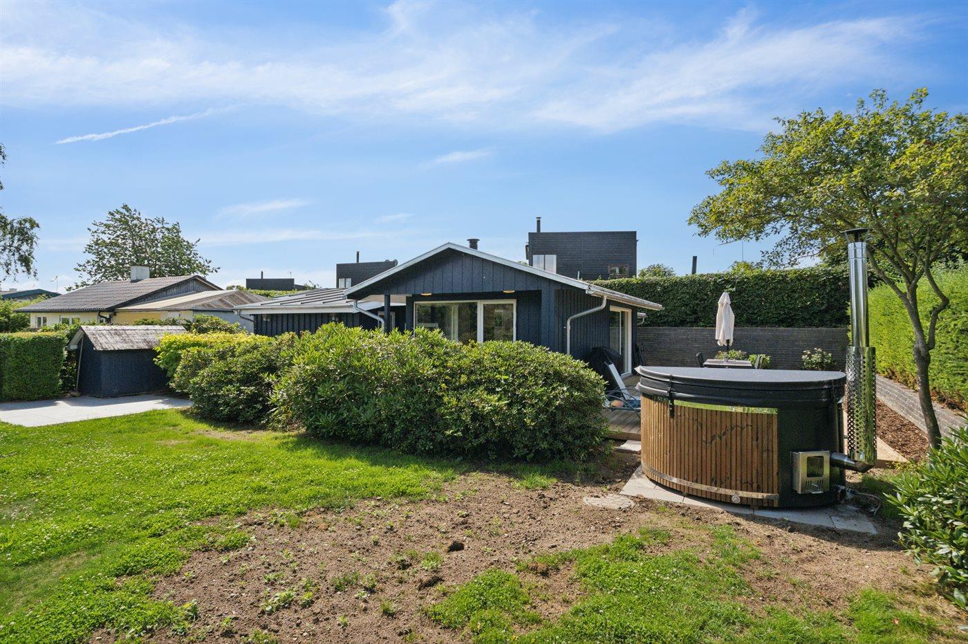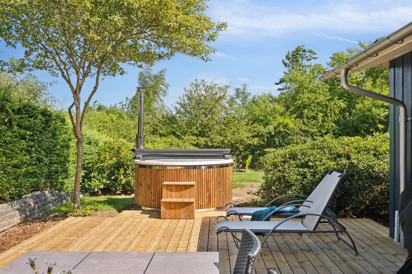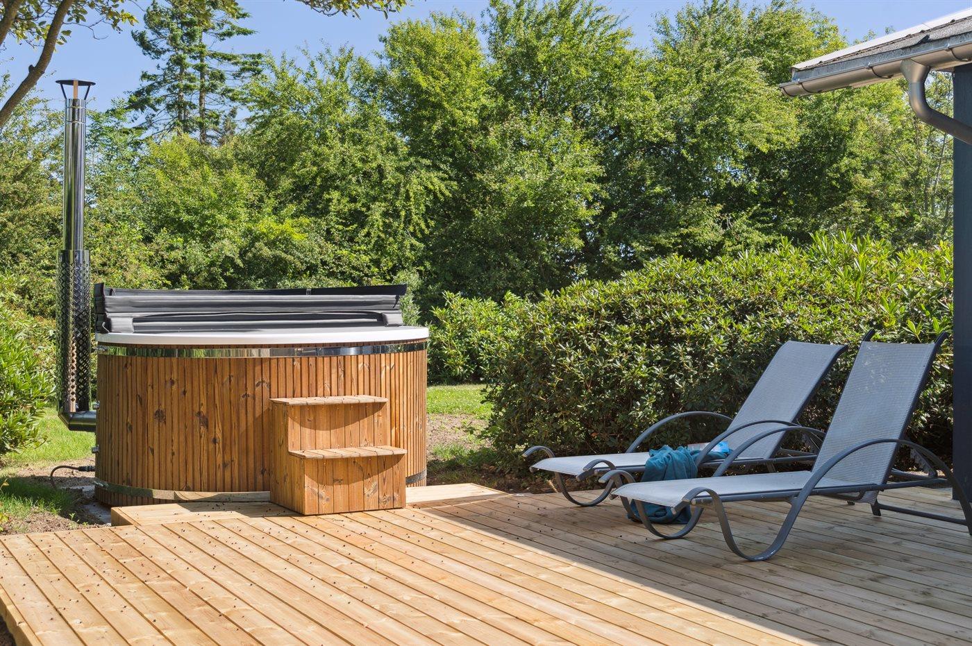 Dieses komplett renovierte Ferienhaus in Mørkholt bietet Natur, Meerblick und Entspannung mit Hot Tub und Sauna.