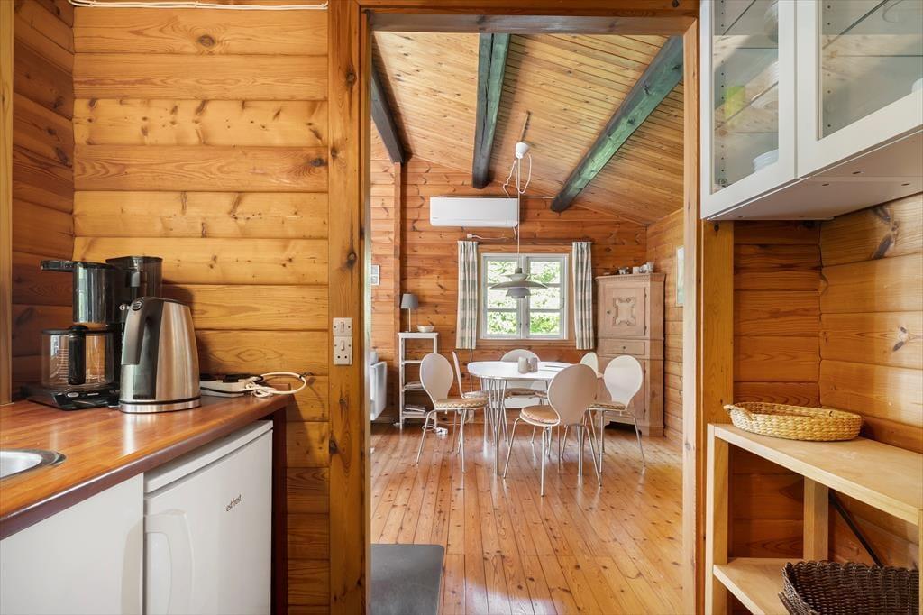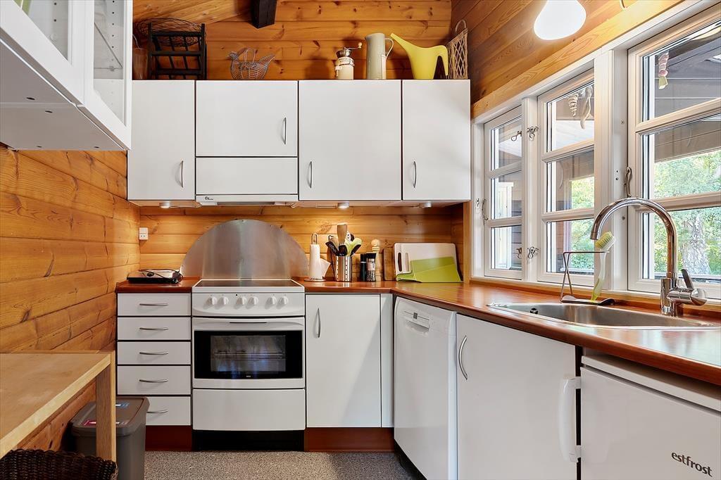 Køkkenet er fuldt udstyret med blandt andet opvaskemaskine, mikroovn, fryser og kaffemaskine – alt, hvad du har brug for til at tilberede feriens måltider nemt og bekvemt.