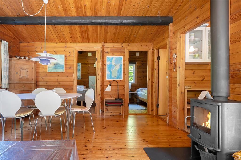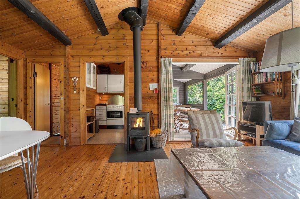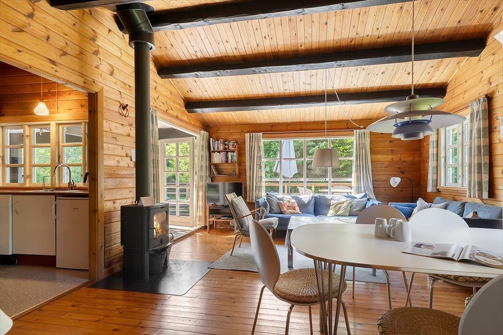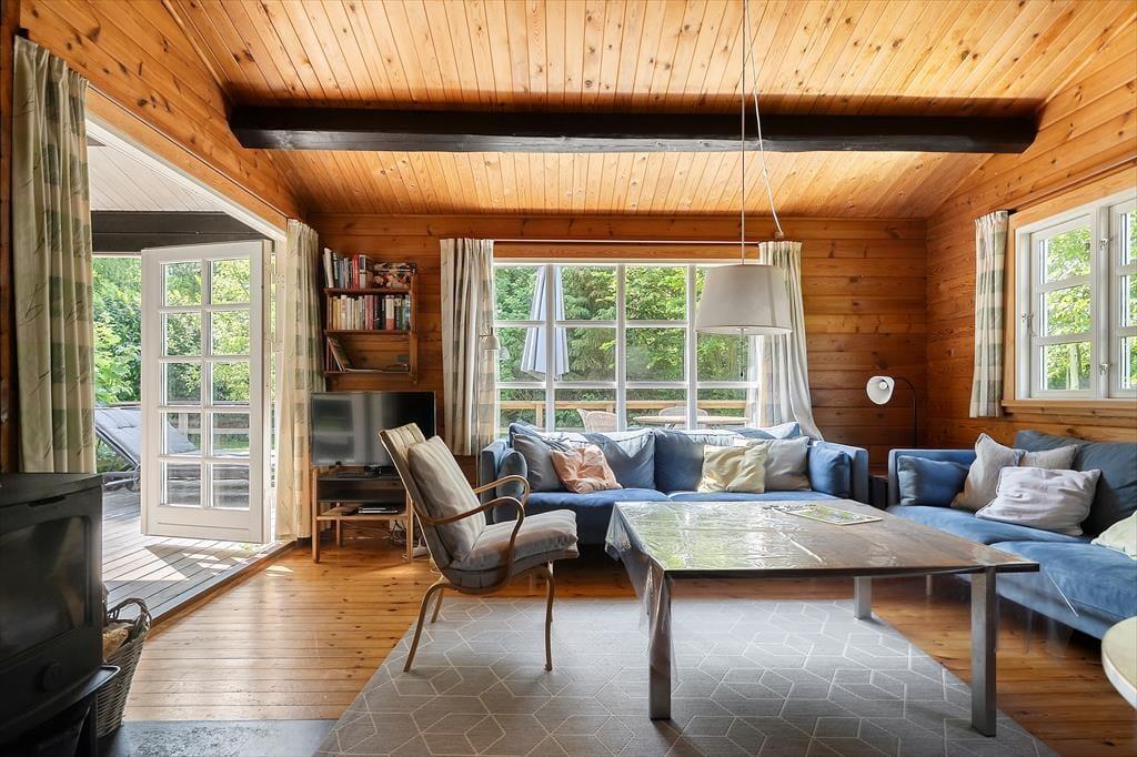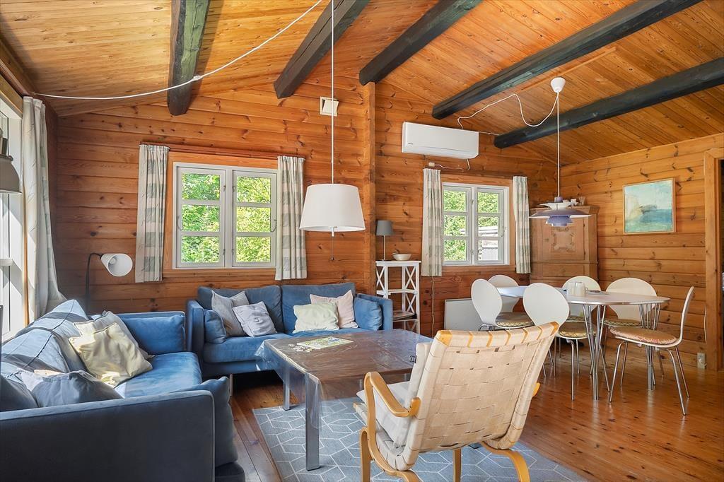 Stuen ligger i åben forbindelse med køkkenet og spiseområdet, hvor der er plads til seks personer omkring spisebordet – perfekt til hyggelige feriemåltider og samvær.