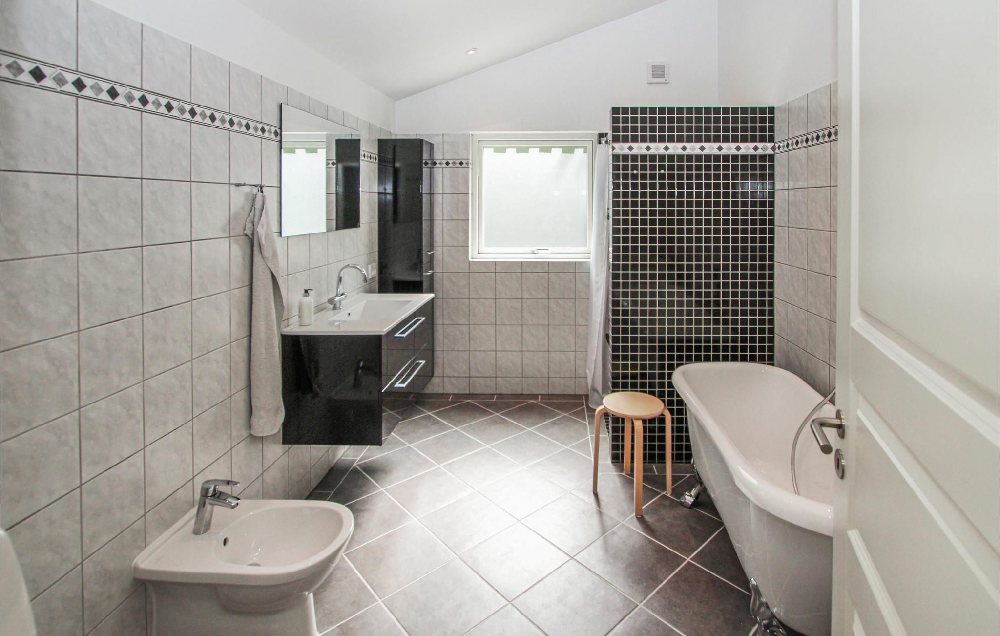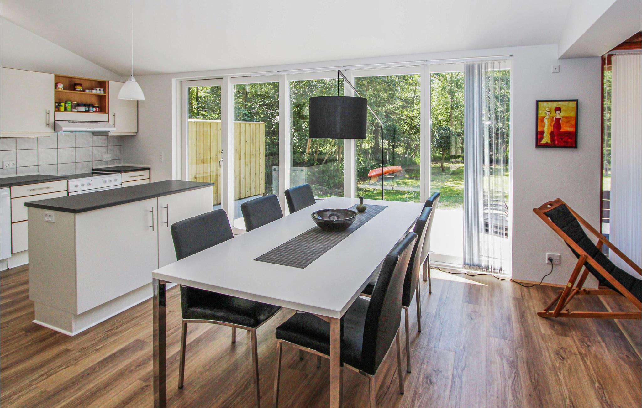 Pittoresk umgeben von hohen Bäumen begrüßt das Ferienhaus Sie nur wenige Schritte von einem guten Badestrand entfernt. Die hellen Räume sind stilvoll möbliert, geschickt platzierte Holzelemente verleihen der Einrichtung eine ansprechende Wärme. In diesem schönen Rahmen können Sie so richtig entspannen. Nehmen Sie im Wohnbereich in den bequemen Möbeln Platz, die großflächige Fensterfront bietet Ihnen einen herrlichen Blick auf das Grün der Umgebung und lässt gleichzeitig viel Licht ins Haus. Erfreuen Sie Ihre Mitreisenden mit einem leckeren, selbstgekochten Abendessen oder lustigen Ideen für einen gemeinsamen Spieleabend, der am Kaminofen stattfinden kann.