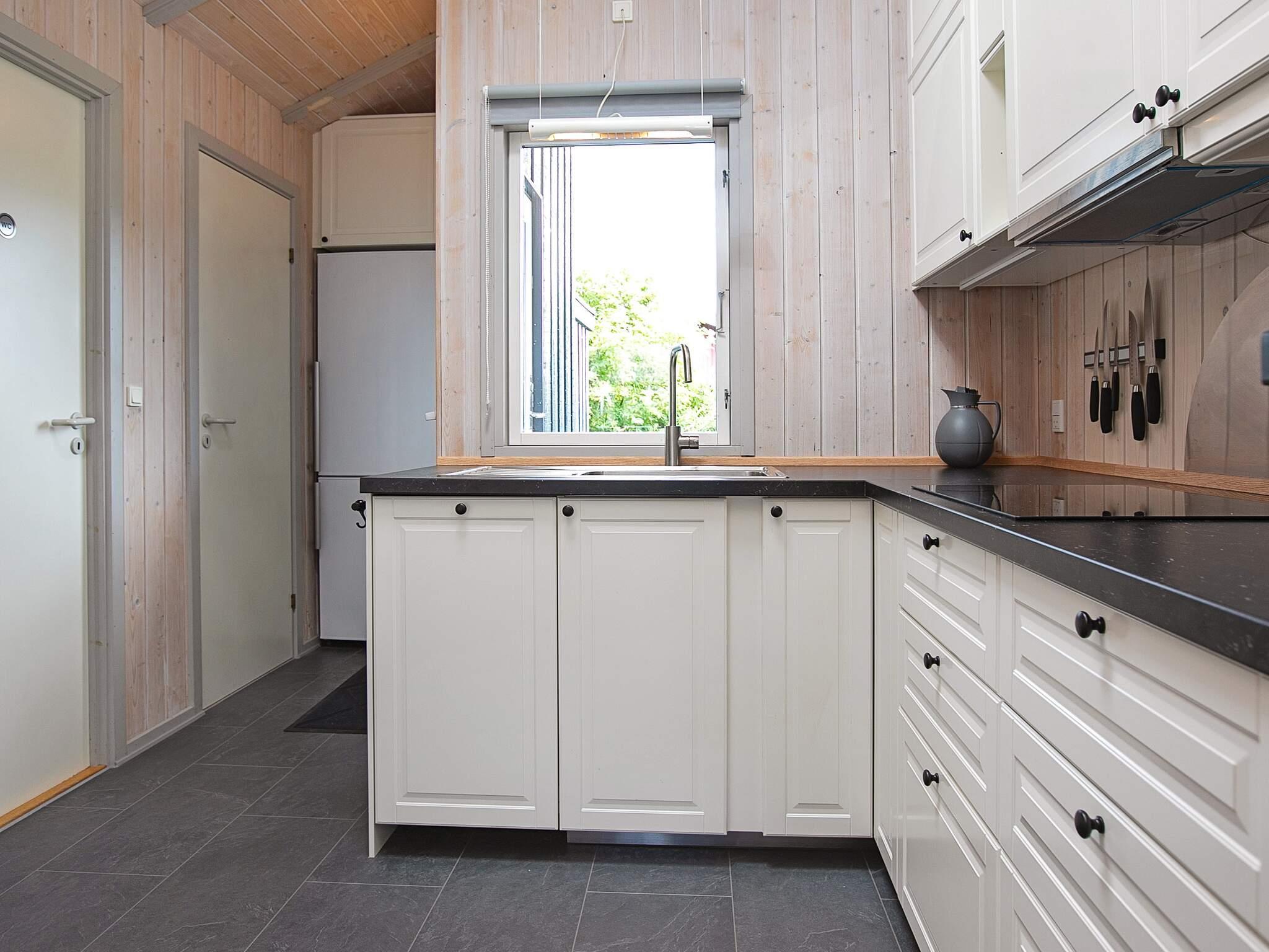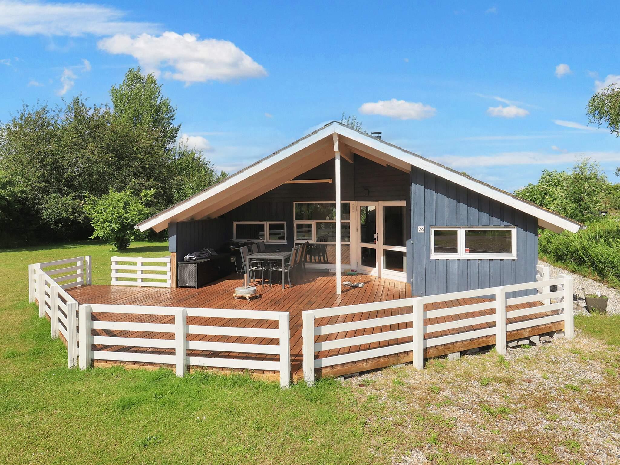 Im Ferienhaus steht ein offener Küchen-/Wohnbereich mit Zugang nach draußen bereit. Dort findet man eine geschützte, teilweise überdachte Holzterrasse für Sommertage und Grillabende vor.